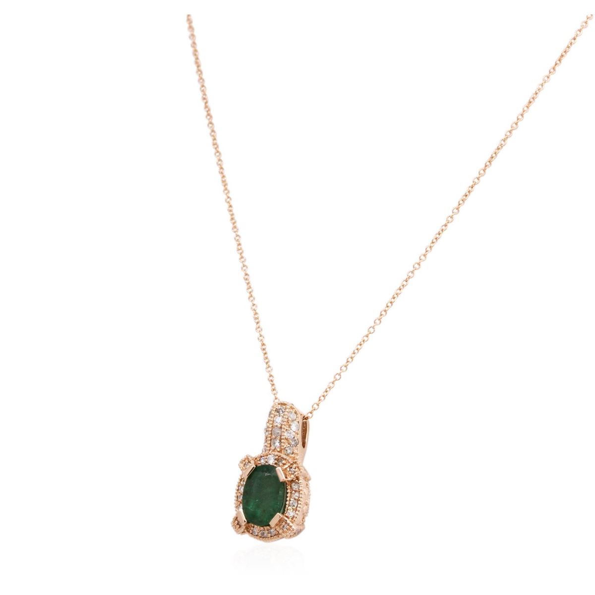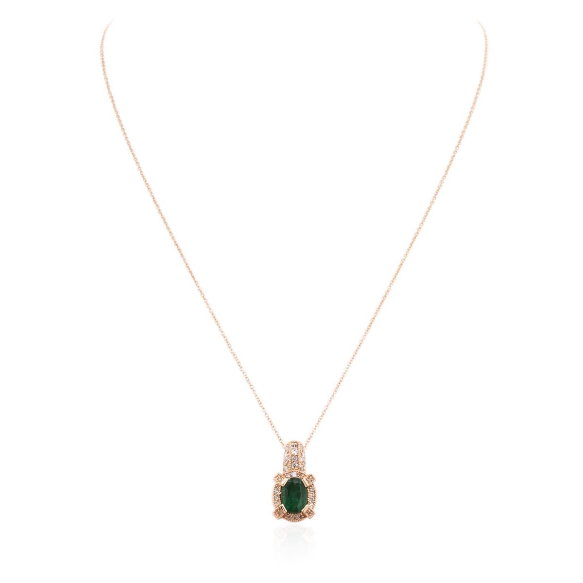 One pendant with chain featuring: 14KT rose gold weighing 4.06 grams containing one emerald with a total weight of 1.83ct and round diamonds with a total weight of 0.40cts.