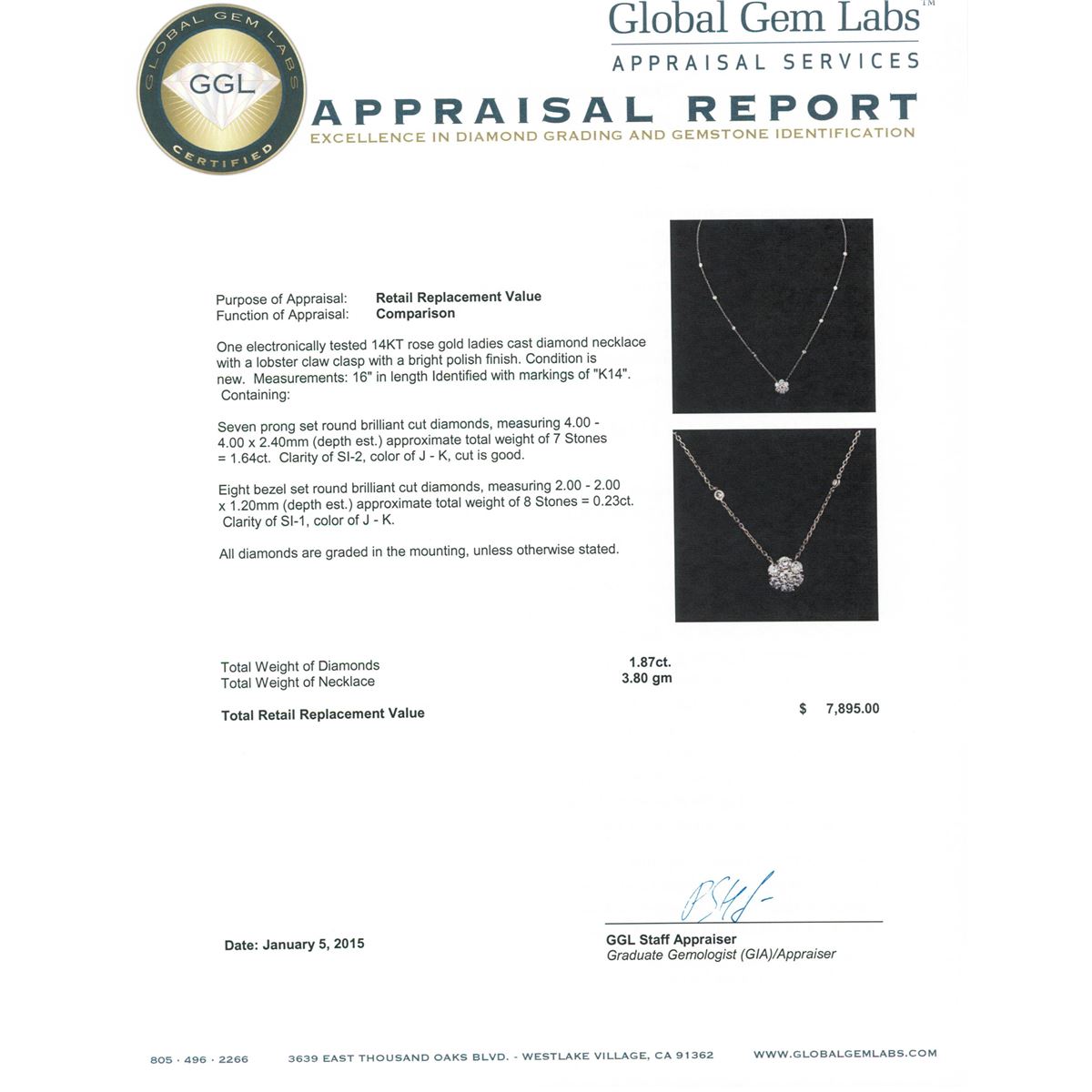 One electronically tested 14KT rose gold ladies cast diamond necklace with a lobster claw clasp with a bright polish finish. Measurements: 16" in length Identified with markings of "K14". Condition is new. Containing: Seven prong set round brilliant cut diamonds, measuring 4.00 - 4.00 x 2.40mm (depth est.) approximate total weight of 7 Stones = 1.64ct. Clarity: SI-2. Color: J - K, Cut is Good. Eight bezel set round brilliant cut diamonds, measuring 2.00 - 2.00 x 1.20mm (depth est.) approximate total weight of 8 Stones = 0.23ct. Clarity: SI-1. Color: J - K. All diamonds are graded in the mounting, unless otherwise stated. Total Weight of Diamonds 1.87ct. Total Weight of Necklace 3.80 grams. GGL Appraised at $7,895.00.