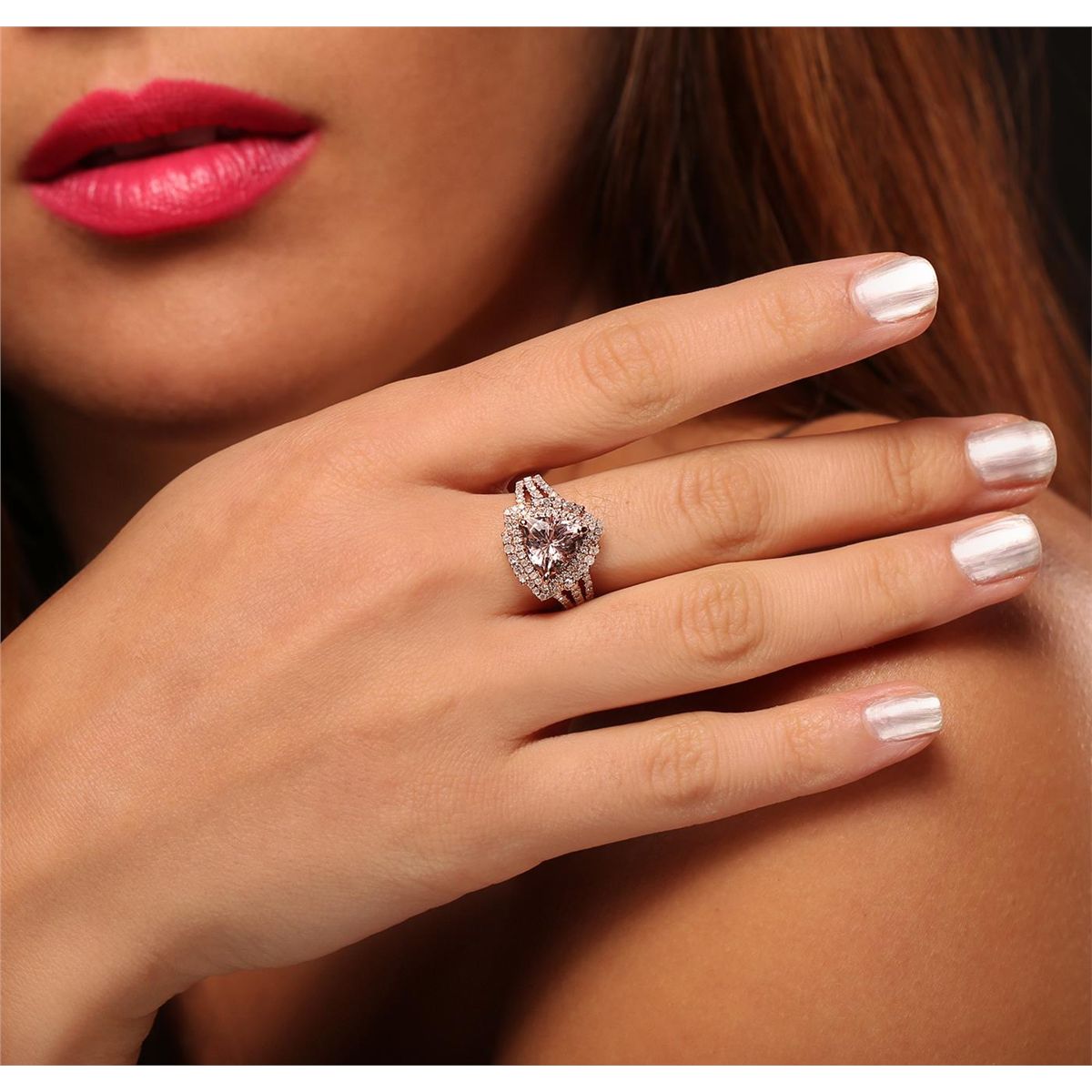 One electronically tested 14KT rose gold Ladies combination cast & assembled ring with a bright polish finish. Condition is new. Identified with markings of "14K". Containing: Fifty-Three prong set single cut diamonds, measuring 1.30 - 1.30 x 0.78mm (depth est.) approximate. Total Weight of 53 Stones = 0.52ct. Clarity: I-1 to I-2. Color: H - I, Cut is Good. Forty-Three prong set single cut diamonds, measuring 0.90 - 0.90 x 0.54mm (depth est.) approximate. Total Weight of 43 Stones = 0.20ct. Clarity: I-1 to I-2. Color: H - I, Cut is Good. One prong set triangle modified brilliant cut natural morganite, measuring 8.50 x 8.50 x 5.53mm, approximate weight of 1.93ct., clarity is eye clean, type I, light, slightly brownish, red orange color, (GIA RO 3/2), cut is very good. Colored gemstones are presumed to have been subjected to commonly used color/clarity enhancement processes. Total Weight of Colored Stones 1.93ct. Total Weight of Diamonds 0.72ct. Total Weight of Ring 5.00 grams. GGL Appraised at $6,735.00.