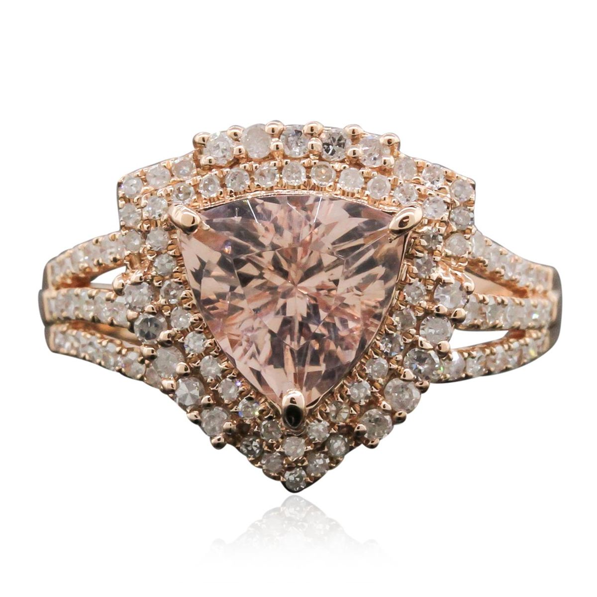 One electronically tested 14KT rose gold Ladies combination cast & assembled ring with a bright polish finish. Condition is new. Identified with markings of "14K". Containing: Fifty-Three prong set single cut diamonds, measuring 1.30 - 1.30 x 0.78mm (depth est.) approximate. Total Weight of 53 Stones = 0.52ct. Clarity: I-1 to I-2. Color: H - I, Cut is Good. Forty-Three prong set single cut diamonds, measuring 0.90 - 0.90 x 0.54mm (depth est.) approximate. Total Weight of 43 Stones = 0.20ct. Clarity: I-1 to I-2. Color: H - I, Cut is Good. One prong set triangle modified brilliant cut natural morganite, measuring 8.50 x 8.50 x 5.53mm, approximate weight of 1.93ct., clarity is eye clean, type I, light, slightly brownish, red orange color, (GIA RO 3/2), cut is very good. Colored gemstones are presumed to have been subjected to commonly used color/clarity enhancement processes. Total Weight of Colored Stones 1.93ct. Total Weight of Diamonds 0.72ct. Total Weight of Ring 5.00 grams. GGL Appraised at $6,735.00.