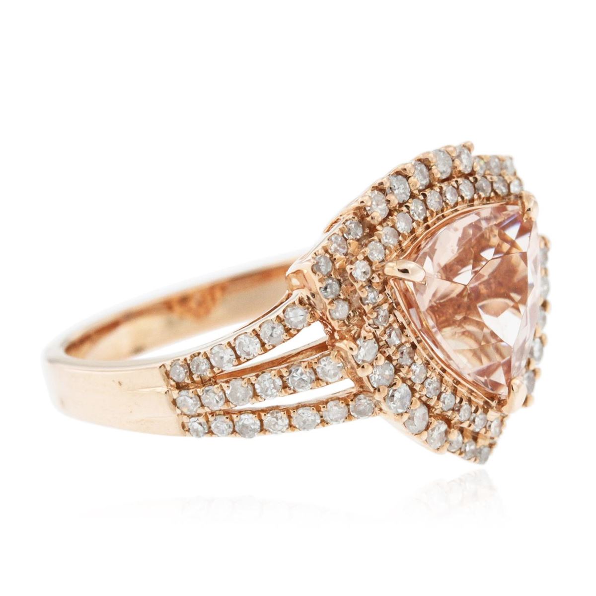 One electronically tested 14KT rose gold Ladies combination cast & assembled ring with a bright polish finish. Condition is new. Identified with markings of "14K". Containing: Fifty-Three prong set single cut diamonds, measuring 1.30 - 1.30 x 0.78mm (depth est.) approximate. Total Weight of 53 Stones = 0.52ct. Clarity: I-1 to I-2. Color: H - I, Cut is Good. Forty-Three prong set single cut diamonds, measuring 0.90 - 0.90 x 0.54mm (depth est.) approximate. Total Weight of 43 Stones = 0.20ct. Clarity: I-1 to I-2. Color: H - I, Cut is Good. One prong set triangle modified brilliant cut natural morganite, measuring 8.50 x 8.50 x 5.53mm, approximate weight of 1.93ct., clarity is eye clean, type I, light, slightly brownish, red orange color, (GIA RO 3/2), cut is very good. Colored gemstones are presumed to have been subjected to commonly used color/clarity enhancement processes. Total Weight of Colored Stones 1.93ct. Total Weight of Diamonds 0.72ct. Total Weight of Ring 5.00 grams. GGL Appraised at $6,735.00.