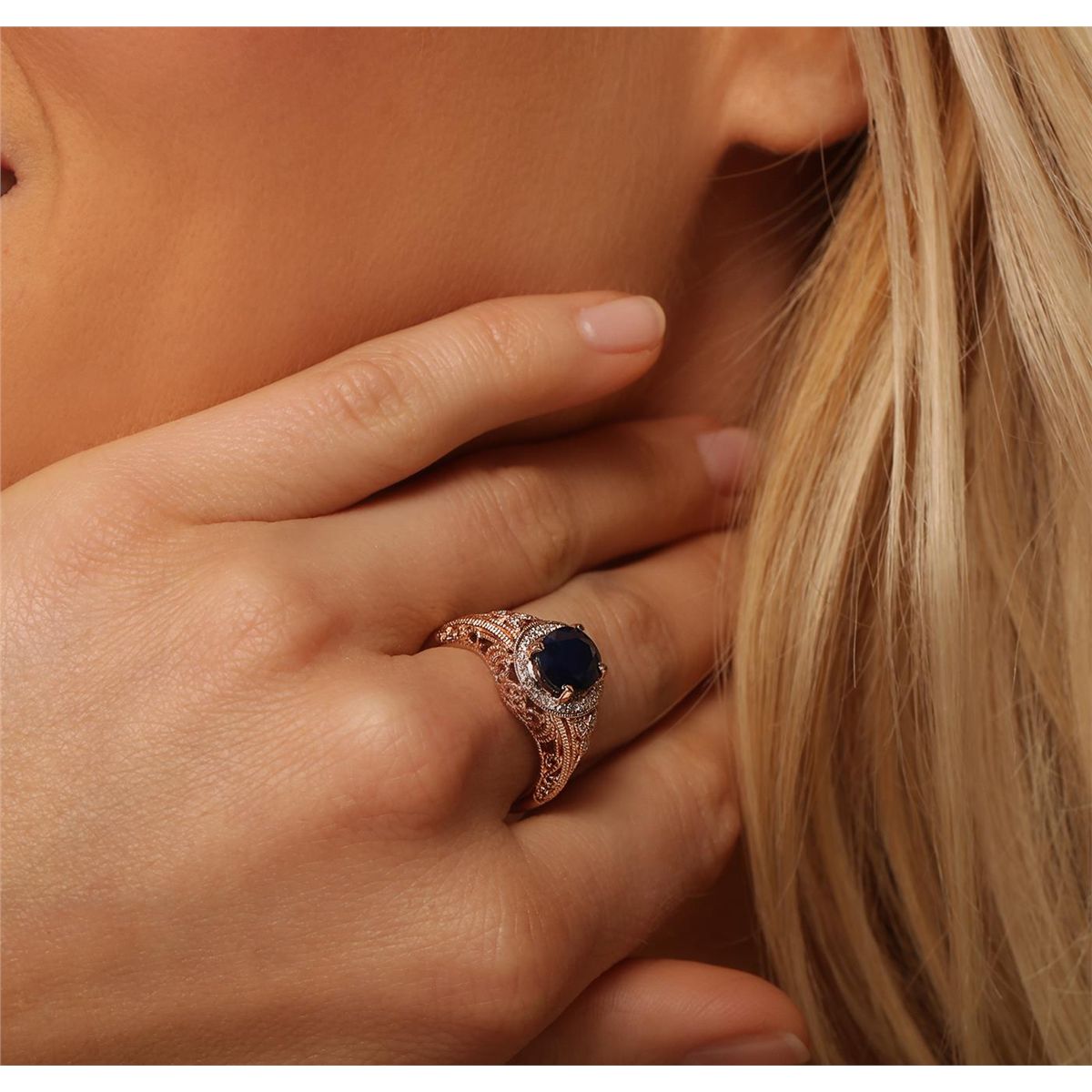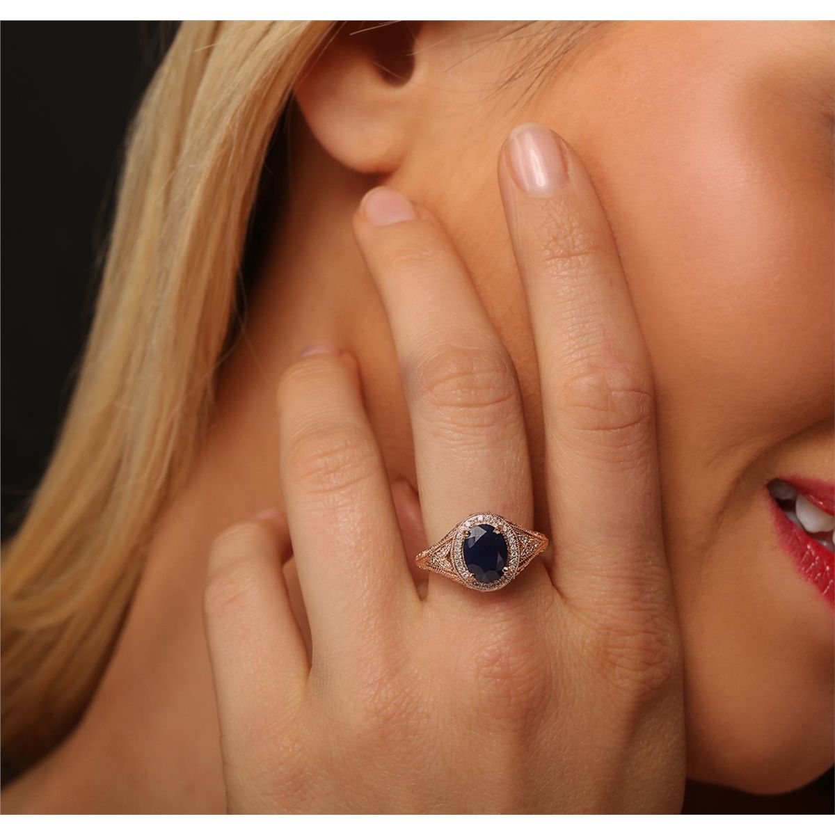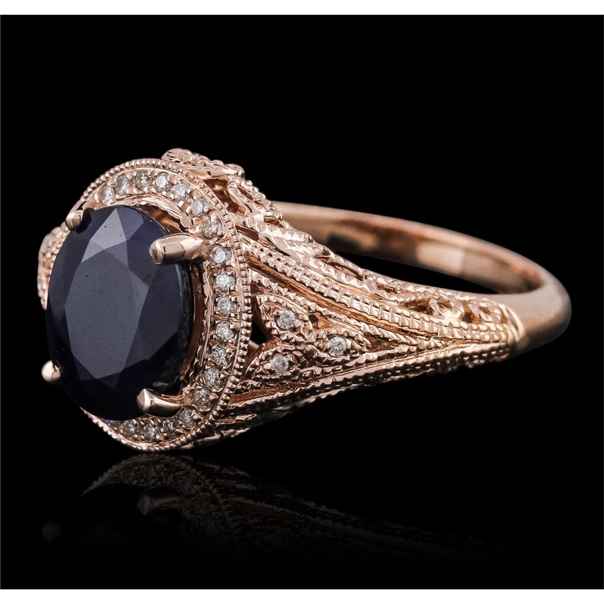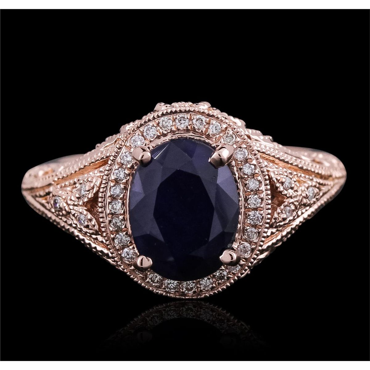 One electronically tested 14KT rose gold ladies cast dyed sapphire and diamond ring. Condition is new, good workmanship. The featured dyed sapphire is set within a diamond bezel supported by elaborate diamond accented shoulders, completed by a one and one-half millimeter wide band. Bright polish finish with milgrain detailing throughout. Trademark is PMI. Identified with markings of "14K". Containing: One prong set oval mixed cut natural dyed sapphire, measuring 9.00 x 6.80 x 3.60mm, 8%. bulge factor, approximate weight of 1.94ct., clarity is severely included, dark, very slightly grayish, violetish blue color, (GIA vB 7/3), cut is good. Transmitting light very diffusely, opaque. Naturally occurring internal & external characteristics are present. Indications of multiple laboratory enhancements, including high temperature heat treatment and dye. Graded in the setting. Thirty-Four bead set round brilliant cut diamonds, measuring 1.10 - 1.00 x 0.63mm (depth est.) approximate. Total Weight of 34 Stones = 0.24ct. Graded in the setting. Clarity: SI-1 to I-1. Color: H - J. Total Weight of Colored Stones 1.94ct. Total Weight of Diamonds 0.24ct. Total Weight of Ring 4.92 grams. AIG Appraised at $1,880.00.