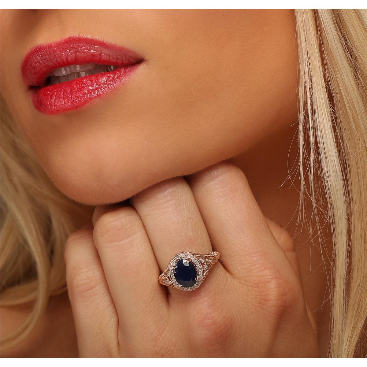One electronically tested 14KT rose gold ladies cast dyed sapphire and diamond ring. Condition is new, good workmanship. The featured dyed sapphire is set within a diamond bezel supported by elaborate diamond accented shoulders, completed by a one and one-half millimeter wide band. Bright polish finish with milgrain detailing throughout. Trademark is PMI. Identified with markings of "14K". Containing: One prong set oval mixed cut natural dyed sapphire, measuring 9.00 x 6.80 x 3.60mm, 8%. bulge factor, approximate weight of 1.94ct., clarity is severely included, dark, very slightly grayish, violetish blue color, (GIA vB 7/3), cut is good. Transmitting light very diffusely, opaque. Naturally occurring internal & external characteristics are present. Indications of multiple laboratory enhancements, including high temperature heat treatment and dye. Graded in the setting. Thirty-Four bead set round brilliant cut diamonds, measuring 1.10 - 1.00 x 0.63mm (depth est.) approximate. Total Weight of 34 Stones = 0.24ct. Graded in the setting. Clarity: SI-1 to I-1. Color: H - J. Total Weight of Colored Stones 1.94ct. Total Weight of Diamonds 0.24ct. Total Weight of Ring 4.92 grams. AIG Appraised at $1,880.00.