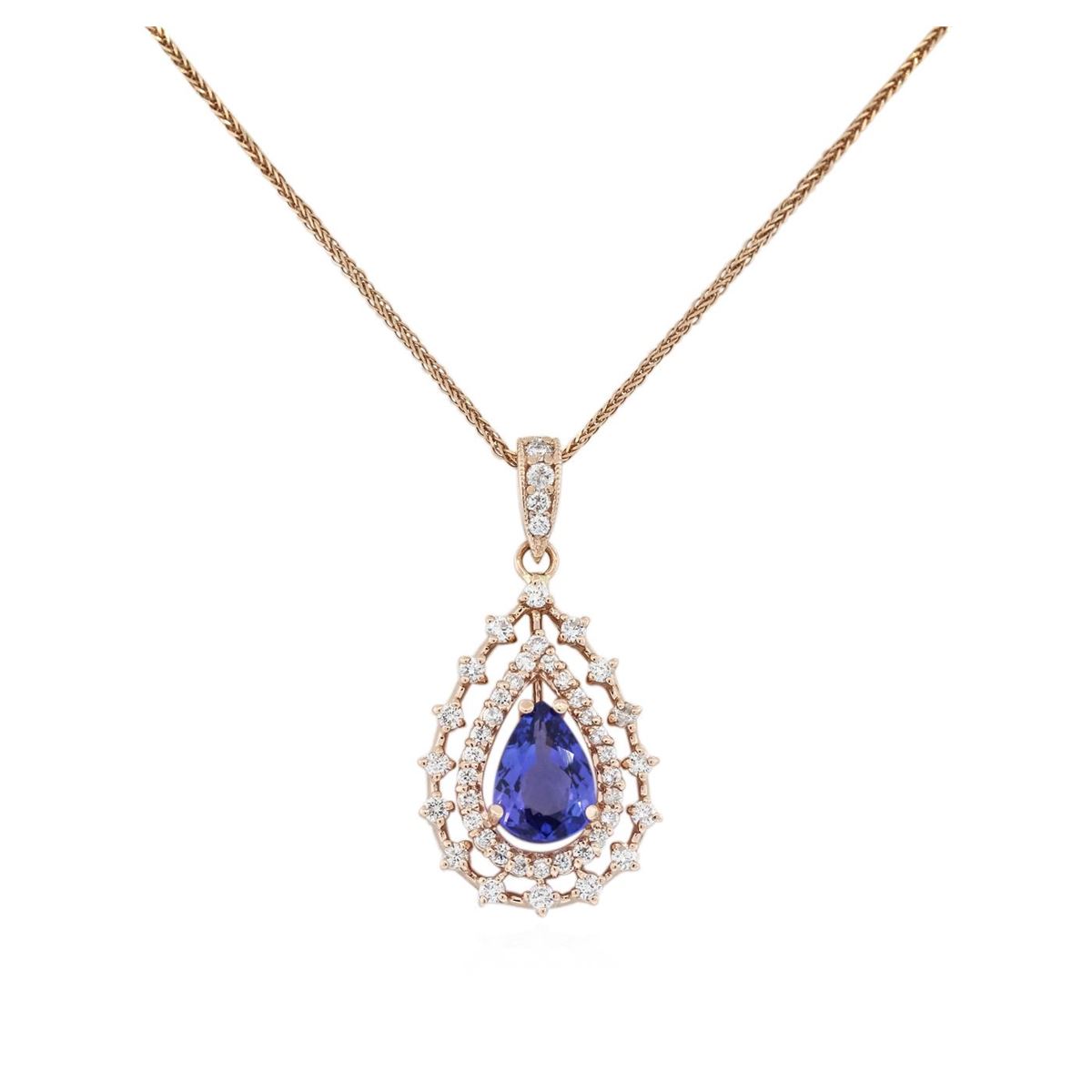 One electronically tested 14KT rose gold ladies cast tanzanite and diamond pendant & chain 18.0" long, herringbone link with a lobster claw clasp with a bright polish finish. Identified with markings of "14K". Condition is new. Containing: One prong set pear modified brilliant cut natural tanzanite, measuring 9.90 x 6.80 x 4.42mm, approximate total weight of 1.99ct., clarity is eye clean, type I, medium light, moderately strong, violet color, (GIA V 4/4), cut is good. Forty-Two prong set round brilliant cut diamonds, measuring 1.70 - 1.30 x 0.90mm (depth est.) approximate total weight of 42 Stones = 0.52ct. Clarity: SI-2 to I-1. Color: I - J, Cut is Good. Five prong set round brilliant cut diamonds, measuring 1.90 - 1.80 x 1.11mm (depth est.) approximate total weight of 5 Stones = 0.12ct. Clarity: SI-2. Color: H - I, Cut is Good. Colored gemstones are presumed to have been subjected to commonly used enhancement processes. All diamonds and colored gemstones are graded in the mounting, unless otherwise stated. Total Weight of Colored Stones 1.99ct. Total Weight of Diamonds 0.63ct. Total Weight of Pendant & Chain 5.40 grams. GGL Appraised at $3,700.00.