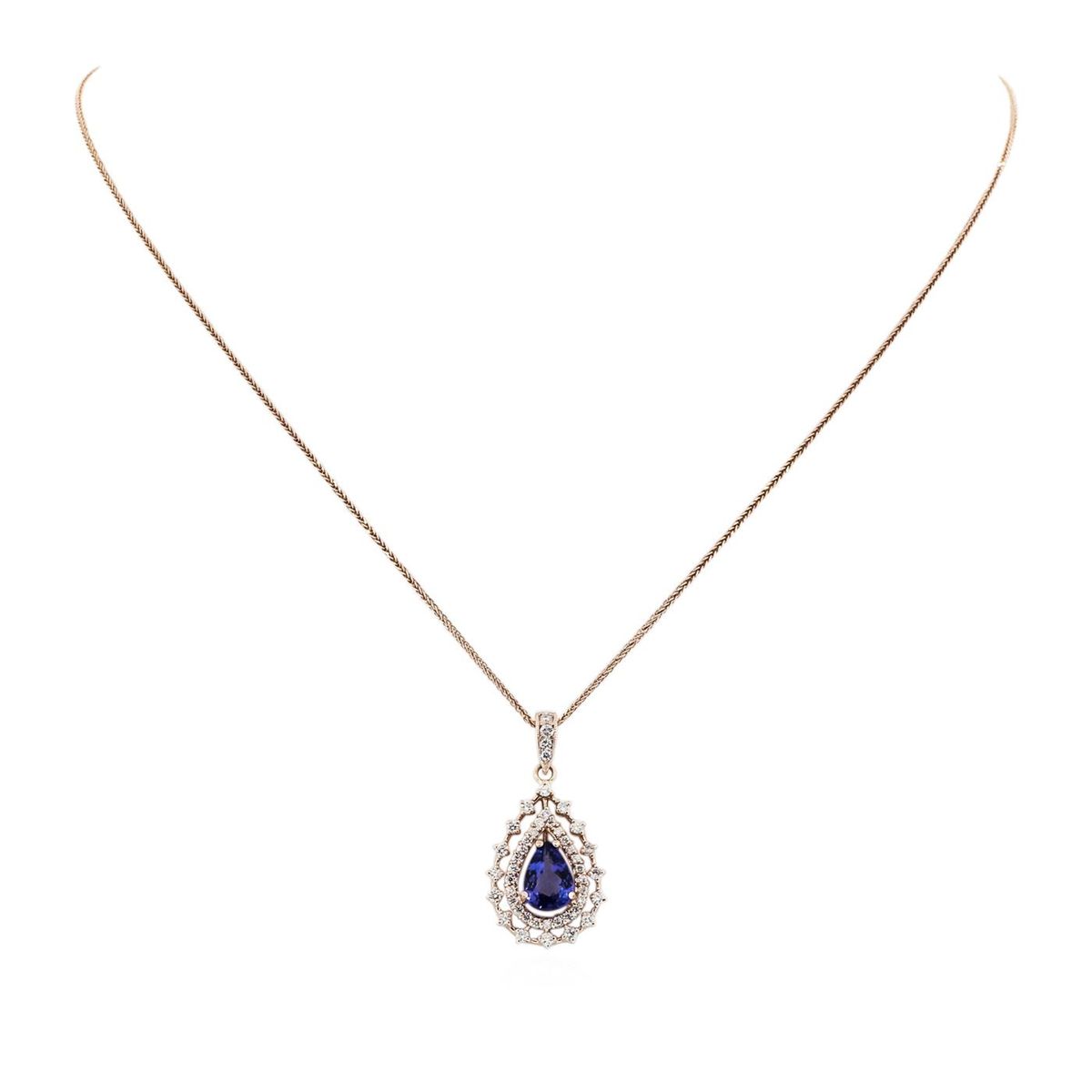 One electronically tested 14KT rose gold ladies cast tanzanite and diamond pendant & chain 18.0" long, herringbone link with a lobster claw clasp with a bright polish finish. Identified with markings of "14K". Condition is new. Containing: One prong set pear modified brilliant cut natural tanzanite, measuring 9.90 x 6.80 x 4.42mm, approximate total weight of 1.99ct., clarity is eye clean, type I, medium light, moderately strong, violet color, (GIA V 4/4), cut is good. Forty-Two prong set round brilliant cut diamonds, measuring 1.70 - 1.30 x 0.90mm (depth est.) approximate total weight of 42 Stones = 0.52ct. Clarity: SI-2 to I-1. Color: I - J, Cut is Good. Five prong set round brilliant cut diamonds, measuring 1.90 - 1.80 x 1.11mm (depth est.) approximate total weight of 5 Stones = 0.12ct. Clarity: SI-2. Color: H - I, Cut is Good. Colored gemstones are presumed to have been subjected to commonly used enhancement processes. All diamonds and colored gemstones are graded in the mounting, unless otherwise stated. Total Weight of Colored Stones 1.99ct. Total Weight of Diamonds 0.63ct. Total Weight of Pendant & Chain 5.40 grams. GGL Appraised at $3,700.00.