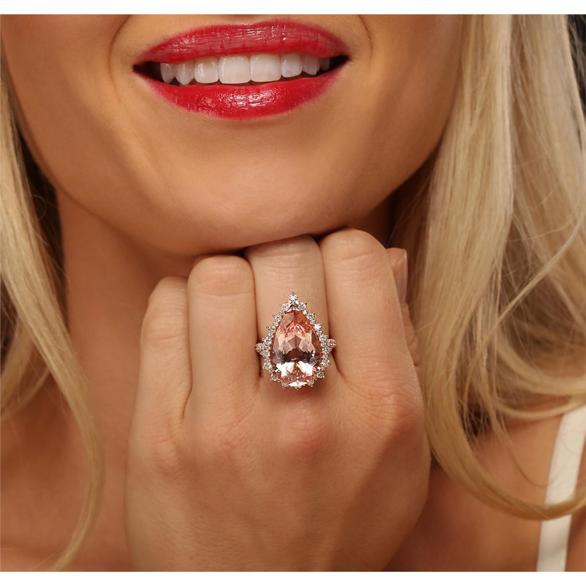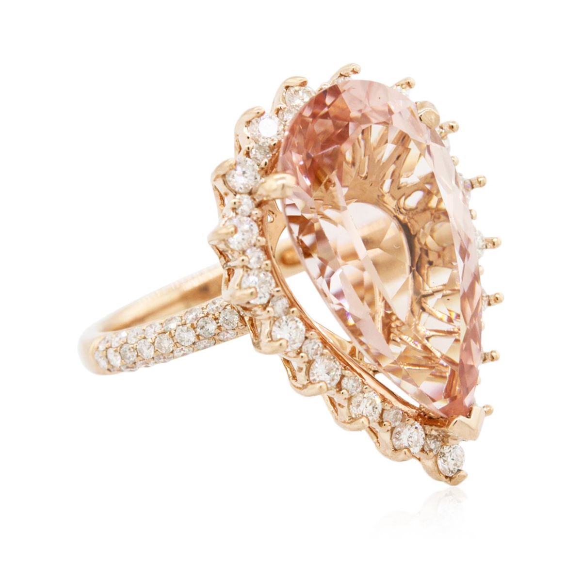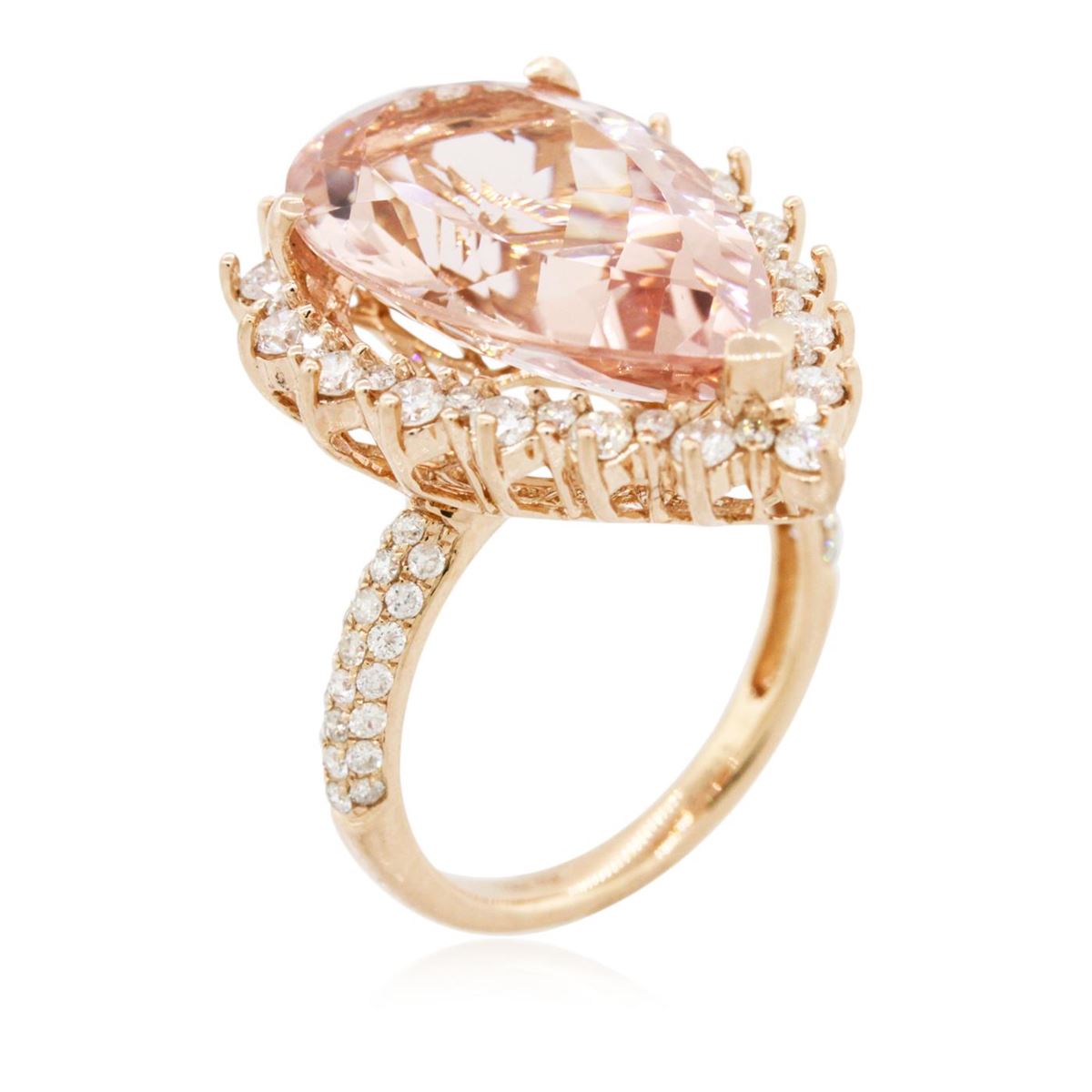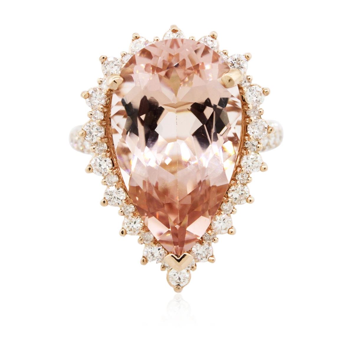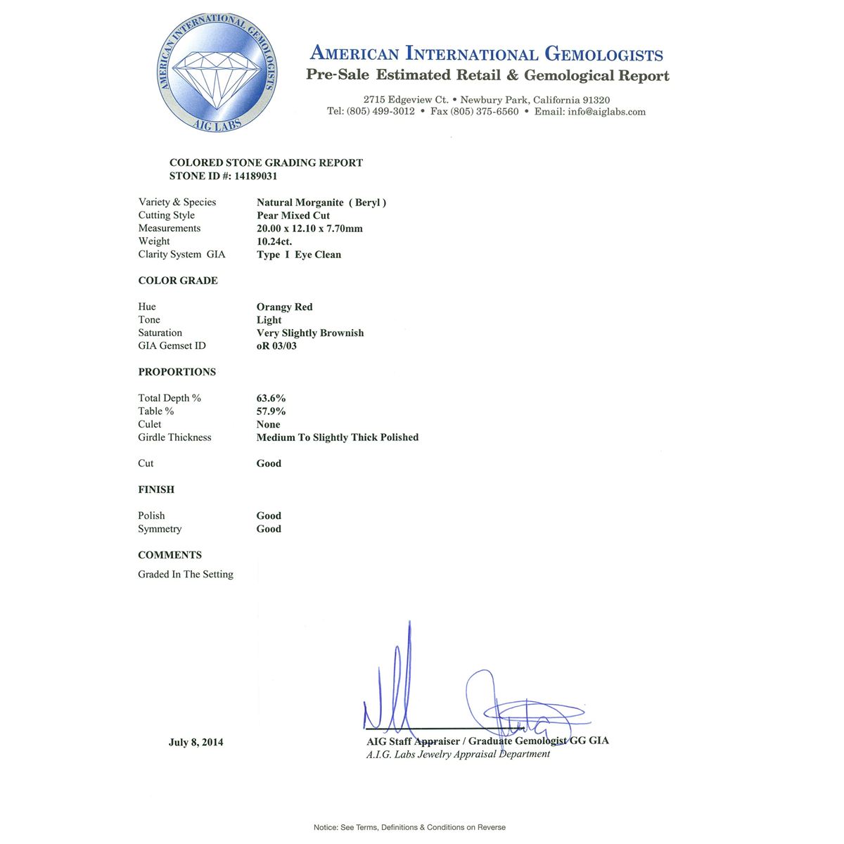 One electronically tested 14KT rose gold ladies cast morganite and diamond ring with a bright polish finish. The featured morganite is set within a diamond bezel supported by diamond set shoulders, completed by a two and one-half millimeter wide band. Trademark is PMI. Identified with markings of "14K". Condition is new, good workmanship. Containing: One prong set pear mixed cut natural morganite, measuring 20.00 x 12.10 x 7.70mm, approximate weight of 10.24ct., clarity is eye clean, type I, light, very slightly brownish, orangy red color, (GIA oR 3/3), cut is good. Transmitting light with no distortion, transparent. Colored Stone Grading Report attached. Graded in the setting. Eighteen prong set round brilliant cut diamonds, measuring 2.10 - 2.00 x 1.23mm (depth est.) approximate total weight of 18 Stones = 0.66ct. Graded in the setting. Clarity: SI-1 to I-1 . Color: G - I One Hundred Six pave & prong set round brilliant cut diamonds, measuring 1.30 - 1.20 x 0.75mm (depth est.) approximate total weight of 106 Stones = 0.85ct. Graded in the setting. Clarity: SI-2 to I-2 . Color: G - I. Total Weight of Colored Stones 10.24ct. Total Weight of Diamonds 1.51ct. Total Weight of Ring 6.92 grams. AIG Appraised at $12,415.00.
