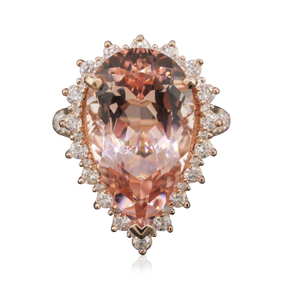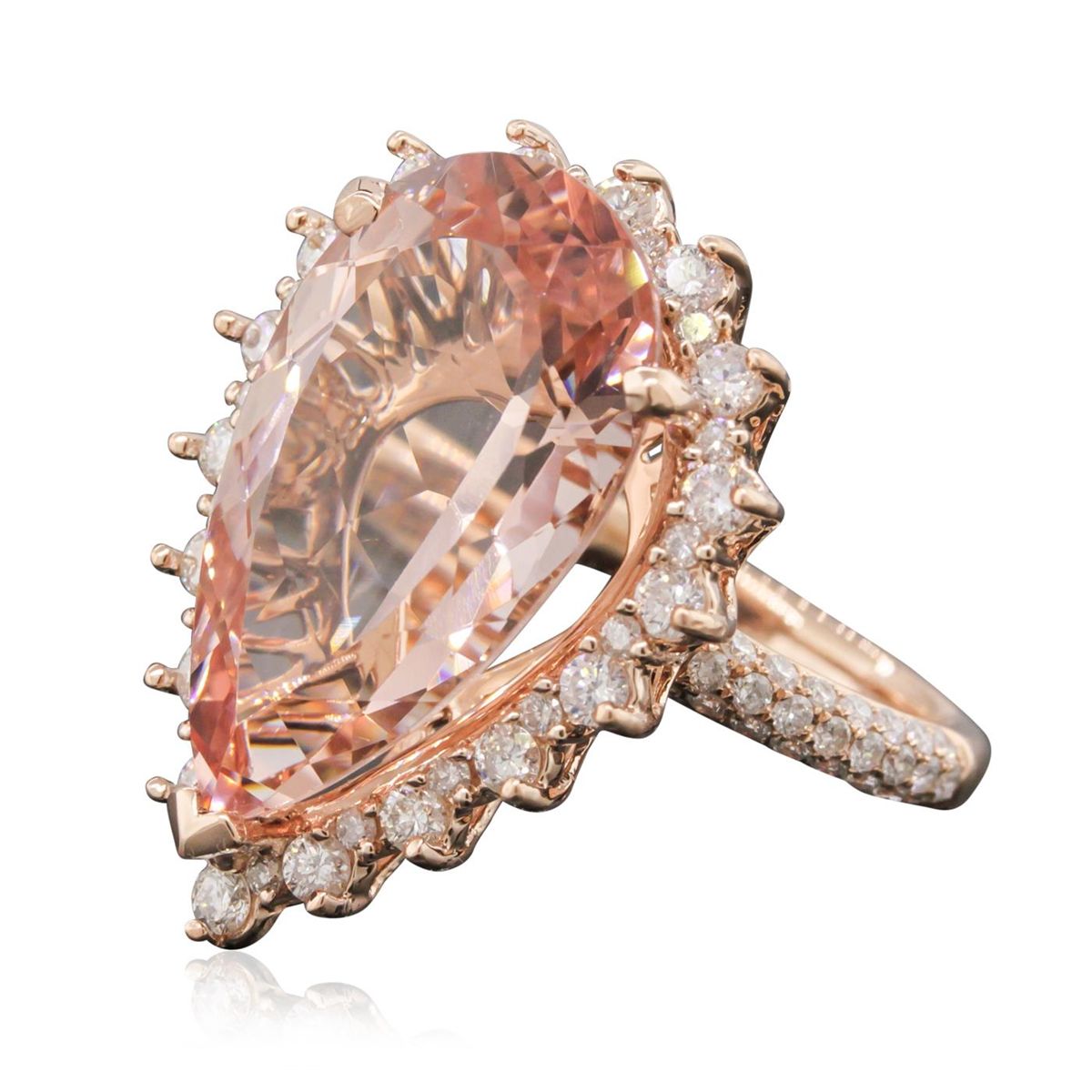 One electronically tested 14KT rose gold ladies cast morganite and diamond ring with a bright polish finish. The featured morganite is set within a diamond bezel supported by diamond set shoulders, completed by a two and one-half millimeter wide band. Trademark is PMI. Identified with markings of "14K". Condition is new, good workmanship. Containing: One prong set pear mixed cut natural morganite, measuring 20.00 x 12.10 x 7.70mm, approximate weight of 10.24ct., clarity is eye clean, type I, light, very slightly brownish, orangy red color, (GIA oR 3/3), cut is good. Transmitting light with no distortion, transparent. Colored Stone Grading Report attached. Graded in the setting. Eighteen prong set round brilliant cut diamonds, measuring 2.10 - 2.00 x 1.23mm (depth est.) approximate total weight of 18 Stones = 0.66ct. Graded in the setting. Clarity: SI-1 to I-1 . Color: G - I One Hundred Six pave & prong set round brilliant cut diamonds, measuring 1.30 - 1.20 x 0.75mm (depth est.) approximate total weight of 106 Stones = 0.85ct. Graded in the setting. Clarity: SI-2 to I-2 . Color: G - I. Total Weight of Colored Stones 10.24ct. Total Weight of Diamonds 1.51ct. Total Weight of Ring 6.92 grams. AIG Appraised at $12,415.00.