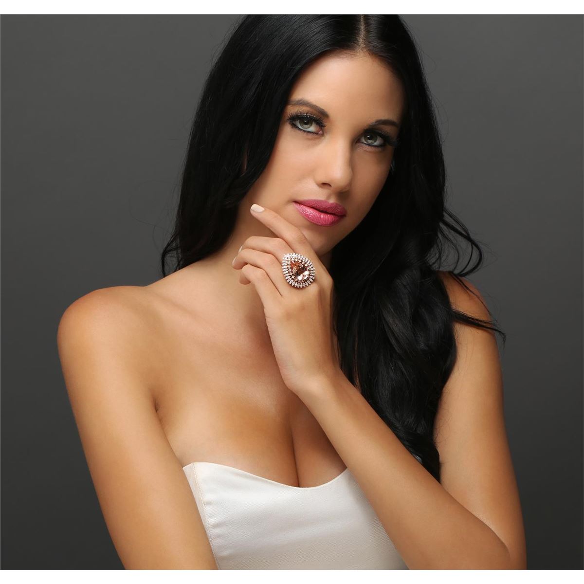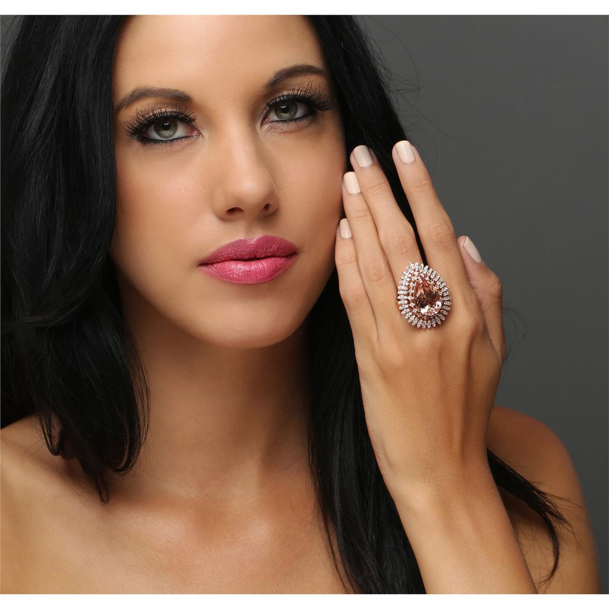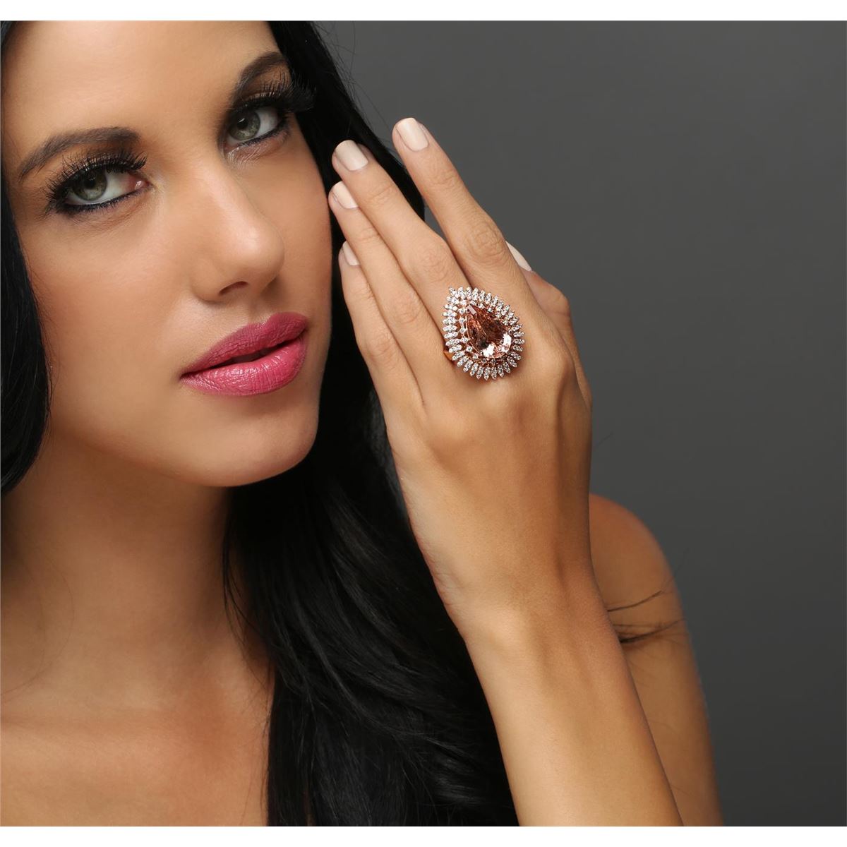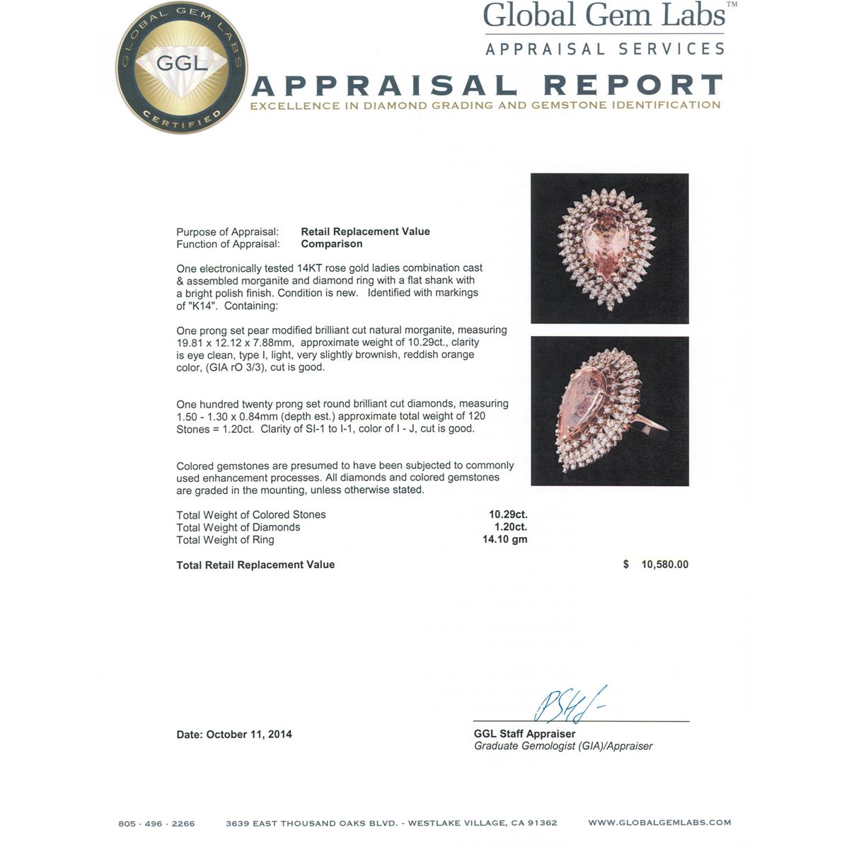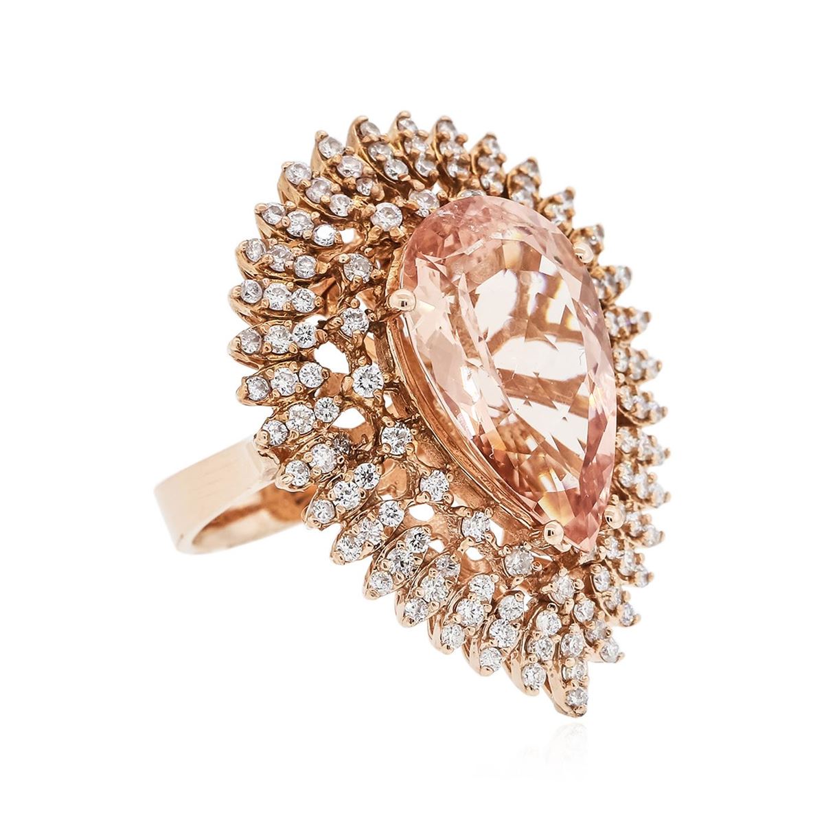 One electronically tested 14KT rose gold ladies combination cast & assembled morganite and diamond ring with a flat shank with a bright polish finish. Identified with markings of "K14". Condition is new. Containing: One prong set pear modified brilliant cut natural morganite, measuring 19.81 x 12.12 x 7.88mm, approximate weight of 10.29ct., clarity is eye clean, type I, light, very slightly brownish, reddish orange color, (GIA rO 3/3), cut is good. One Hundred Twenty prong set round brilliant cut diamonds, measuring 1.50 - 1.30 x 0.84mm (depth est.) approximate total weight of 120 Stones = 1.20ct. Clarity: SI-1 to I-1. Color: I - J, Cut is Good. Colored gemstones are presumed to have been subjected to commonly used enhancement processes. All diamonds and colored gemstones are graded in the mounting, unless otherwise stated. Total Weight of Colored Stones 10.29ct. Total Weight of Diamonds 1.20ct. Total Weight of Ring 14.10 grams. GGL Appraised at $10,580.00.