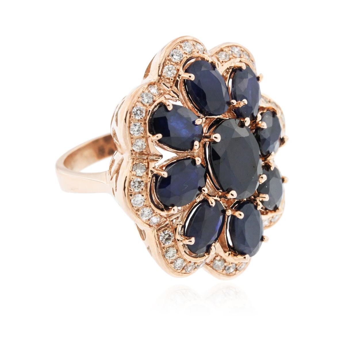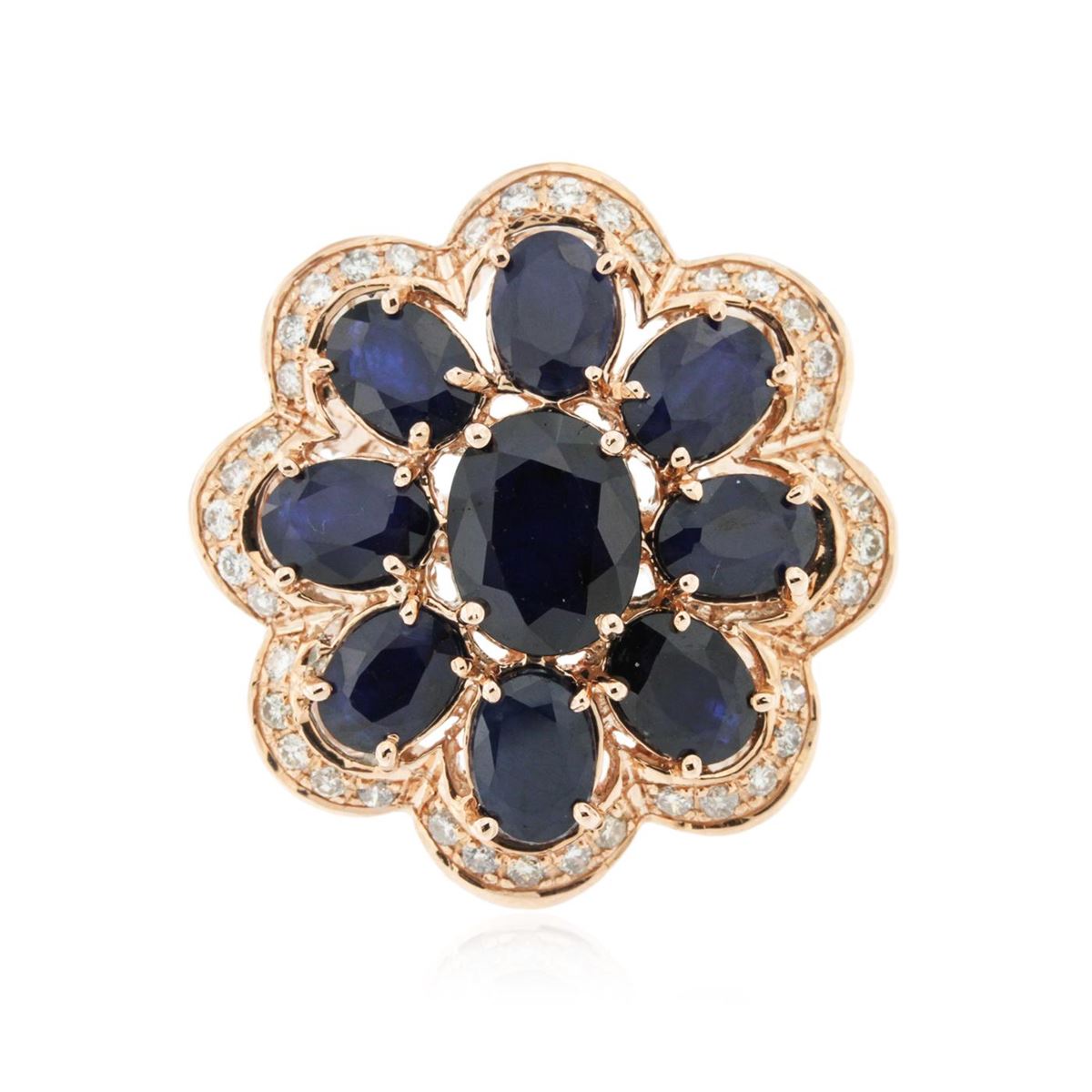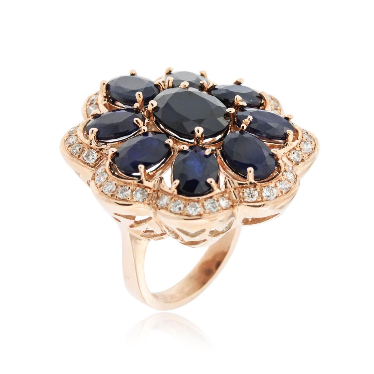 One electronically tested 14KT rose gold ladies cast sapphire and diamond ring with a bright polish finish. Condition is new, good workmanship. The ring features a sapphire floret set within a stylized diamond bezel, completed by a three millimeter wide band. Identified with markings of "14K". Containing: One prong set oval mixed cut natural blue sapphire, measuring 10.00 x 7.50 x 4.75mm, 5%. bulge factor, approximate weight of 3.15ct., clarity is severely included, type II, dark, very slightly grayish, violetish blue color, (GIA vB 7/3), cut is good. Transmitting light very diffusely, opaque. Naturally occurring internal & external characteristics are present. Indications of multiple laboratory enhancements, including high temperature heat treatment and diffusion treatment. Graded in the setting. Eight prong set oval mixed cut natural blue sapphires, measuring 7.00 x 5.00 x 3.10mm, approximate. Total Weight of 7.22ct., clarity is heavily included, type II, medium dark, very slightly grayish, violetish blue color, (GIA vB 6/3), cut is good. Transmitting light diffusely translucent. Naturally occurring internal & external characteristics are present, including partial color zoning. Measurements & the color grade are an average for the group. Indications of multiple laboratory enhancements, including high temperature heat treatment and diffusion treatment. Graded in the setting. Forty bead set round brilliant cut diamonds, measuring 1.70 - 1.60 x 0.99mm (depth est.) approximate. Total Weight of 40 Stones = 0.75ct. Graded in the setting. Clarity: VS-2 to SI-2. Color: H - J. Total Weight of Colored Stones 10.37ct. Total Weight of Diamonds 0.75ct. Total Weight of Ring 16.69 grams. AIG Appraised at $7,345.00.