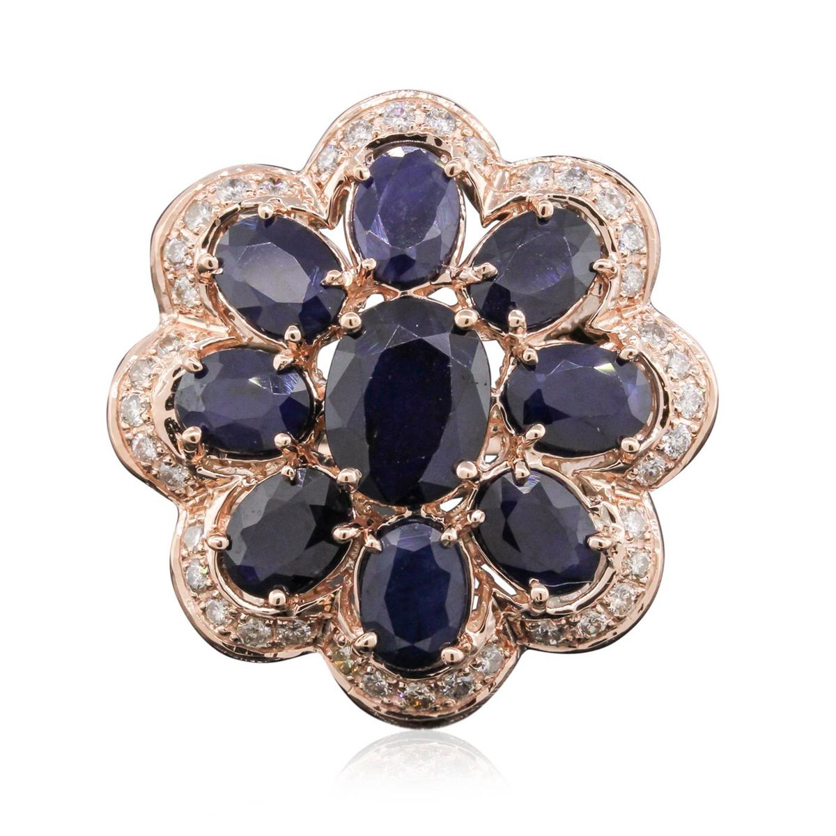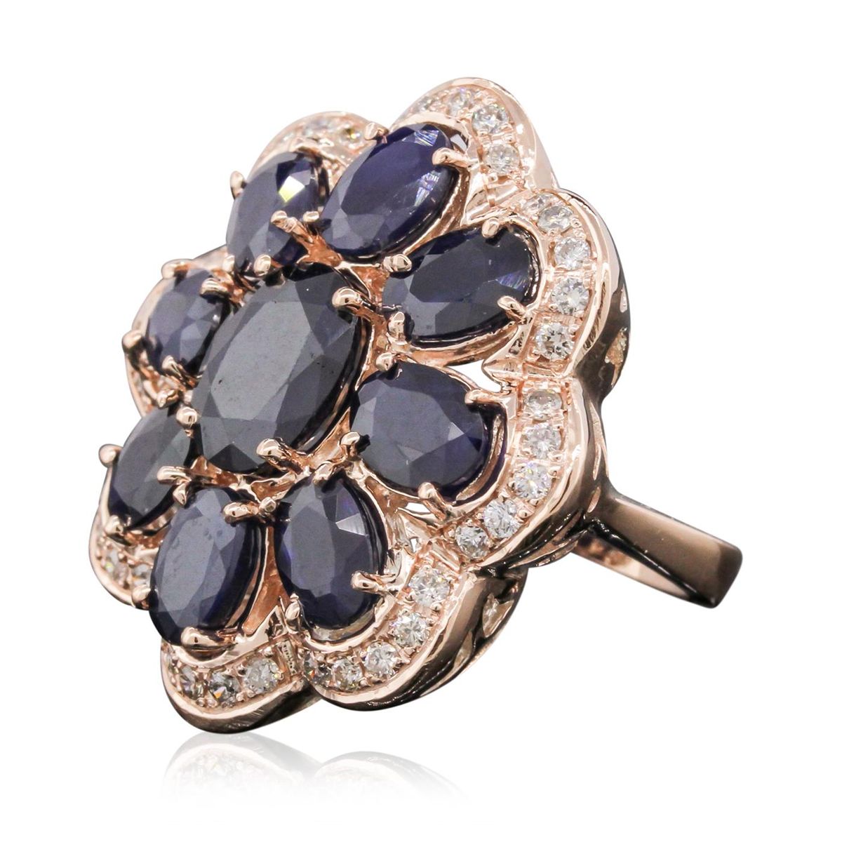 One electronically tested 14KT rose gold ladies cast sapphire and diamond ring with a bright polish finish. Condition is new, good workmanship. The ring features a sapphire floret set within a stylized diamond bezel, completed by a three millimeter wide band. Identified with markings of "14K". Containing: One prong set oval mixed cut natural blue sapphire, measuring 10.00 x 7.50 x 4.75mm, 5%. bulge factor, approximate weight of 3.15ct., clarity is severely included, type II, dark, very slightly grayish, violetish blue color, (GIA vB 7/3), cut is good. Transmitting light very diffusely, opaque. Naturally occurring internal & external characteristics are present. Indications of multiple laboratory enhancements, including high temperature heat treatment and diffusion treatment. Graded in the setting. Eight prong set oval mixed cut natural blue sapphires, measuring 7.00 x 5.00 x 3.10mm, approximate. Total Weight of 7.22ct., clarity is heavily included, type II, medium dark, very slightly grayish, violetish blue color, (GIA vB 6/3), cut is good. Transmitting light diffusely translucent. Naturally occurring internal & external characteristics are present, including partial color zoning. Measurements & the color grade are an average for the group. Indications of multiple laboratory enhancements, including high temperature heat treatment and diffusion treatment. Graded in the setting. Forty bead set round brilliant cut diamonds, measuring 1.70 - 1.60 x 0.99mm (depth est.) approximate. Total Weight of 40 Stones = 0.75ct. Graded in the setting. Clarity: VS-2 to SI-2. Color: H - J. Total Weight of Colored Stones 10.37ct. Total Weight of Diamonds 0.75ct. Total Weight of Ring 16.69 grams. AIG Appraised at $7,345.00.