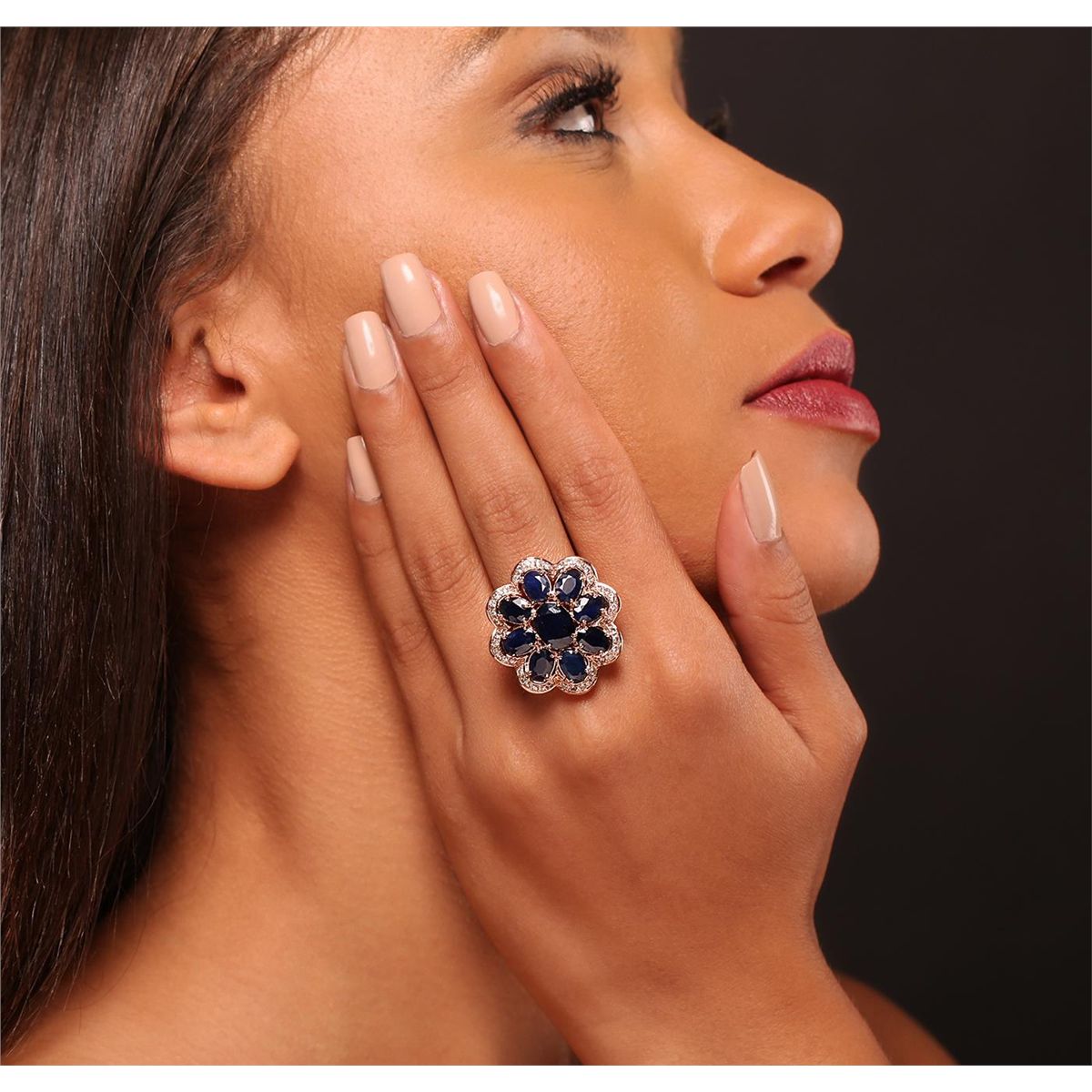 One electronically tested 14KT rose gold ladies cast sapphire and diamond ring with a bright polish finish. Condition is new, good workmanship. The ring features a sapphire floret set within a stylized diamond bezel, completed by a three millimeter wide band. Identified with markings of "14K". Containing: One prong set oval mixed cut natural blue sapphire, measuring 10.00 x 7.50 x 4.75mm, 5%. bulge factor, approximate weight of 3.15ct., clarity is severely included, type II, dark, very slightly grayish, violetish blue color, (GIA vB 7/3), cut is good. Transmitting light very diffusely, opaque. Naturally occurring internal & external characteristics are present. Indications of multiple laboratory enhancements, including high temperature heat treatment and diffusion treatment. Graded in the setting. Eight prong set oval mixed cut natural blue sapphires, measuring 7.00 x 5.00 x 3.10mm, approximate. Total Weight of 7.22ct., clarity is heavily included, type II, medium dark, very slightly grayish, violetish blue color, (GIA vB 6/3), cut is good. Transmitting light diffusely translucent. Naturally occurring internal & external characteristics are present, including partial color zoning. Measurements & the color grade are an average for the group. Indications of multiple laboratory enhancements, including high temperature heat treatment and diffusion treatment. Graded in the setting. Forty bead set round brilliant cut diamonds, measuring 1.70 - 1.60 x 0.99mm (depth est.) approximate. Total Weight of 40 Stones = 0.75ct. Graded in the setting. Clarity: VS-2 to SI-2. Color: H - J. Total Weight of Colored Stones 10.37ct. Total Weight of Diamonds 0.75ct. Total Weight of Ring 16.69 grams. AIG Appraised at $7,345.00.