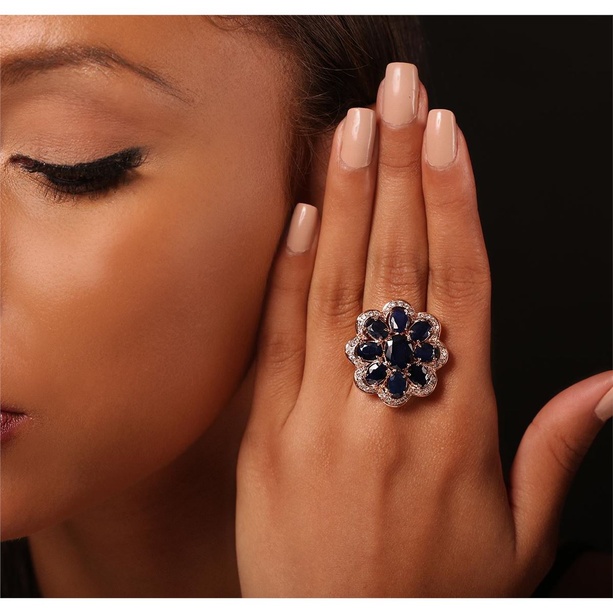 One electronically tested 14KT rose gold ladies cast sapphire and diamond ring with a bright polish finish. Condition is new, good workmanship. The ring features a sapphire floret set within a stylized diamond bezel, completed by a three millimeter wide band. Identified with markings of "14K". Containing: One prong set oval mixed cut natural blue sapphire, measuring 10.00 x 7.50 x 4.75mm, 5%. bulge factor, approximate weight of 3.15ct., clarity is severely included, type II, dark, very slightly grayish, violetish blue color, (GIA vB 7/3), cut is good. Transmitting light very diffusely, opaque. Naturally occurring internal & external characteristics are present. Indications of multiple laboratory enhancements, including high temperature heat treatment and diffusion treatment. Graded in the setting. Eight prong set oval mixed cut natural blue sapphires, measuring 7.00 x 5.00 x 3.10mm, approximate. Total Weight of 7.22ct., clarity is heavily included, type II, medium dark, very slightly grayish, violetish blue color, (GIA vB 6/3), cut is good. Transmitting light diffusely translucent. Naturally occurring internal & external characteristics are present, including partial color zoning. Measurements & the color grade are an average for the group. Indications of multiple laboratory enhancements, including high temperature heat treatment and diffusion treatment. Graded in the setting. Forty bead set round brilliant cut diamonds, measuring 1.70 - 1.60 x 0.99mm (depth est.) approximate. Total Weight of 40 Stones = 0.75ct. Graded in the setting. Clarity: VS-2 to SI-2. Color: H - J. Total Weight of Colored Stones 10.37ct. Total Weight of Diamonds 0.75ct. Total Weight of Ring 16.69 grams. AIG Appraised at $7,345.00.