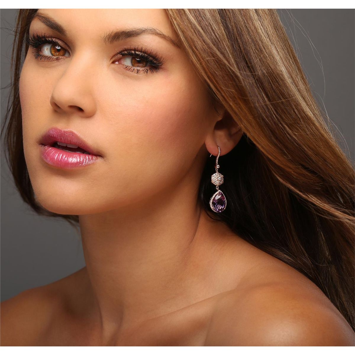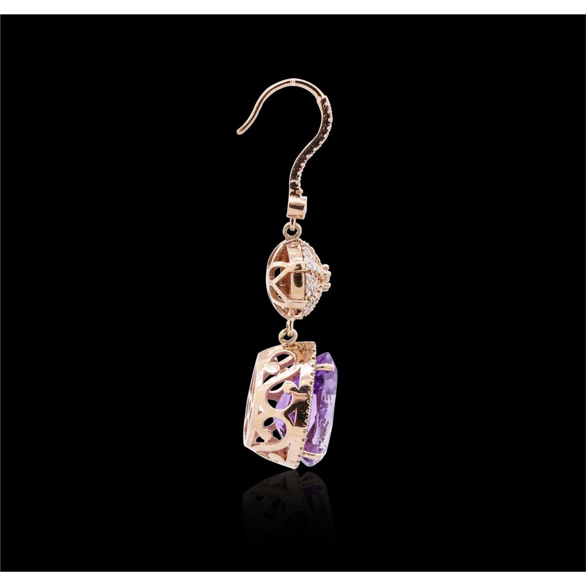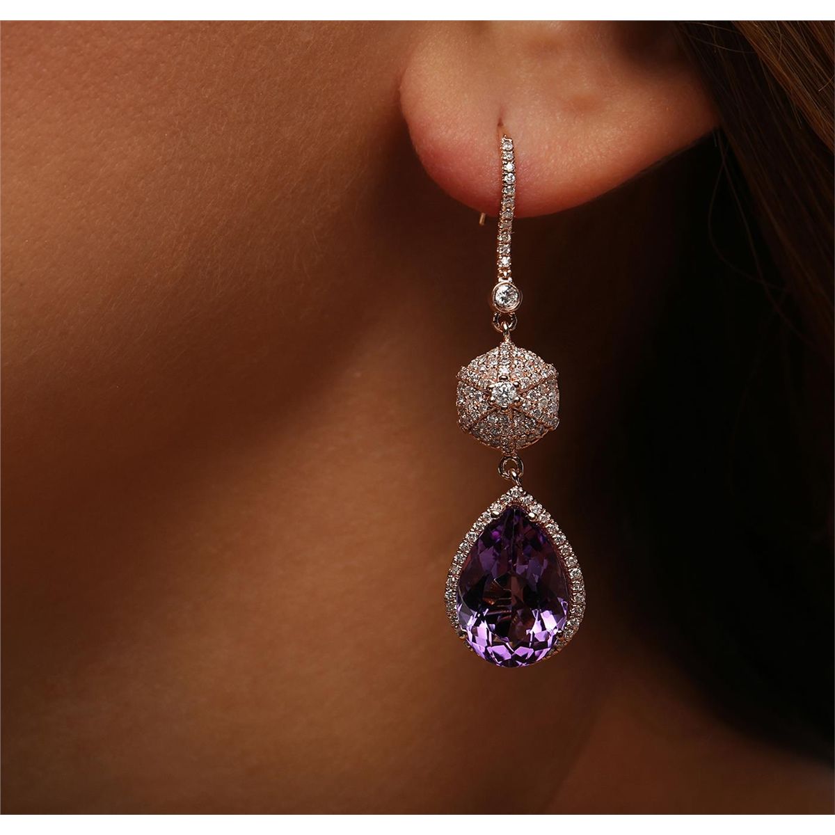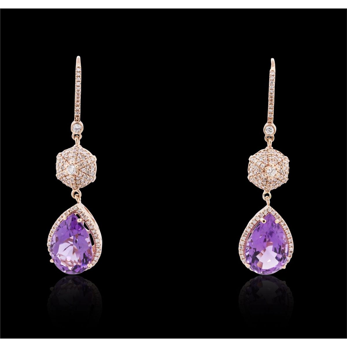 One pair of earrings featuring: 14KT rose gold weighing 9.50 grams containing two pear cut amethysts with a total weight of 10.60cts and round diamonds with a total weight of 1.10cts.