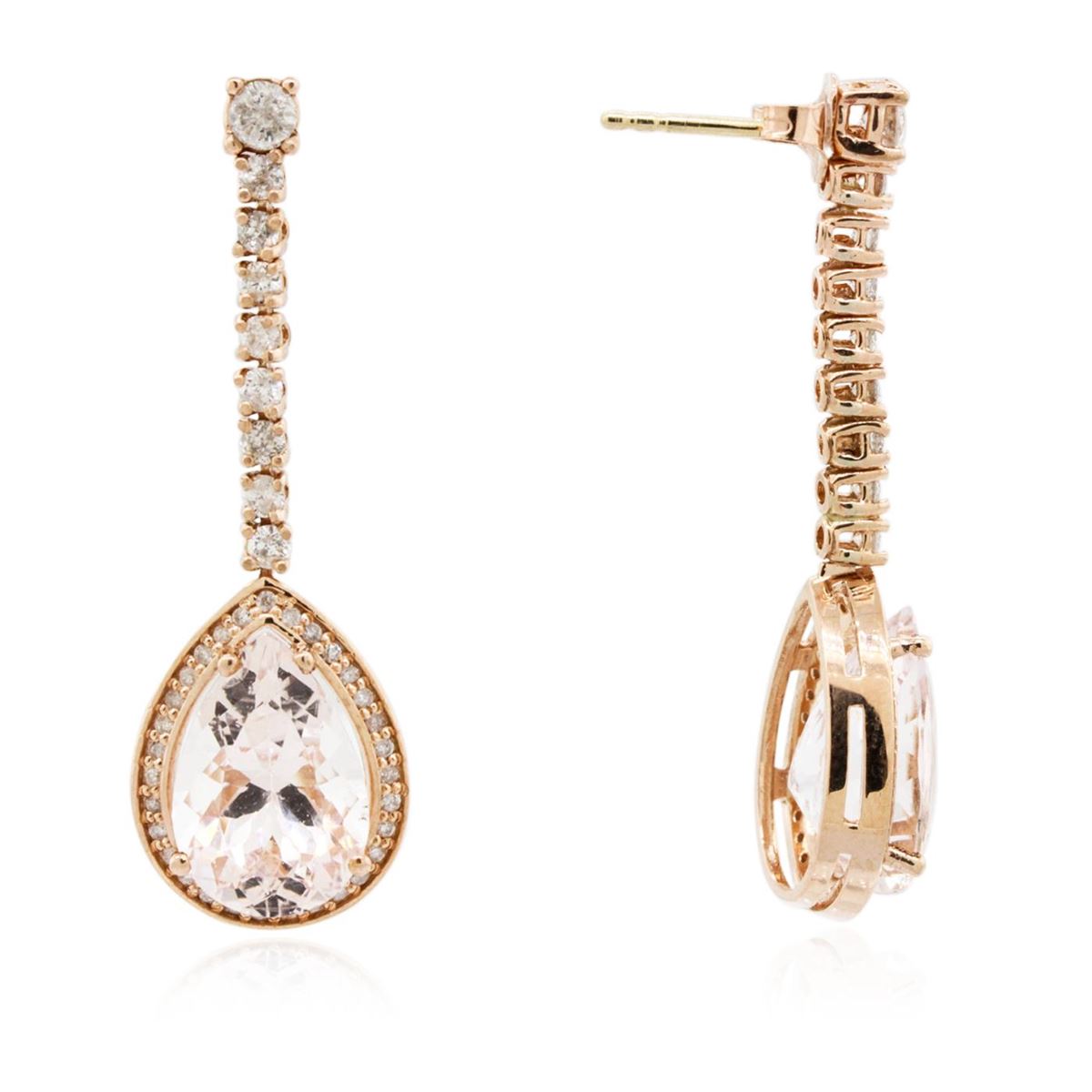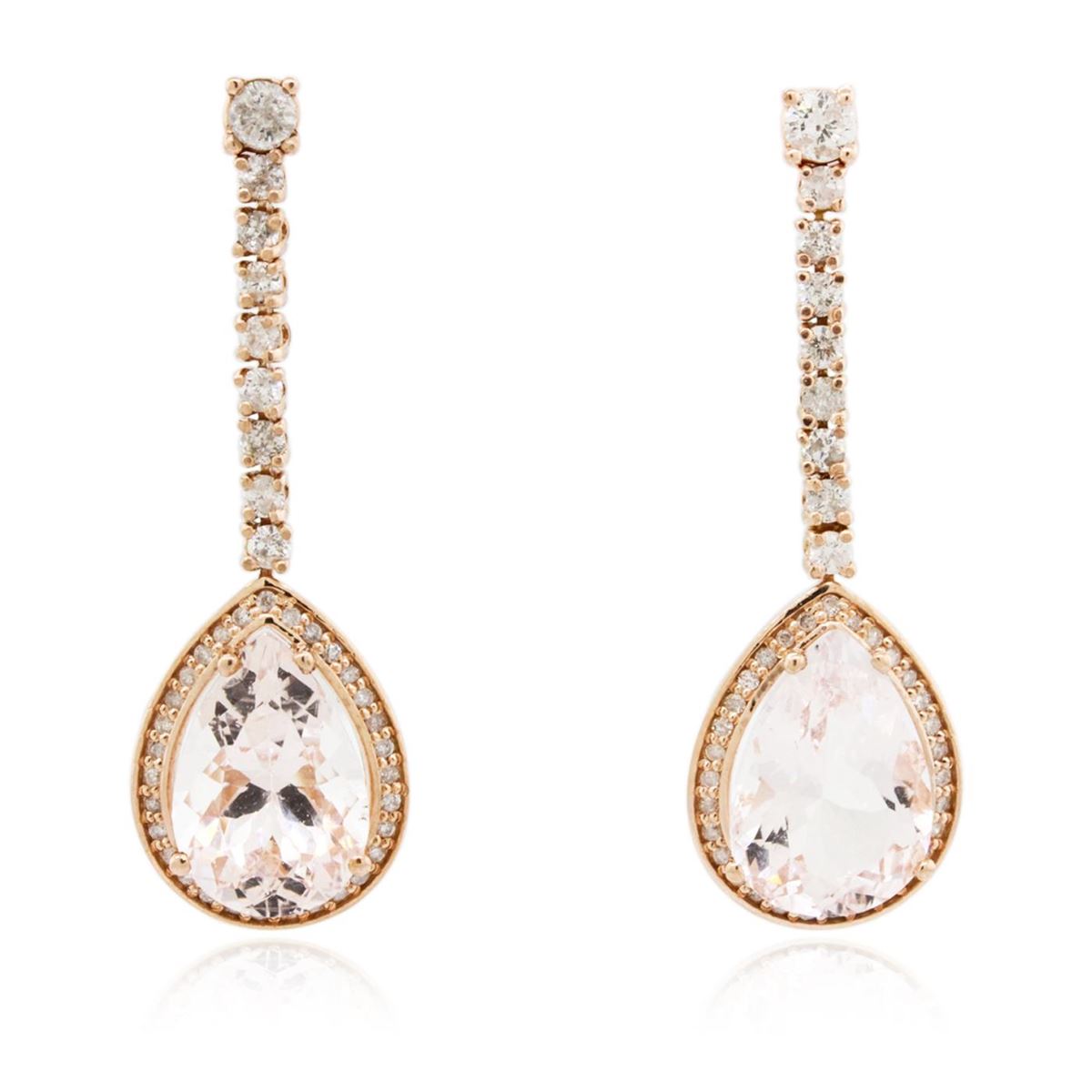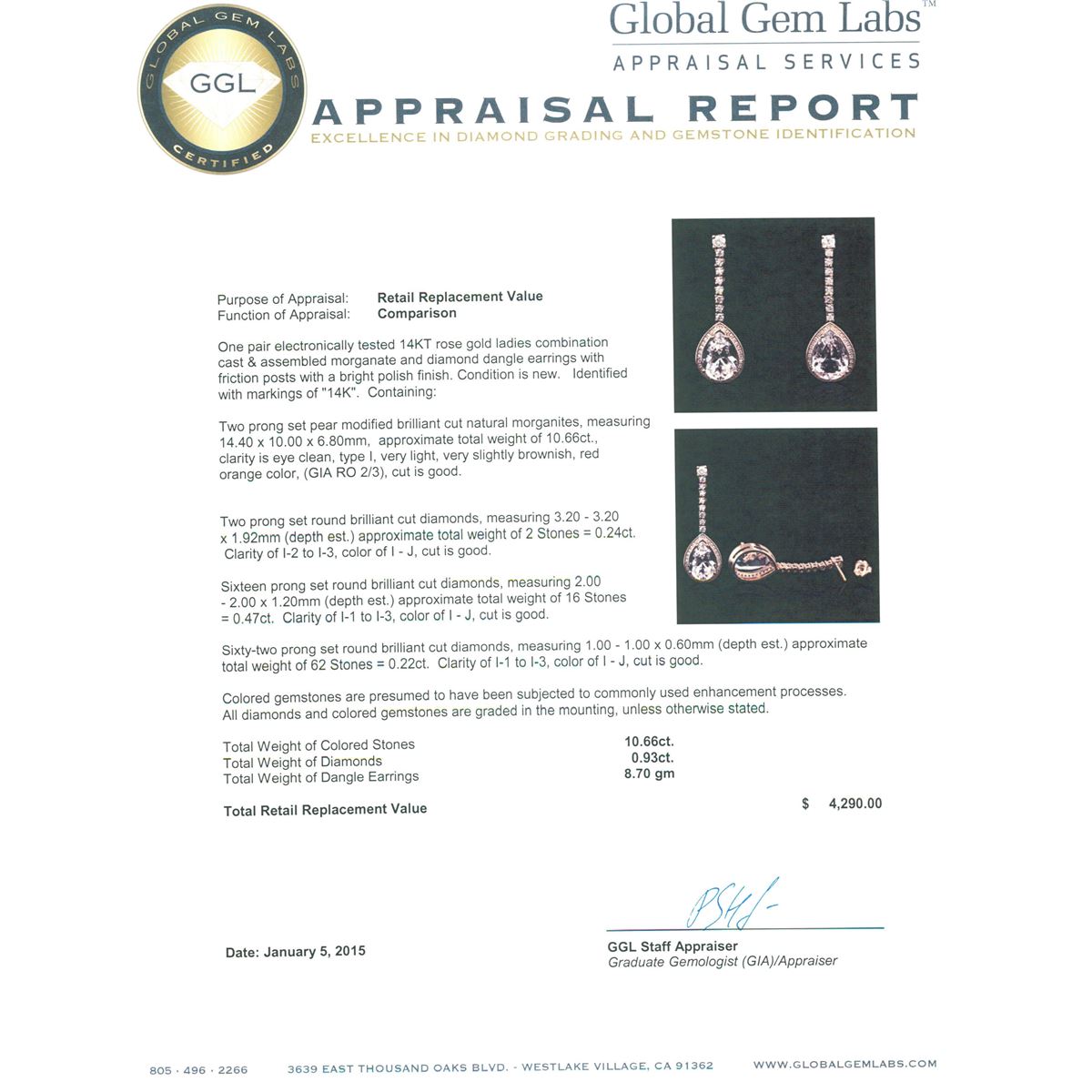 One pair electronically tested 14KT rose gold ladies combination cast & assembled morganite and diamond dangle earrings with friction posts with a bright polish finish. Identified with markings of "14K". Condition is new. Containing: Two prong set pear modified brilliant cut natural morganites, measuring 14.40 x 10.00 x 6.80mm, approximate total weight of 10.66ct., clarity is eye clean, type I, very light, very slightly brownish, red orange color, (GIA RO 2/3), cut is good. Two prong set round brilliant cut diamonds, measuring 3.20 - 3.20 x 1.92mm (depth est.) approximate total weight of 2 Stones = 0.24ct. Clarity: I-2 to I-3. Color: I - J, Cut is Good. Sixteen prong set round brilliant cut diamonds, measuring 2.00 - 2.00 x 1.20mm (depth est.) approximate total weight of 16 Stones = 0.47ct. Clarity: I-1 to I-3. Color: I - J, Cut is Good. Sixty-Two prong set round brilliant cut diamonds, measuring 1.00 - 1.00 x 0.60mm (depth est.) approximate total weight of 62 Stones = 0.22ct. Clarity: I-1 to I-3. Color: I - J, Cut is Good. Colored gemstones are presumed to have been subjected to commonly used enhancement processes. All diamonds and colored gemstones are graded in the mounting, unless otherwise stated. Total Weight of Colored Stones 10.66ct. Total Weight of Diamonds 0.93ct. Total Weight of Dangle Earrings 8.70 grams. GGL Appraised at $4,290.00.