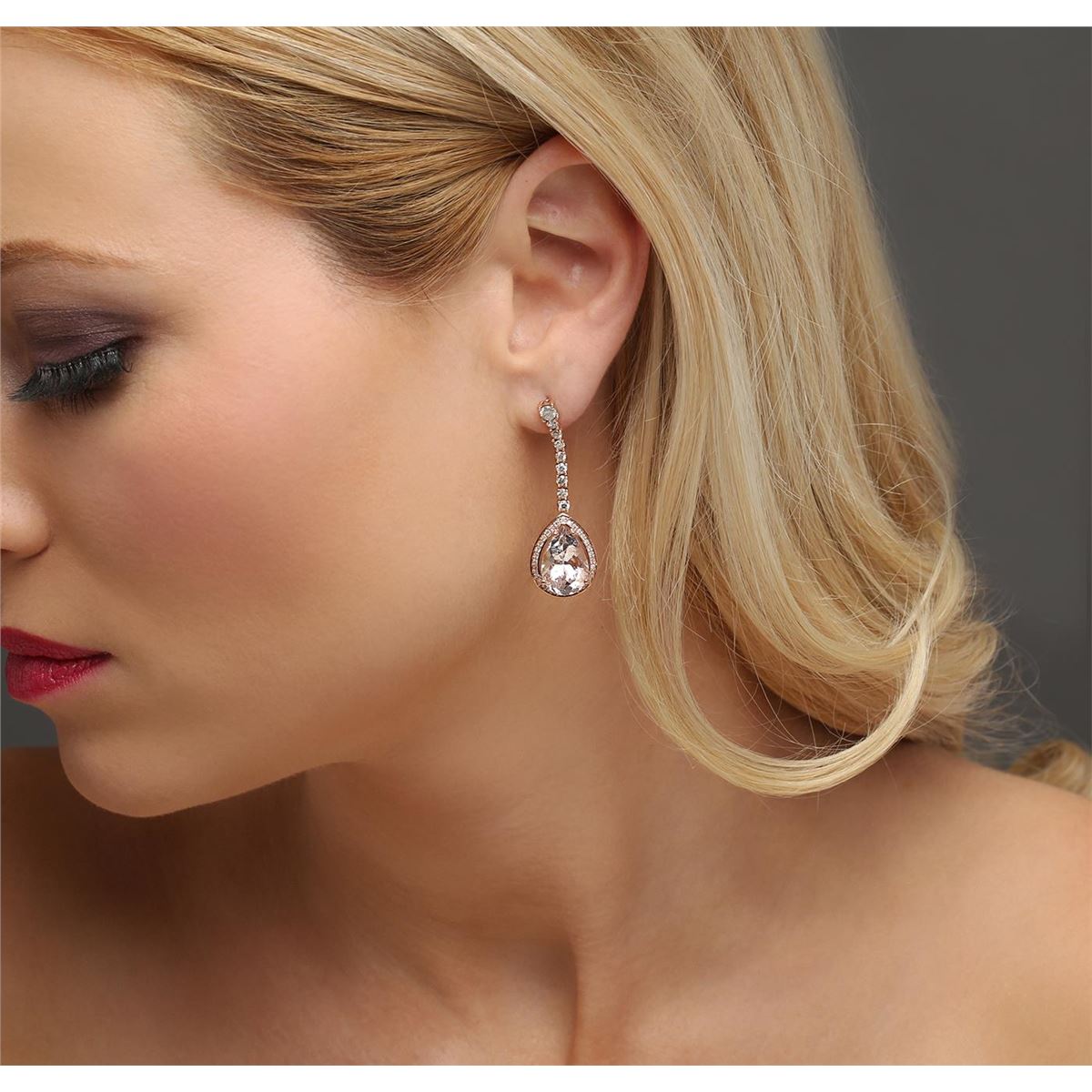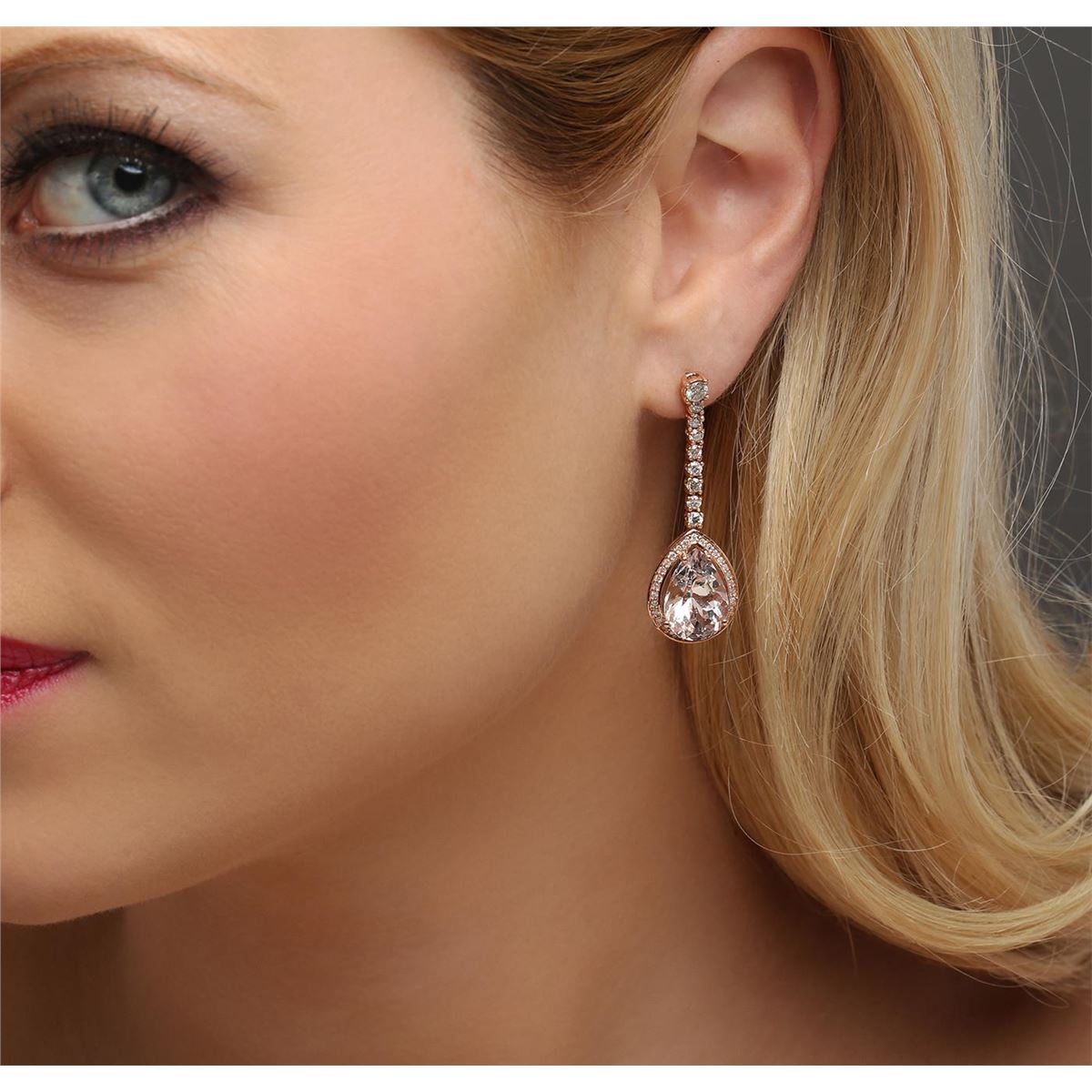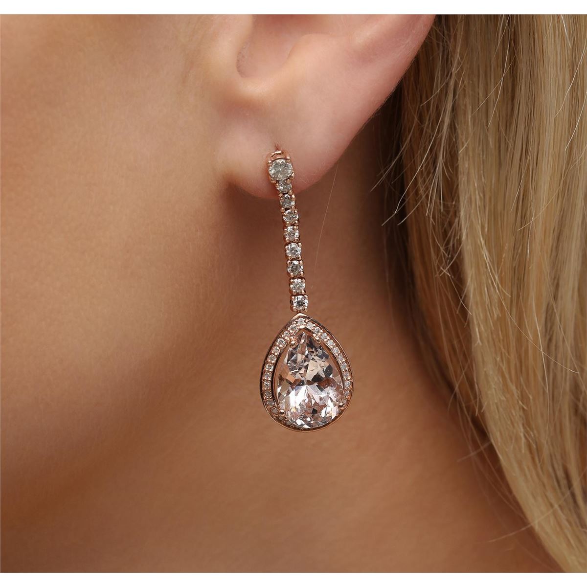One pair electronically tested 14KT rose gold ladies combination cast & assembled morganite and diamond dangle earrings with friction posts with a bright polish finish. Identified with markings of "14K". Condition is new. Containing: Two prong set pear modified brilliant cut natural morganites, measuring 14.40 x 10.00 x 6.80mm, approximate total weight of 10.66ct., clarity is eye clean, type I, very light, very slightly brownish, red orange color, (GIA RO 2/3), cut is good. Two prong set round brilliant cut diamonds, measuring 3.20 - 3.20 x 1.92mm (depth est.) approximate total weight of 2 Stones = 0.24ct. Clarity: I-2 to I-3. Color: I - J, Cut is Good. Sixteen prong set round brilliant cut diamonds, measuring 2.00 - 2.00 x 1.20mm (depth est.) approximate total weight of 16 Stones = 0.47ct. Clarity: I-1 to I-3. Color: I - J, Cut is Good. Sixty-Two prong set round brilliant cut diamonds, measuring 1.00 - 1.00 x 0.60mm (depth est.) approximate total weight of 62 Stones = 0.22ct. Clarity: I-1 to I-3. Color: I - J, Cut is Good. Colored gemstones are presumed to have been subjected to commonly used enhancement processes. All diamonds and colored gemstones are graded in the mounting, unless otherwise stated. Total Weight of Colored Stones 10.66ct. Total Weight of Diamonds 0.93ct. Total Weight of Dangle Earrings 8.70 grams. GGL Appraised at $4,290.00.