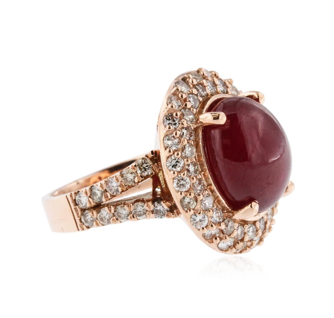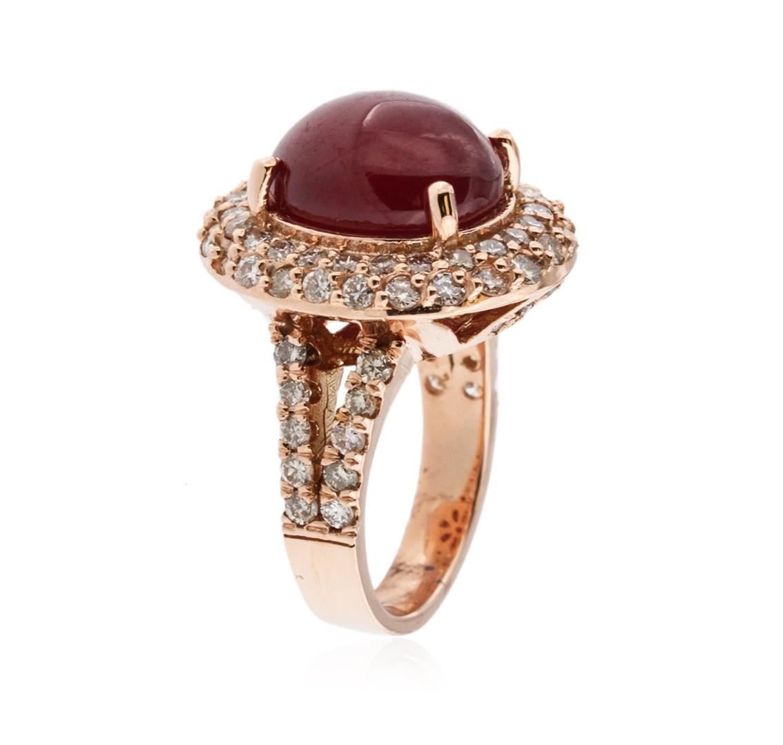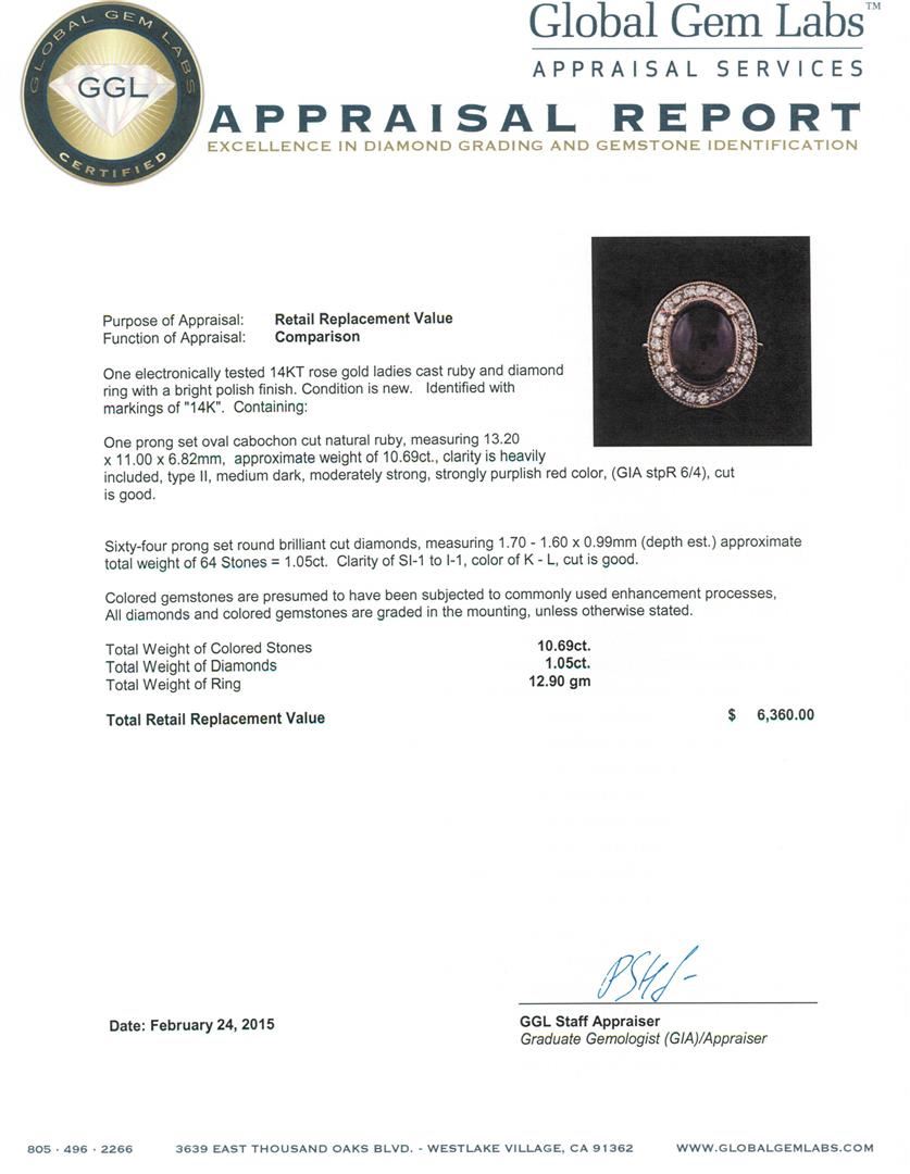 One electronically tested 14KT rose gold ladies cast ruby and diamond ring with a bright polish finish. Identified with markings of "14K". Condition is new. Containing: One prong set oval cabochon cut natural ruby, measuring 13.20 x 11.00 x 6.82mm, approximate weight of 10.69ct., clarity is heavily included, type II, medium dark, moderately strong, strongly purplish red color, (GIA stpR 6/4), cut is good. Sixty-Four prong set round brilliant cut diamonds, measuring 1.70 - 1.60 x 0.99mm (depth est.) approximate total weight of 64 Stones = 1.05ct. Clarity: SI-1 to I-1. Color: K - L, Cut is Good. Colored gemstones are presumed to have been subjected to commonly used enhancement processes, All diamonds and colored gemstones are graded in the mounting, unless otherwise stated. Total Weight of Colored Stones 10.69ct. Total Weight of Diamonds 1.05ct. Total Weight of Ring 12.90 grams. GGL Appraised at $6,360.00.