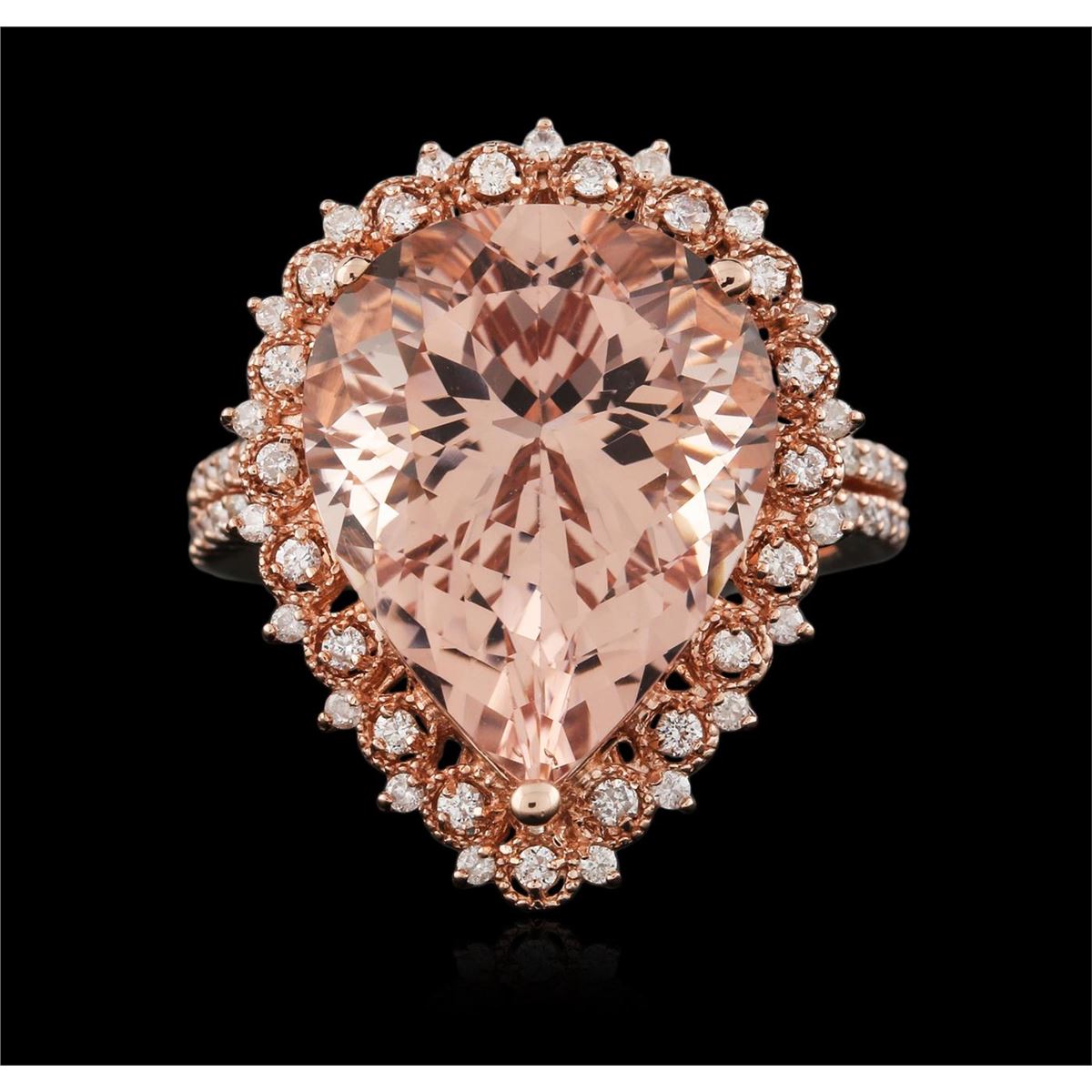 One electronically tested 14KT rose gold ladies cast morganite and diamond ring with a bright polish finish. Identified with markings of "K14". Condition is new. Containing: One prong set pear modified brilliant cut natural morganite, measuring 18.00 x 13.00 x 8.45mm, approximate weight of 10.76ct., clarity is eye clean, type I, light, brownish, reddish orange color, (GIA rO 3/1), cut is good. Sixty-Five prong set round brilliant cut diamonds, measuring 1.30 - 1.10 x 0.72mm (depth est.) approximate total weight of 65 Stones = 0.41ct. Clarity: I-1 to I-2. Color: J - K. Colored gemstones are presumed to have been subjected to commonly used enhancement processes. All diamonds and colored gemstones are graded in the mounting, unless otherwise stated. Total Weight of Colored Stones 10.76ct. Total Weight of Diamonds 0.41ct. Total Weight of Ring 8.10 grams. GGL Appraised at $5,005.00.