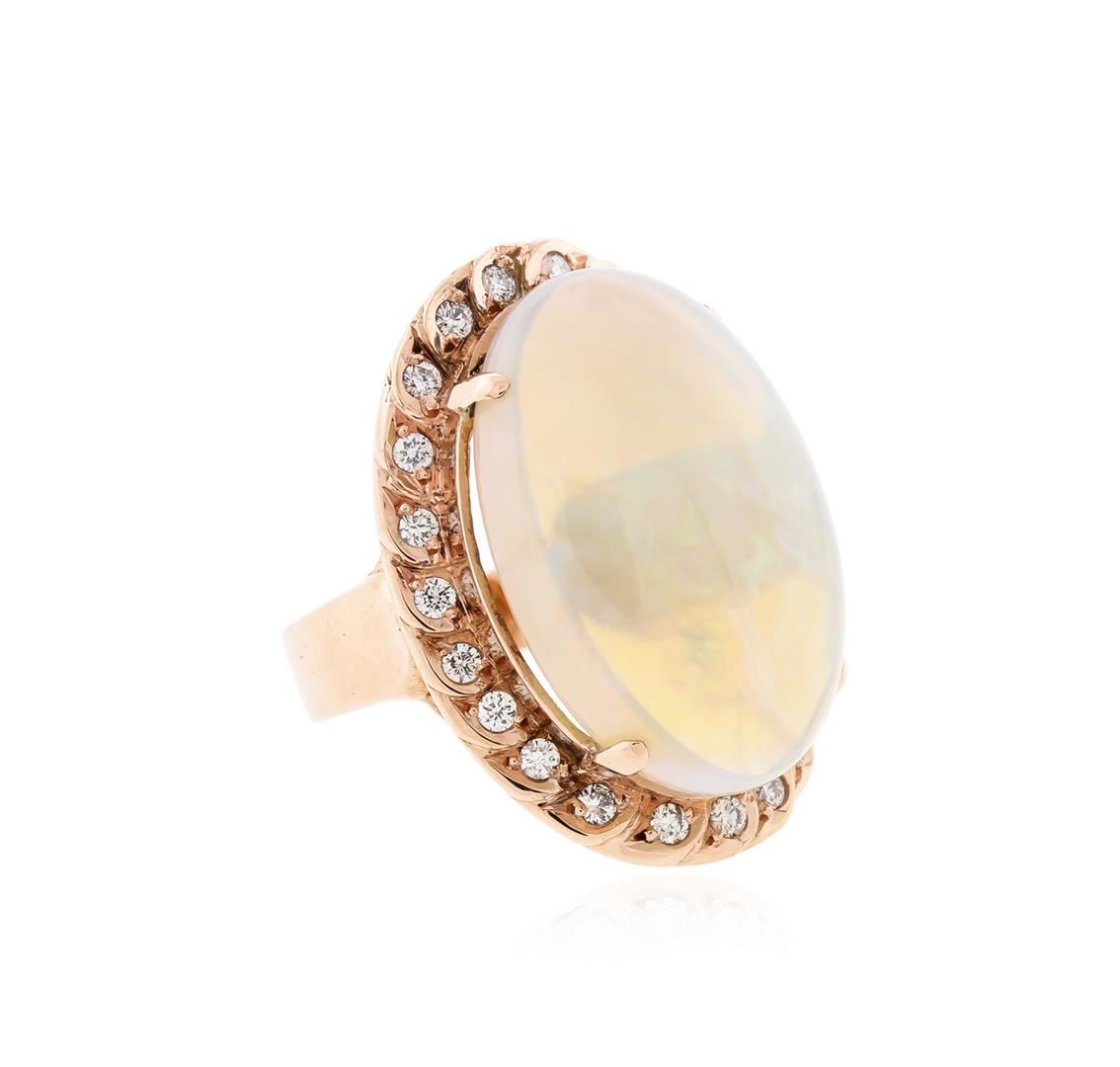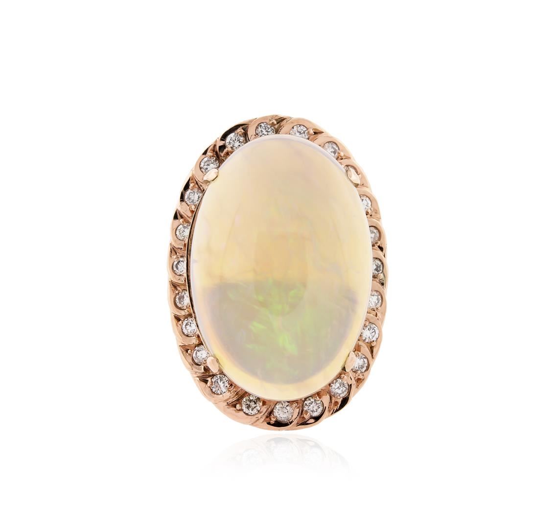 One electronically tested Gold-Rose-14KT ladies cast opal and diamond ring with a bright polish finish. Identified with markings of "14K". Condition is new. Containing: Twenty-Four prong set round brilliant cut diamonds, measuring 1.50 - 1.50 x 0.90mm (depth est.) approximate total weight of 24 Stones = 0.30ct. Clarity: SI-1 to SI-2. Color: H - I. One white opal that is cut in a oval shape and is prong set, measuring 24.00. mm long x 17.00. mm wide, and 6.00. mm thick and the approximate weight is 10.84 carats. The opal has a somewhat bright, blue-green play of color (fire) in a flashfire pattern; a medium dome; a good cut; no inclusions; consistent in its brightness and pattern; and is somewhat directional. Colored gemstones are presumed to have been subjected to commonly used enhancement processes. All diamonds and colored gemstones are graded in the mounting, unless otherwise stated. Total Weight of Diamonds 0.30ct. Total Weight of Opals 10.84ct. Total Weight of Ring 12.60 grams. GGL Appraised at $5,360.00.
