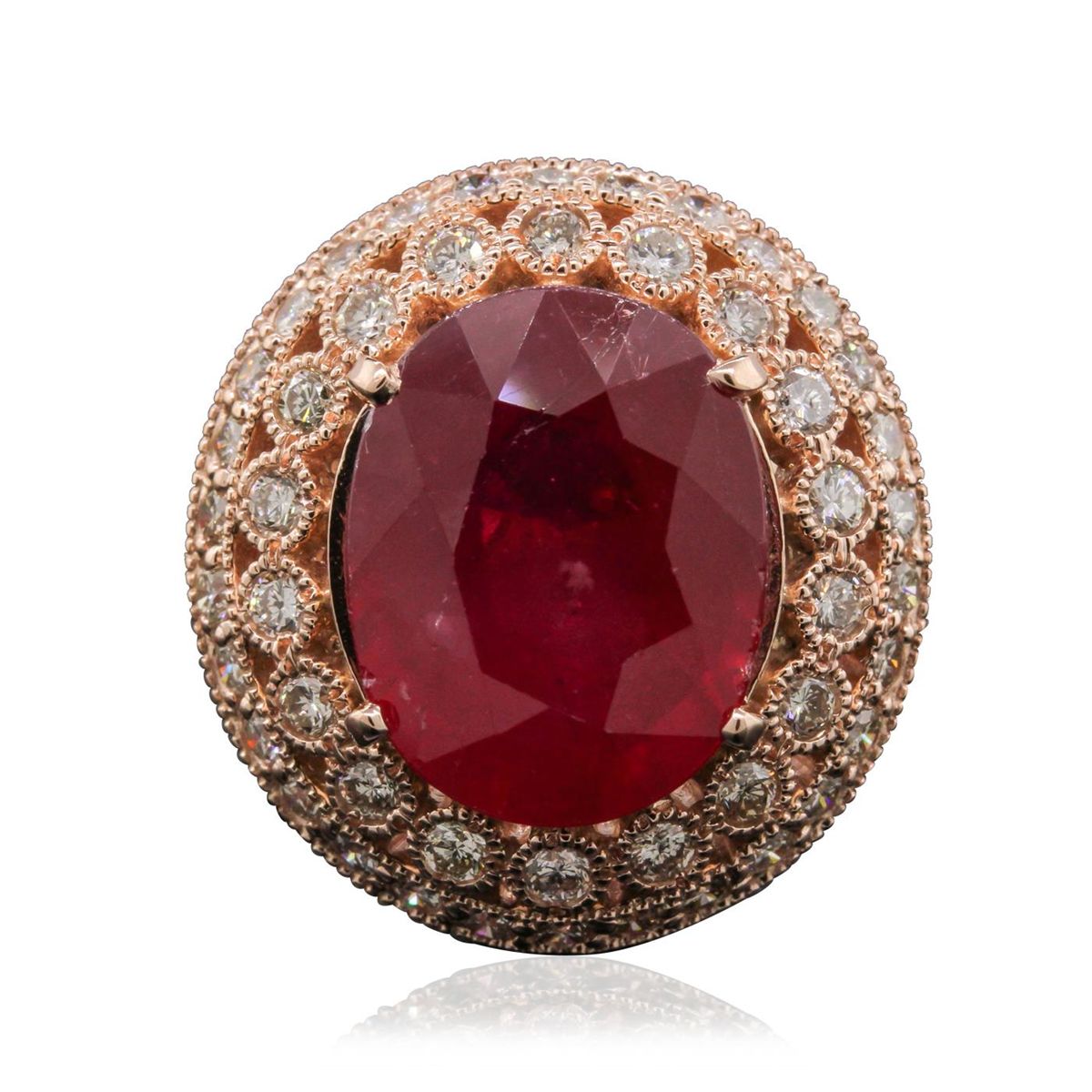 One electronically tested 14KT rose gold Ladies combination cast & assembled fancy ring with a bright polish finish. Condition is new. Identified with markings of "14K". Containing: One prong set oval modified mixed cut natural ruby, measuring 15.48 x 12.17 x 7.91mm, approximate weight of 12.37ct., clarity is heavily included, type II, medium dark, moderately strong, strongly purplish red color, (GIA stpR 6/4), cut is good. Colored gemstones are presumed to have been subjected to commonly used color/clarity enhancement processes. Fifty-Four prong set round brilliant cut diamonds, measuring 1.80 - 1.80 x 1.08mm (depth est.) approximate. Total Weight of 54 Stones = 1.78ct. Clarity: SI-1 to I-1. Color: K - L, Cut is Good. Total Weight of Colored Stones 12.37ct. Total Weight of Diamonds 1.78ct. Total Weight of Ring 11.90 grams. GGL Appraised at $11,200.00.