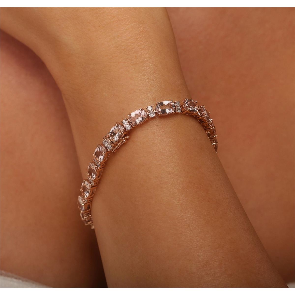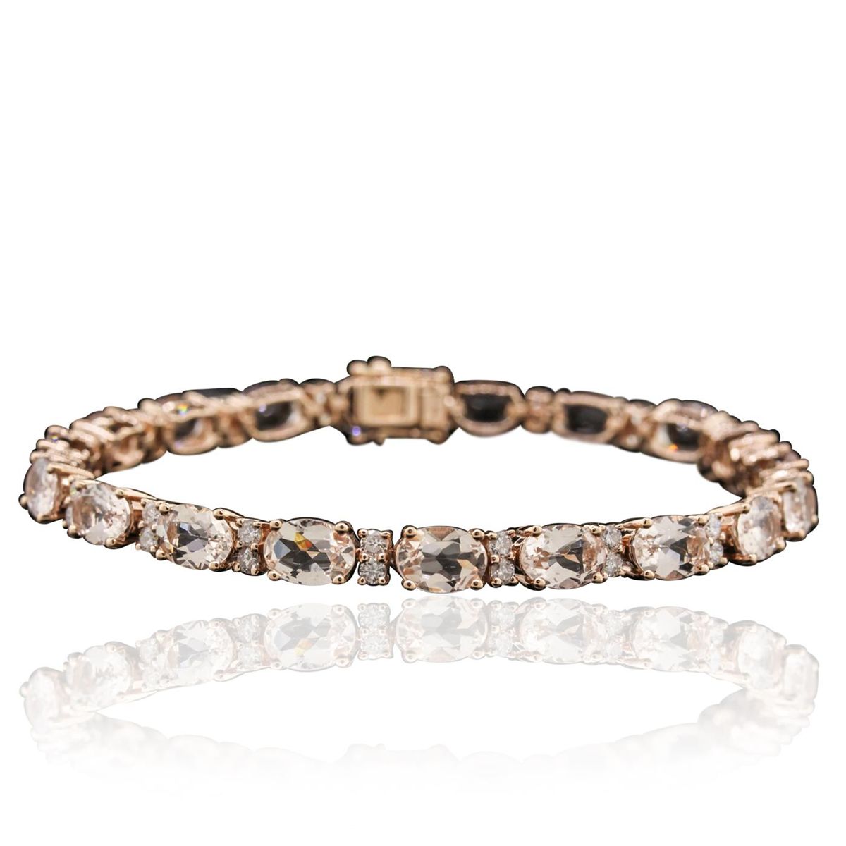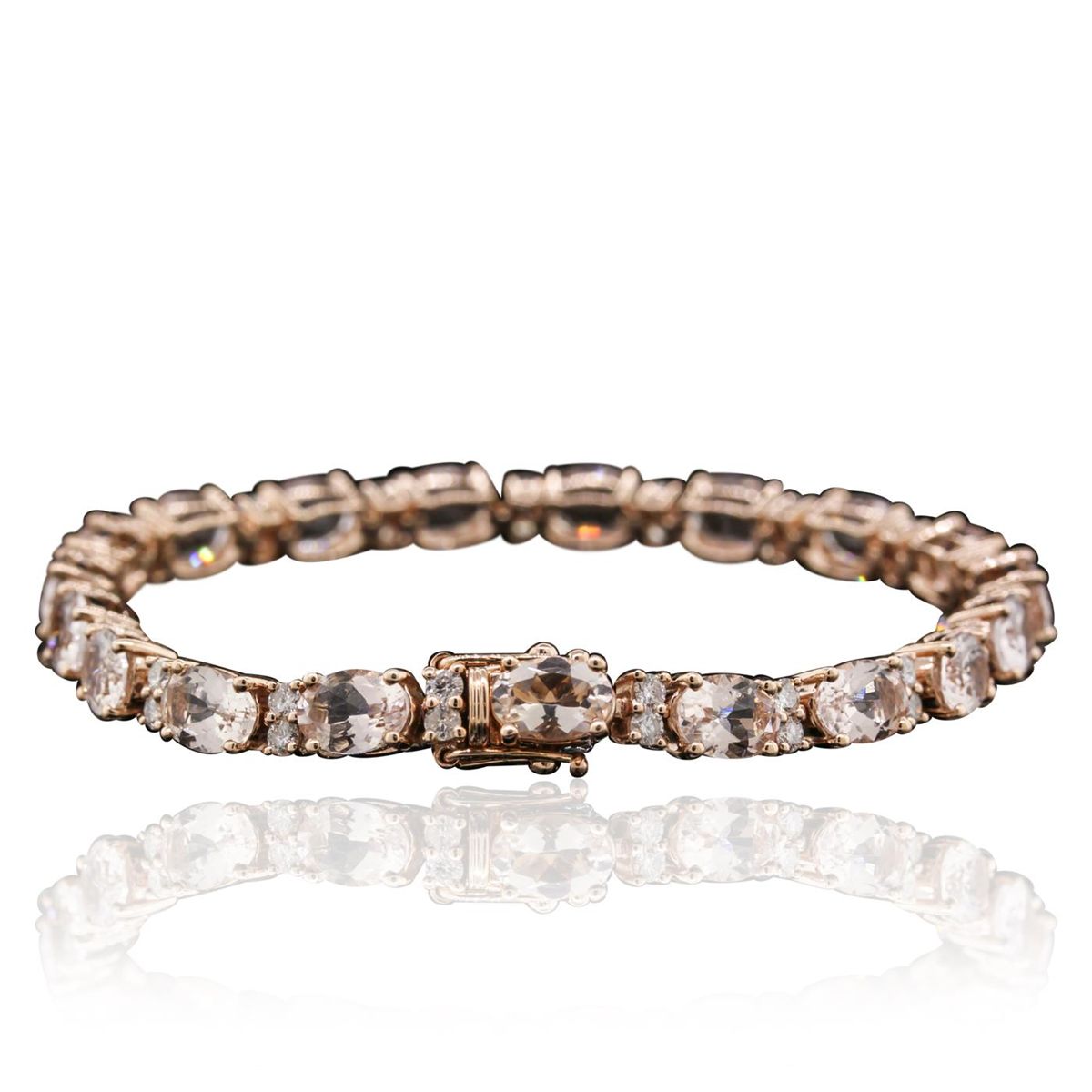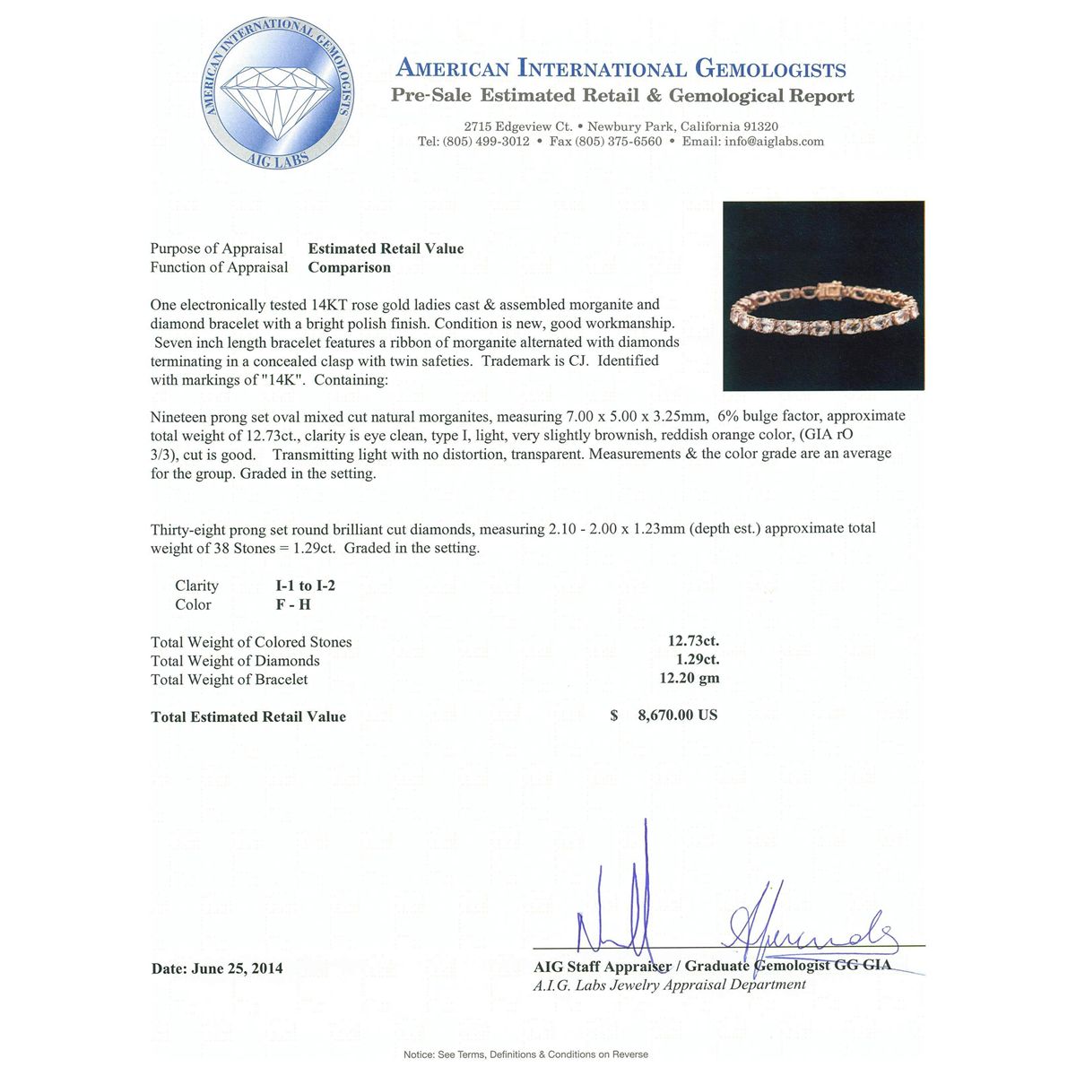 One electronically tested 14KT rose gold ladies cast & assembled morganite and diamond bracelet with a bright polish finish. Condition is new, good workmanship. Seven inch length bracelet features a ribbon of morganite alternated with diamonds terminating in a concealed clasp with twin safeties. Trademark is CJ. Identified with markings of "14K". Containing: Nineteen prong set oval mixed cut natural morganites, measuring 7.00 x 5.00 x 3.25mm, 6% bulge factor, approximate total weight of 12.73ct., clarity is eye clean, type I, light, very slightly brownish, reddish orange color, (GIA rO 3/3), cut is good. Transmitting light with no distortion, transparent. Measurements & the color grade are an average for the group. Graded in the setting. Thirty-Eight prong set round brilliant cut diamonds, measuring 2.10 - 2.00 x 1.23mm (depth est.) approximate total weight of 38 Stones = 1.29ct. Graded in the setting. Clarity I-1 to I-2. Color F - H. Total Weight of Colored Stones 12.73 ct. Total Weight of Diamonds 1.29 ct. Total Weight of Bracelet 12.20 grams. AIG Appraised at $8,670.00.