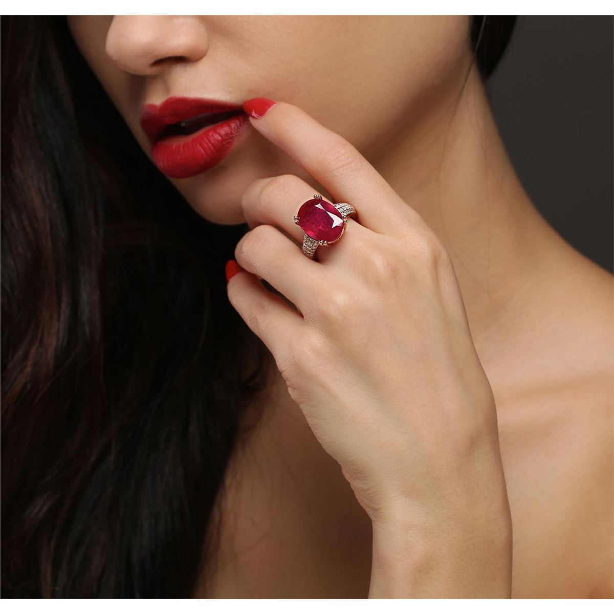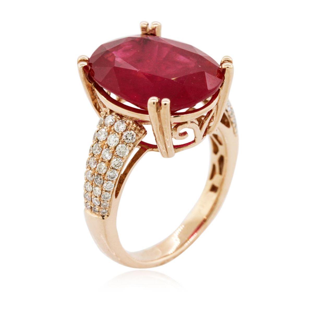 One electronically tested 14KT rose gold Ladies combination cast & assembled ring with a bright polish finish. Condition is new. Identified with markings of "14K". Containing: One prong set oval modified brilliant cut natural ruby, measuring 16.30 x 12.20 x 7.93mm, approximate weight of 12.88ct., clarity is heavily included, type II, medium, moderately strong, strongly purplish red color, (GIA stpR 5/4), cut is good. Colored gemstones are presumed to have been subjected to commonly used color/clarity enhancement processes. Sixty-Four prong set round brilliant cut diamonds, measuring 1.30 - 1.30 x 0.78mm (depth est.) approximate. Total Weight of 64 Stones = 0.51ct. . Clarity: I-1 to I-2. Color: I - J, Cut is Good. . Total Weight of Colored Stones 12.88ct. Total Weight of Diamonds 0.51ct. Total Weight of Ring 7.90 grams. GGL Appraised at $8,215.00.