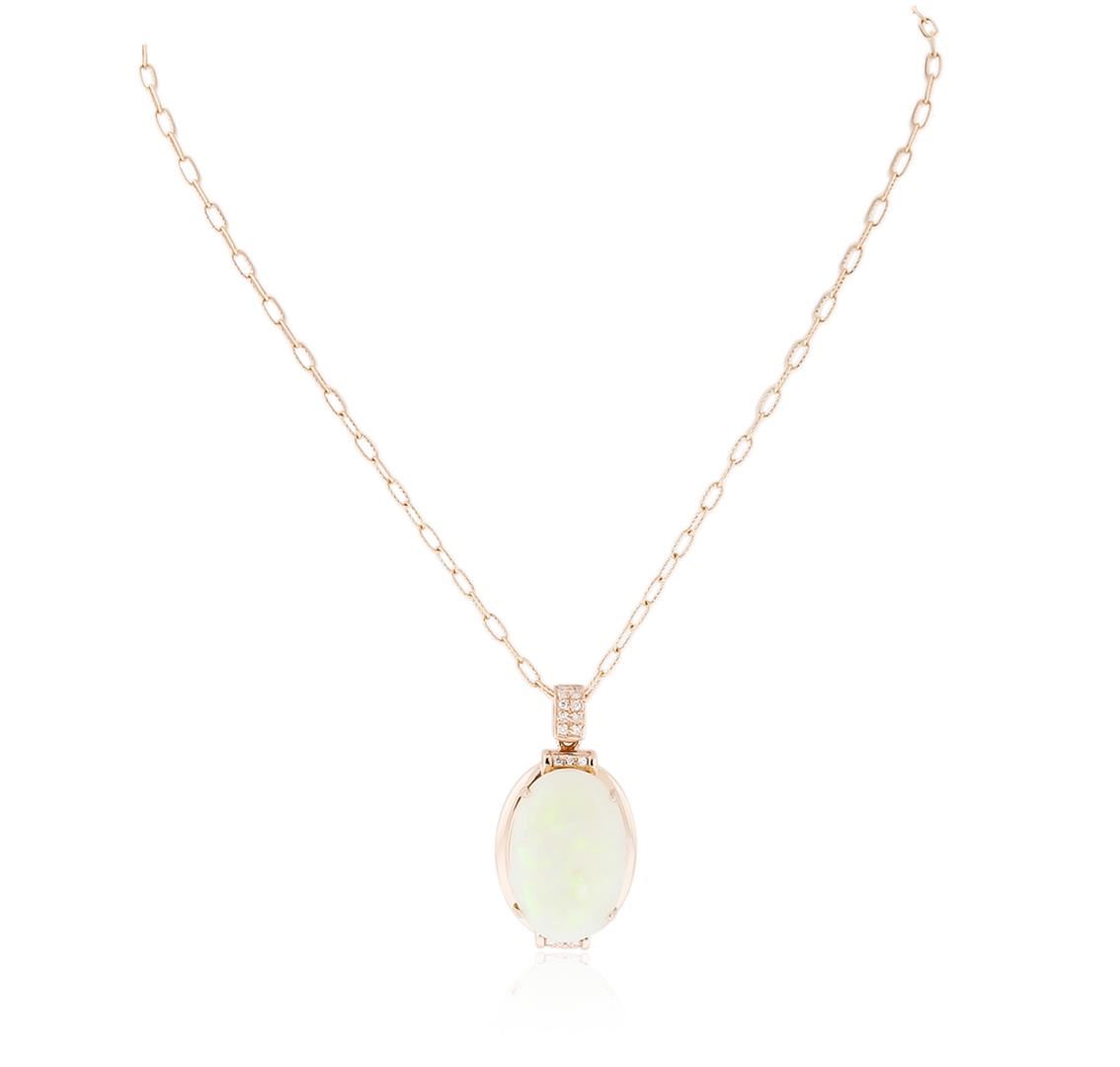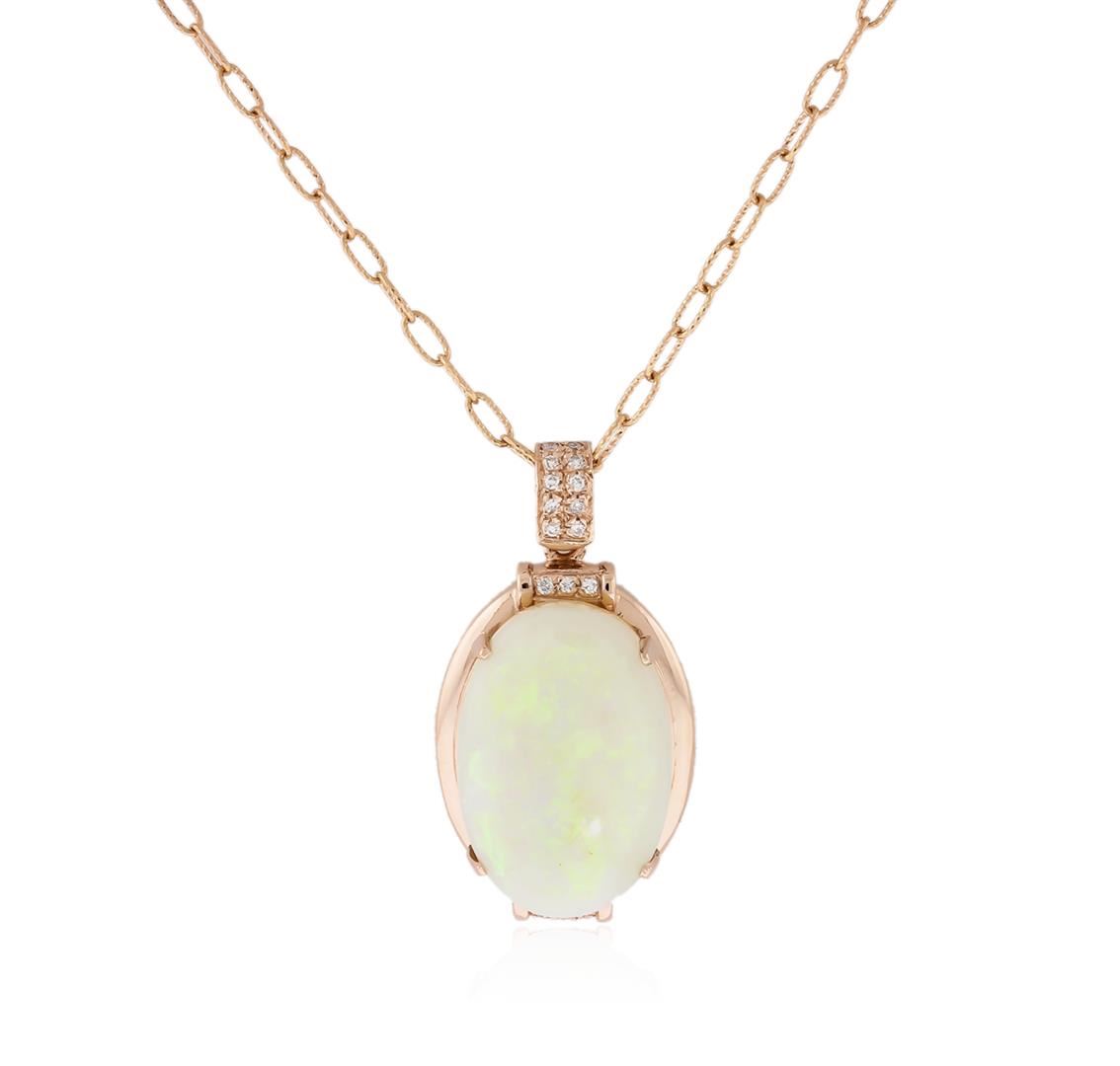 One electronically tested Gold-Rose-14KT ladies cast opal and diamond pendant & chain 18.0" long, with a lobster claw clasp with a bright polish finish. Identified with markings of "14K". Condition is new. Containing: One white opal that is cut in a oval shape and is prong set, measuring 26.00. mm long x 17.00. mm wide, and 6.50 mm thick and the approximate weight is 12.92 carats. The opal has a somewhat bright, green only play of color (fire) in a flashfire pattern; a medium dome; a good cut; no inclusions; consistent in its brightness and pattern; and is somewhat directional. Twenty prong set round brilliant cut diamonds, measuring 1.30 - 1.30 x 0.78mm (depth est.) approximate total weight of 20 Stones = 0.16ct. Clarity: I-1 to I-2. Color: I - J. Colored gemstones are presumed to have been subjected to commonly used enhancement processes. All diamonds and colored gemstones are graded in the mounting, unless otherwise stated. Total Weight of Diamonds 0.16ct. Total Weight of Opals 12.92ct. Total Weight of Pendant & Chain 15.90 grams. GGL Appraised at $5,500.00.