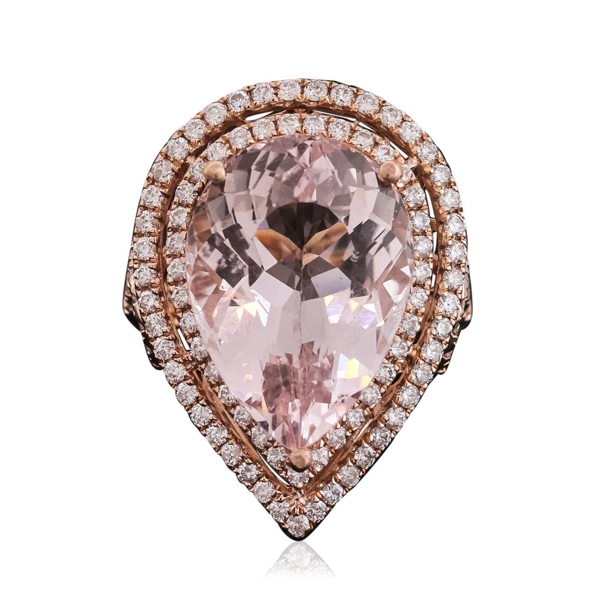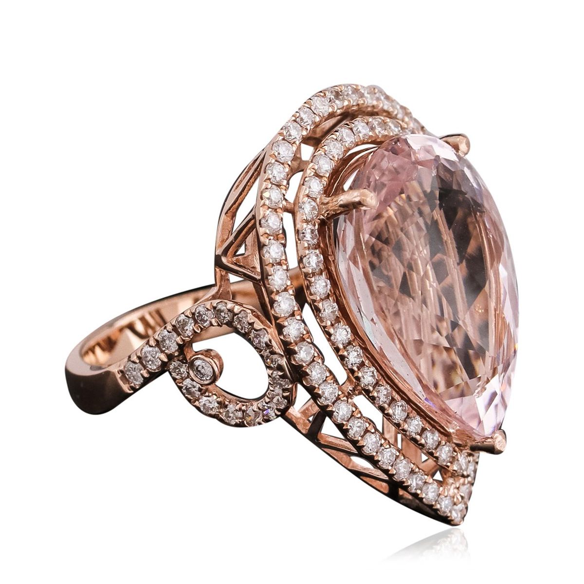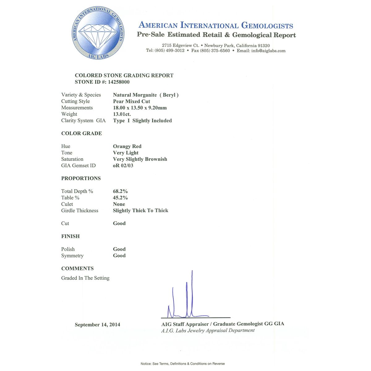One electronically tested 14KT rose gold ladies cast morganite & diamond ring with a bright finish. The featured morganite is set within tiered diamond bezels, supported by diamond set shoulders, completed by a three millimeter wide band. Condition is new, good workmanship. Containing: One prong set pear mixed cut natural morganite, measuring 18.00 x 13.50 x 9.20mm, 7% bulge factor, approximate weight of 13.01ct., clarity is slightly included, type I, very light, very slightly brownish, orangy red color, (GIA oR 2/3), cut is good. Transmitting light with no distortion, transparent. Naturally occurring internal & external characteristics are present. Graded in the setting. One Hundred Sixteen prong set round brilliant cut diamonds, measuring 1.45 - 1.30 x 0.83mm (depth est.) approximate total weight of 116 Stones = 1.12ct. Graded in the setting. Clarity: SI-2 to I-1. Color: G - H. Total Weight of Colored Stones 13.01ct. Total Weight of Diamonds 1.12ct. Total Weight of Ring 9.43 grams. AIG Appraised at $11,880.00.