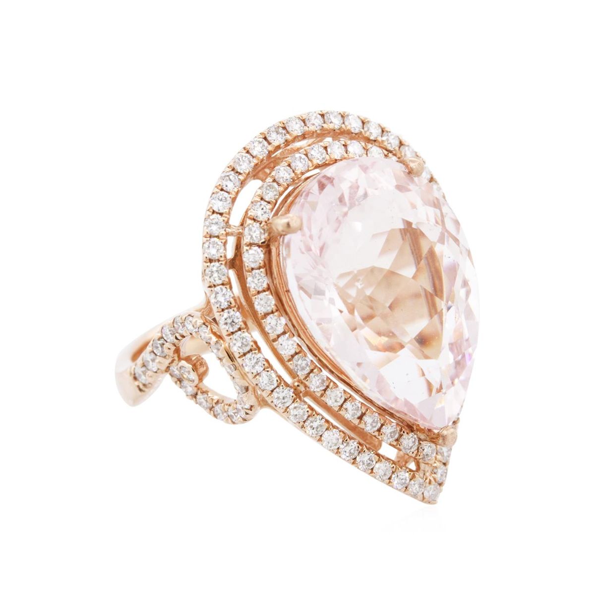 One electronically tested 14KT rose gold ladies cast morganite & diamond ring with a bright finish. The featured morganite is set within tiered diamond bezels, supported by diamond set shoulders, completed by a three millimeter wide band. Condition is new, good workmanship. Containing: One prong set pear mixed cut natural morganite, measuring 18.00 x 13.50 x 9.20mm, 7% bulge factor, approximate weight of 13.01ct., clarity is slightly included, type I, very light, very slightly brownish, orangy red color, (GIA oR 2/3), cut is good. Transmitting light with no distortion, transparent. Naturally occurring internal & external characteristics are present. Graded in the setting. One Hundred Sixteen prong set round brilliant cut diamonds, measuring 1.45 - 1.30 x 0.83mm (depth est.) approximate total weight of 116 Stones = 1.12ct. Graded in the setting. Clarity: SI-2 to I-1. Color: G - H. Total Weight of Colored Stones 13.01ct. Total Weight of Diamonds 1.12ct. Total Weight of Ring 9.43 grams. AIG Appraised at $11,880.00.