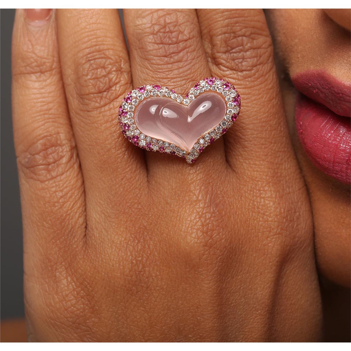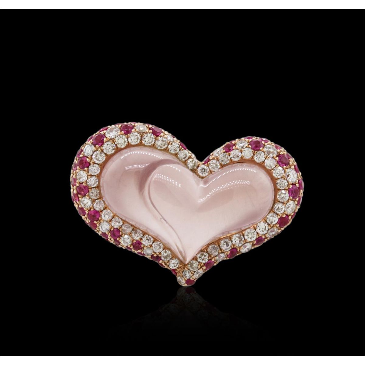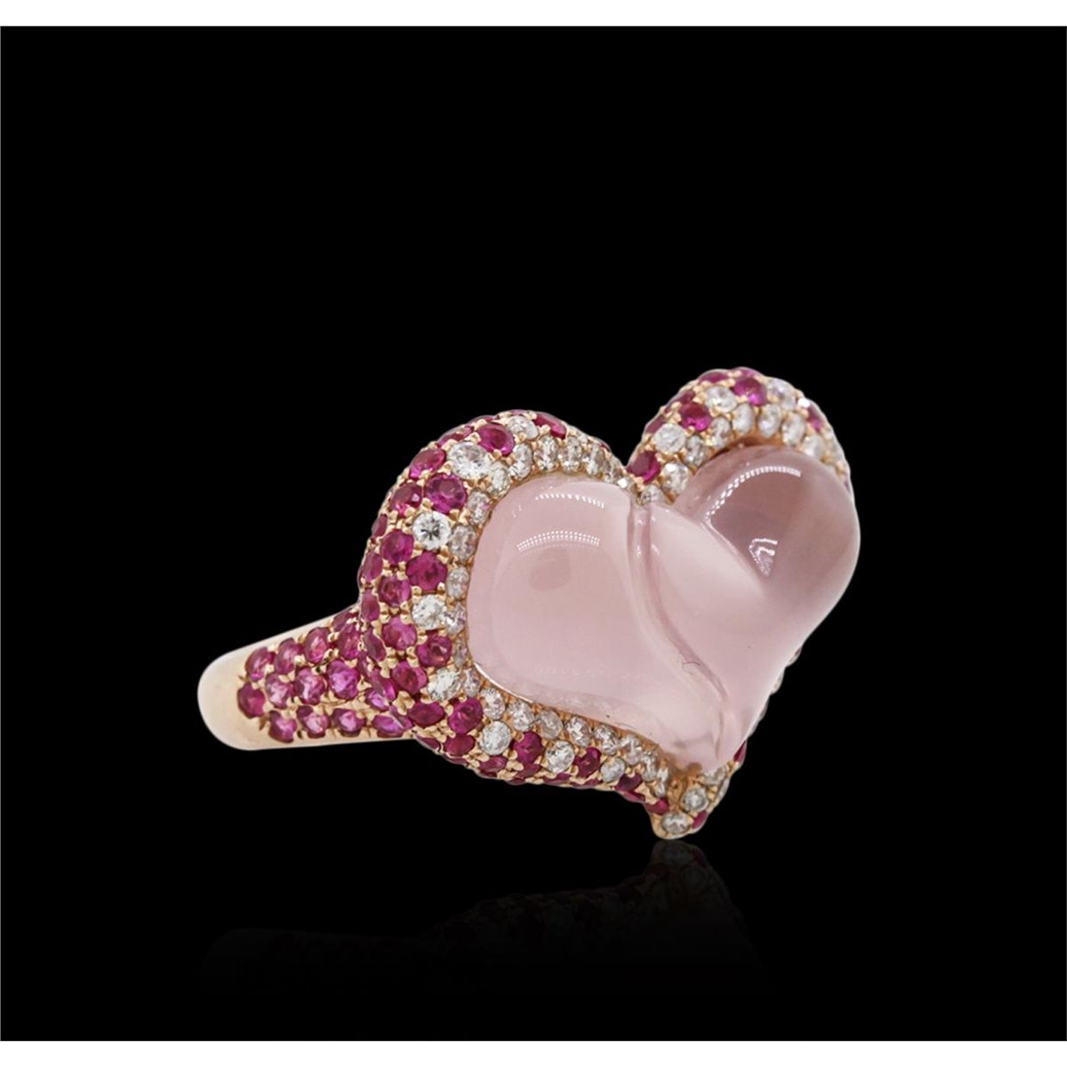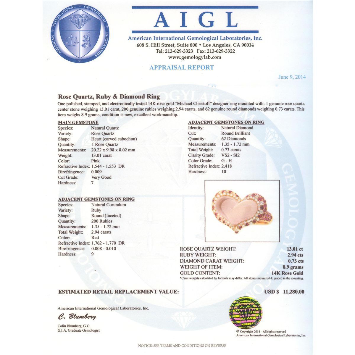 One polished, stamped, and electronically tested 14KT rose gold Michael Christoff designer ring mounted with: 1 genuine rose quartz center stone weighing 13.01cts, 200 genuine rubies weighing 2.94cts. And 62 genuine diamonds weighing 0.73cts. This item weighs 8.90 grams, condition is new, excellent workmanship. AIGL Appraised at $11,280.00.
