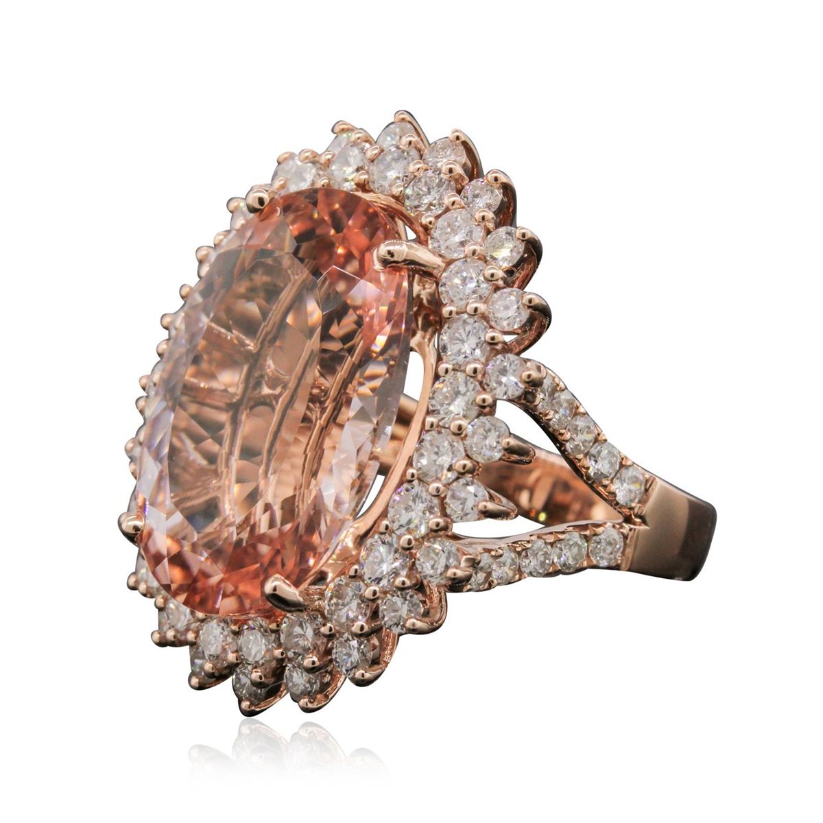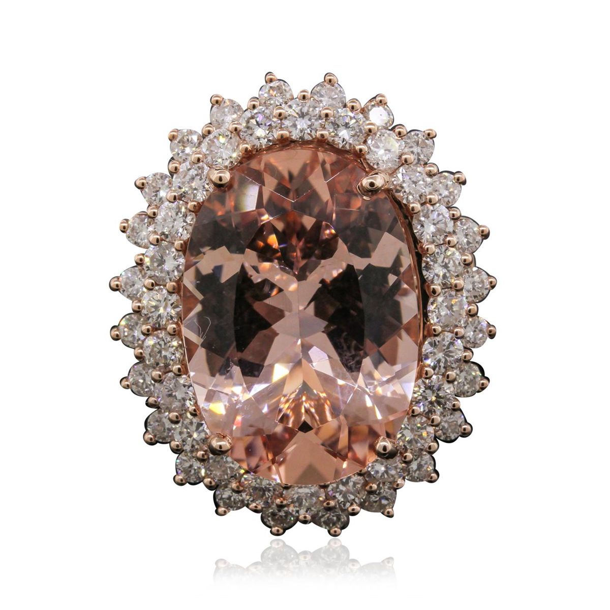One electronically tested 14KT rose gold Ladies combination cast & assembled fashion ring with a bright polish finish. Condition is new. Identified with markings of "14K". Containing: One prong set oval modified mixed cut natural morganite, measuring 20.00 x 14.00 x 8.65mm, approximate weight of 13.41ct., clarity is eye clean, type I, light, slightly brownish, red orange color, (GIA RO 3/2), cut is very good. Colored gemstones are presumed to have been subjected to commonly used and possible undetectable color/clarity enhancement processes. Twenty prong set round brilliant cut diamonds, measuring 2.00 - 2.00 x 1.20mm (depth est.) approximate. Total Weight of 20 Stones = 0.25ct. Clarity: SI-1 to SI-2. Color: G, Cut is Good. Forty-Eight prong set round brilliant cut diamonds, measuring 2.50 - 2.50 x 1.50mm (depth est.) approximate. Total Weight of 48 Stones = 2.74ct. Clarity: SI-1 to SI-2. Color: H - I, Cut is Good. Total Weight of Colored Stones 13.41ct. Total Weight of Diamonds 2.99ct. Total Weight of Ring 11.10 grams. GGL Appraised at $16,040.00.