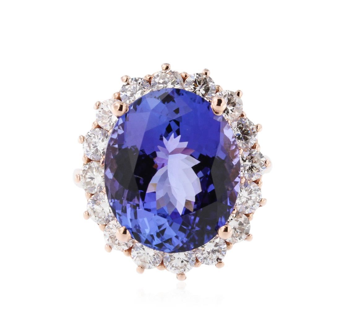 One electronically tested 14KT rose gold ladies cast tanzanite and diamond ring with a bright polish finish. Identified with markings of "K14". Condition is new. Containing: One prong set oval modified brilliant cut natural tanzanite, measuring 16.32 x 14.00 x 8.90mm, approximate weight of 14.31ct., clarity is eye clean, type I, medium light, very slightly grayish, bluish violet color, (GIA bV 4/3), cut is good. Sixteen prong set round brilliant cut diamonds, measuring 3.50 - 3.50 x 2.10mm (depth est.) approximate total weight of 16 Stones = 2.51ct. Clarity: SI-1 to I-1. Color: H - I, Cut is Good. Colored gemstones are presumed to have been subjected to commonly used enhancement processes. All diamonds and colored gemstones are graded in the mounting, unless otherwise stated. Total Weight of Colored Stones 14.31ct. Total Weight of Diamonds 2.51ct. Total Weight of Ring 10.60 grams. GGL Appraised at $19,525.00.