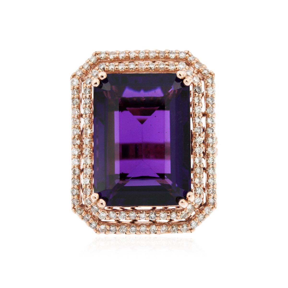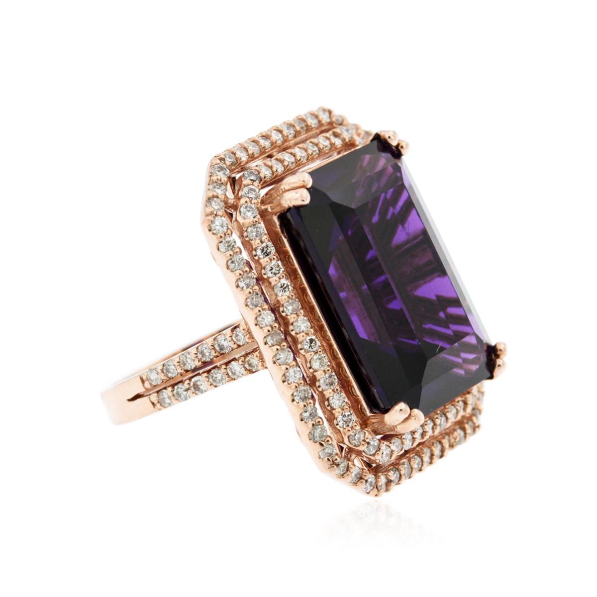 One electronically tested 14KT rose gold Ladies combination cast & assembled ring with a bright polish finish. Condition is new. Identified with markings of "K14". Containing: One prong set emerald standard step cut natural amethyst, measuring 17.96 x 13.10 x 8.50mm, approximate weight of 14.36ct., clarity is eye clean, type II, medium dark, moderately strong, purple color, (GIA P 6/4), cut is very good. Colored gemstones are presumed to have been subjected to commonly used color/clarity enhancement processes. One Hundred Sixteen prong set round brilliant cut diamonds, measuring 1.30 - 1.30 x 0.78mm (depth est.) approximate. Total Weight of 116 Stones = 1.01ct. Clarity: I-1 to I-2. Color: K - L, Cut is Good. Total Weight of Colored Stones 14.36ct. Total Weight of Diamonds 1.01ct. Total Weight of Ring 11.90 grams. GGL Appraised at $7,230.00.