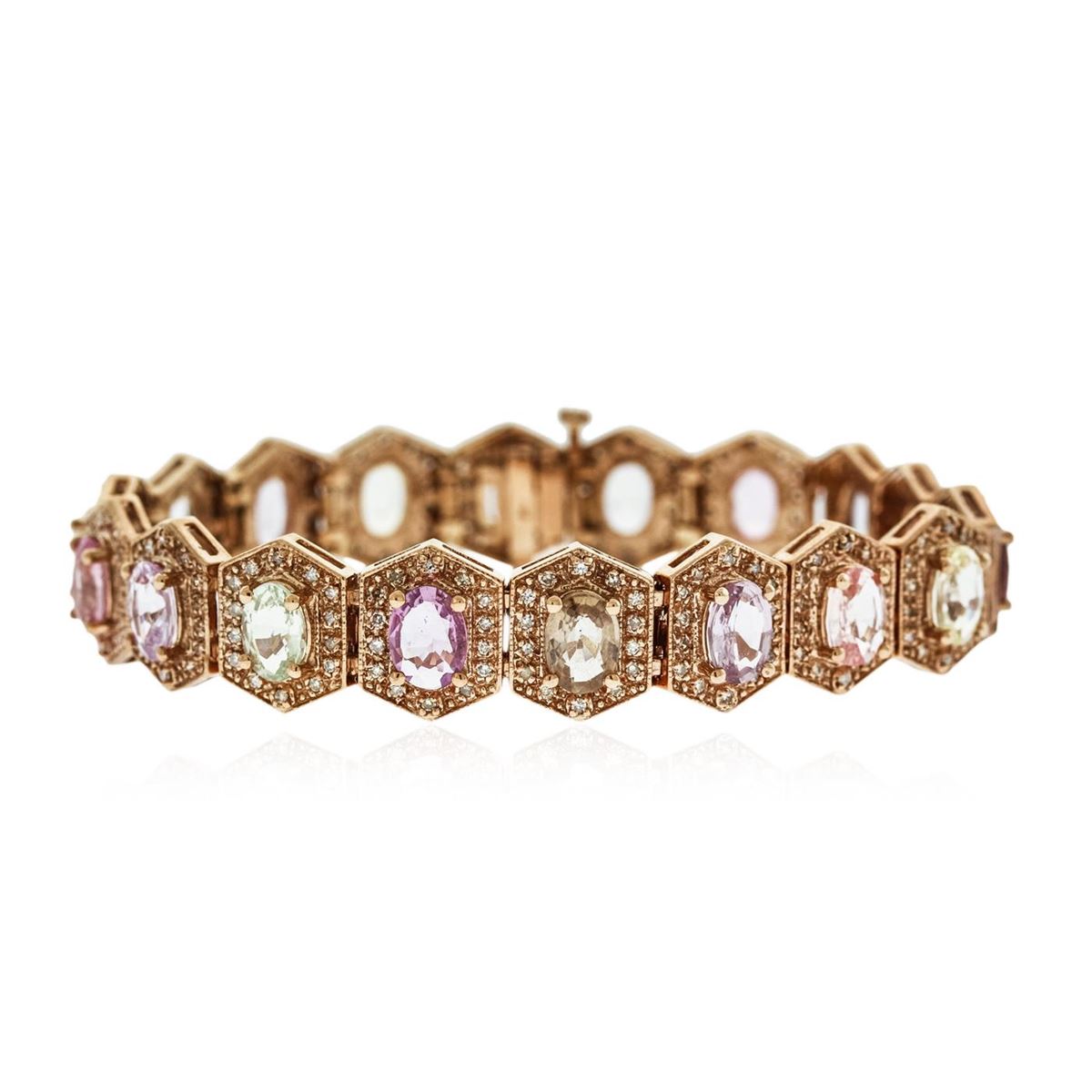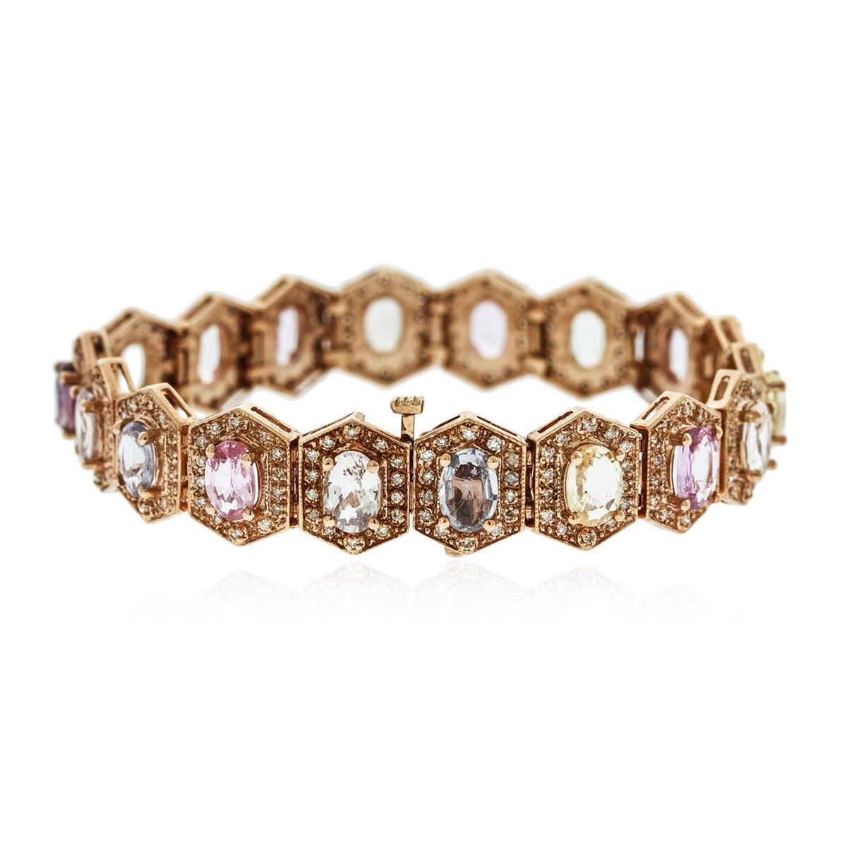 One electronically tested 14KT rose gold ladies combination cast & assembled bracelet with a hidden box clasp with a bright polish finish. Measurements: 6.85" in length. Identified with markings of "14K". Condition is new. Containing: Eighteen prong set oval modified brilliant cut natural multi-color sapphires, measuring 7.00 x 5.00 x 2.78mm, approximate total Weight of 14.40ct., clarity is slightly included, type II, medium light, very slightly grayish, green, purple, pink and blue color, (GIA vB 4/3), cut is good. Two Hundred Fifty-Two prong set round brilliant cut diamonds, measuring 1.20 - 1.20 x 0.72mm (depth est.) approximate total weight of 252 Stones = 1.68ct. Clarity: I-1 to I-2. Color: J - K, Cut is Good. Colored gemstones are presumed to have been subjected to commonly used enhancement processes. All diamonds and colored gemstones are graded in the mounting, unless otherwise stated. Total Weight of Colored Stones 14.40ct. Total Weight of Diamonds 1.68ct. Total Weight of Bracelet 28.00 grams. GGL Appraised at $14,925.00.