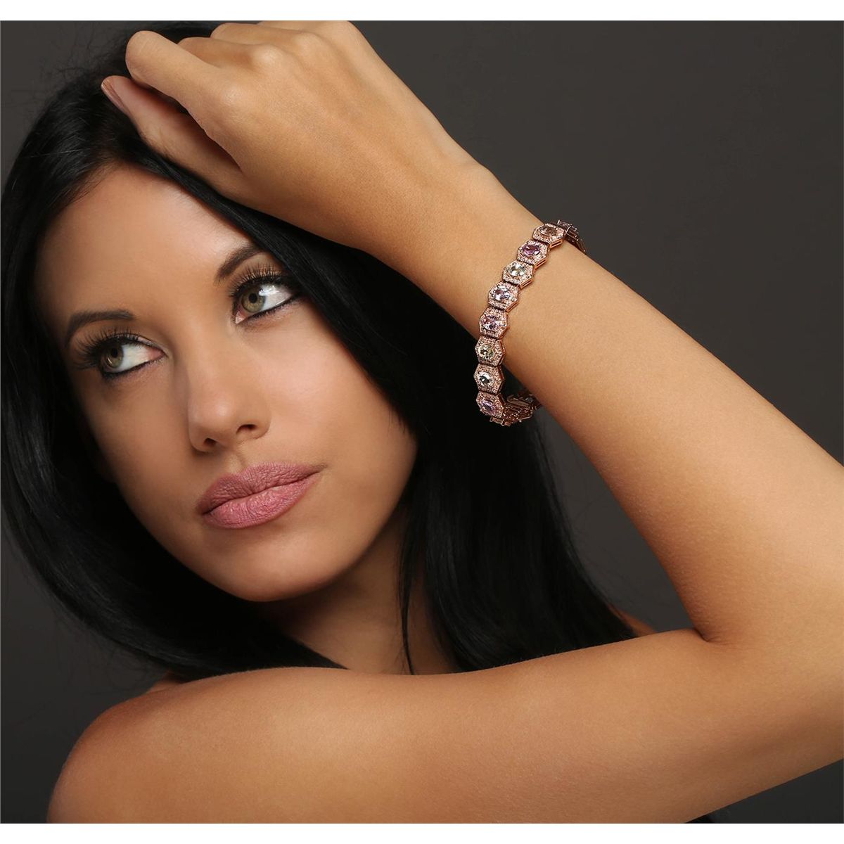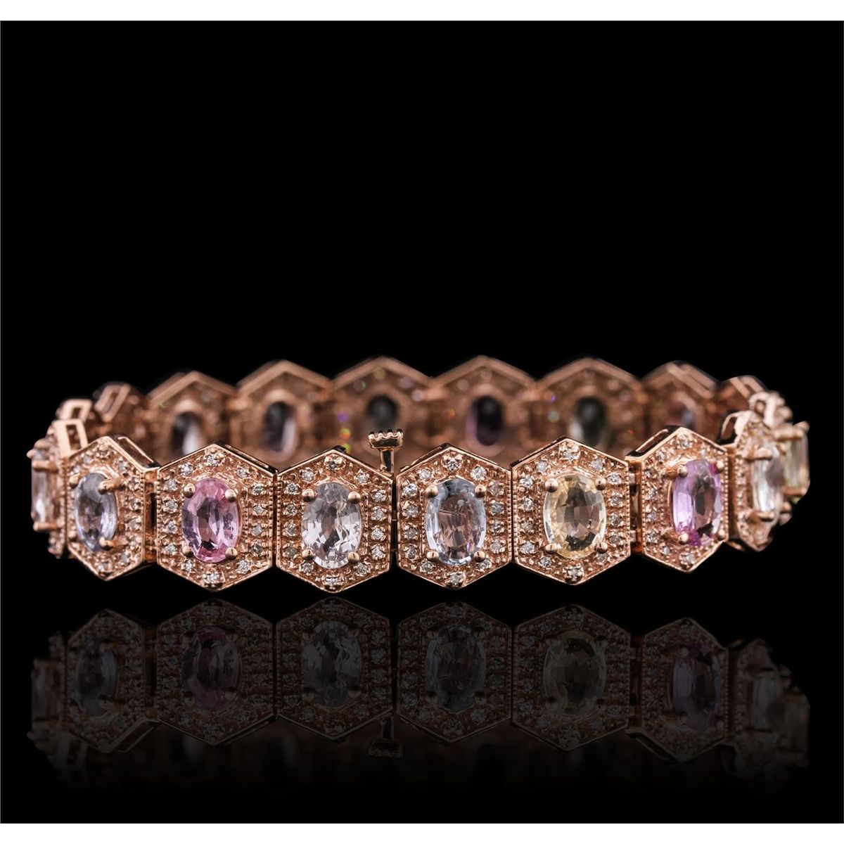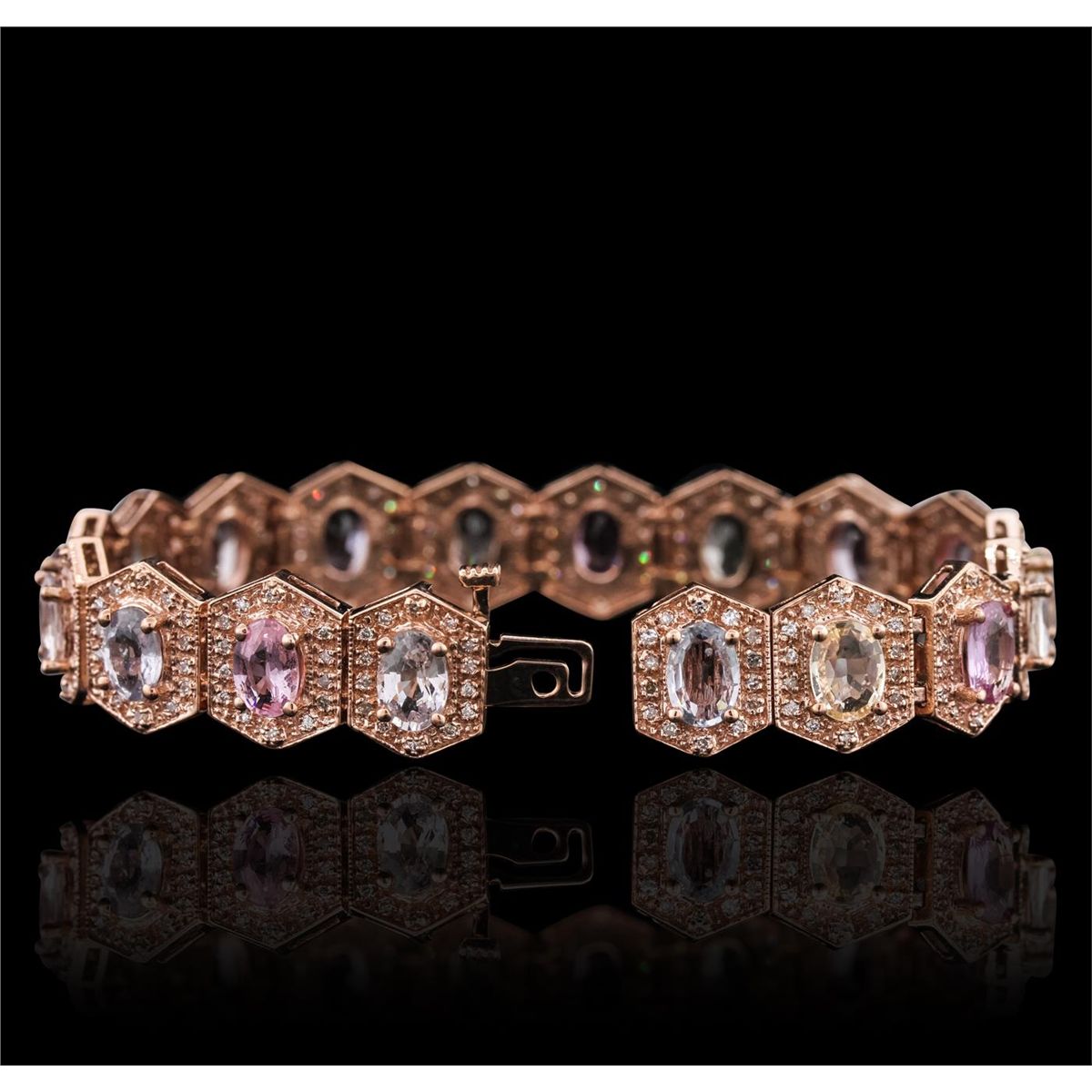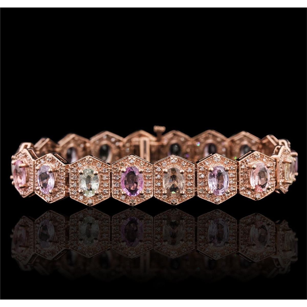 14KT Rose Gold 14.40ctw Multi-Color Sapphire and Diamond Bracelet. One electronically tested 14KT rose gold ladies combination cast & assembled bracelet with a hidden box clasp with a bright polish finish. Measurements: 6.85" in length. Identified with markings of "14K". Condition is new. Containing: Eighteen prong set oval modified brilliant cut natural multi-color sapphires, measuring 7.00 x 5.00 x 2.78mm, approximate total Weight of 14.40ct., clarity is slightly included, type II, medium light, very slightly grayish, green, purple, pink and blue color, (GIA vB 4/3), cut is good. Two Hundred Fifty-Two prong set round brilliant cut diamonds, measuring 1.20 - 1.20 x 0.72mm (depth est.) approximate total weight of 252 Stones = 1.68ct. Clarity: I-1 to I-2. Color: J - K, Cut is Good. Colored gemstones are presumed to have been subjected to commonly used enhancement processes. All diamonds and colored gemstones are graded in the mounting, unless otherwise stated. Total Weight of Colored Stones 14.40ct. Total Weight of Diamonds 1.68ct. Total Weight of Bracelet 28.00 grams. GGL Appraised at $14,925.00.