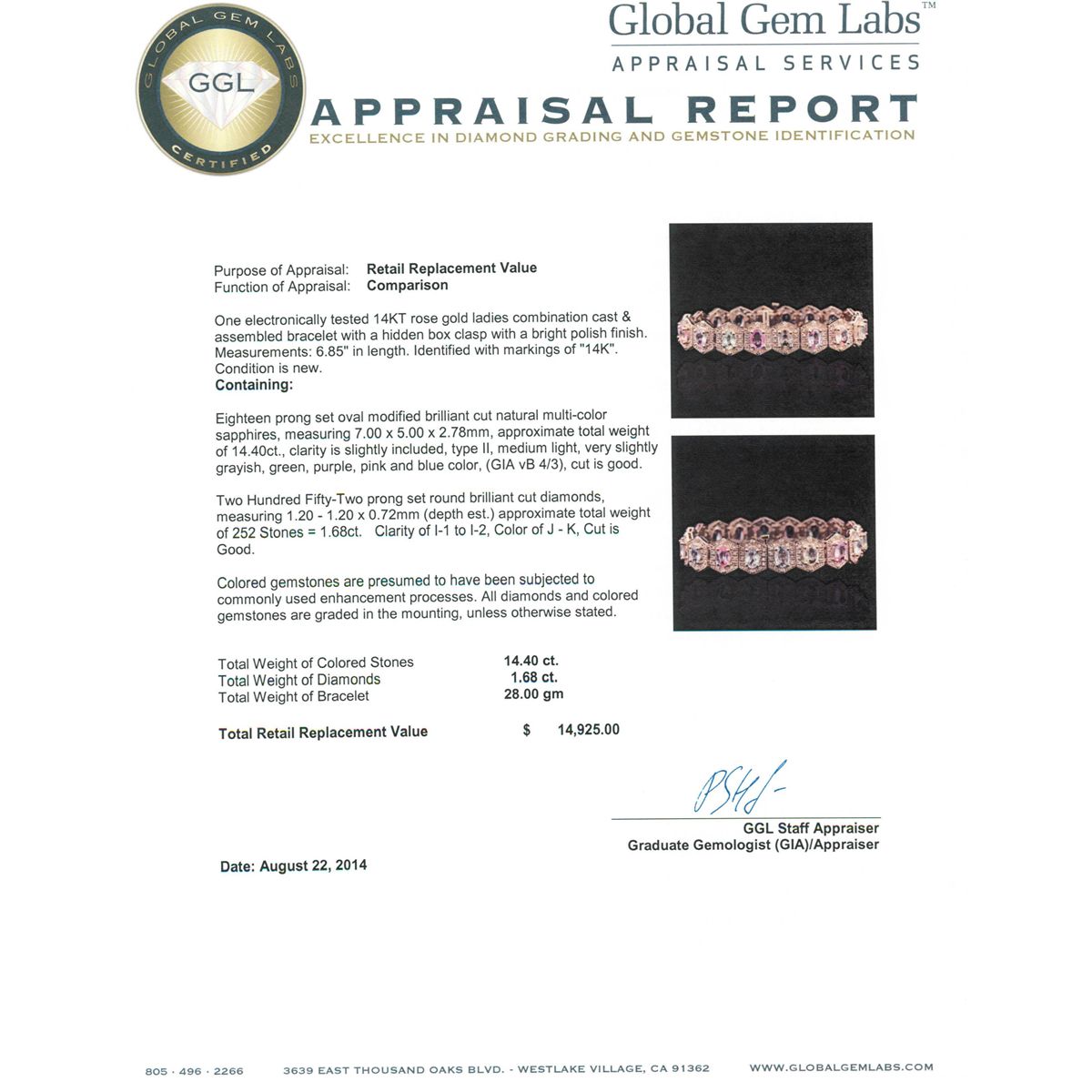 14KT Rose Gold 14.40ctw Multi-Color Sapphire and Diamond Bracelet. One electronically tested 14KT rose gold ladies combination cast & assembled bracelet with a hidden box clasp with a bright polish finish. Measurements: 6.85" in length. Identified with markings of "14K". Condition is new. Containing: Eighteen prong set oval modified brilliant cut natural multi-color sapphires, measuring 7.00 x 5.00 x 2.78mm, approximate total Weight of 14.40ct., clarity is slightly included, type II, medium light, very slightly grayish, green, purple, pink and blue color, (GIA vB 4/3), cut is good. Two Hundred Fifty-Two prong set round brilliant cut diamonds, measuring 1.20 - 1.20 x 0.72mm (depth est.) approximate total weight of 252 Stones = 1.68ct. Clarity: I-1 to I-2. Color: J - K, Cut is Good. Colored gemstones are presumed to have been subjected to commonly used enhancement processes. All diamonds and colored gemstones are graded in the mounting, unless otherwise stated. Total Weight of Colored Stones 14.40ct. Total Weight of Diamonds 1.68ct. Total Weight of Bracelet 28.00 grams. GGL Appraised at $14,925.00.