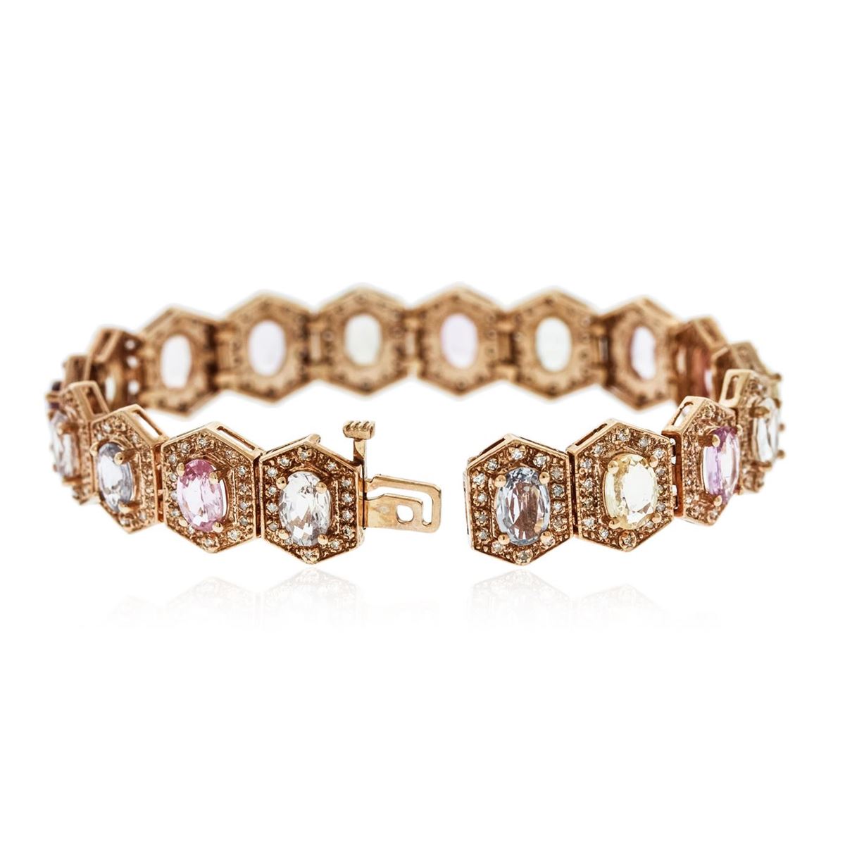 One electronically tested 14KT rose gold ladies combination cast & assembled bracelet with a hidden box clasp with a bright polish finish. Measurements: 6.85" in length. Identified with markings of "14K". Condition is new. Containing: Eighteen prong set oval modified brilliant cut natural multi-color sapphires, measuring 7.00 x 5.00 x 2.78mm, approximate total Weight of 14.40ct., clarity is slightly included, type II, medium light, very slightly grayish, green, purple, pink and blue color, (GIA vB 4/3), cut is good. Two Hundred Fifty-Two prong set round brilliant cut diamonds, measuring 1.20 - 1.20 x 0.72mm (depth est.) approximate total weight of 252 Stones = 1.68ct. Clarity: I-1 to I-2. Color: J - K, Cut is Good. Colored gemstones are presumed to have been subjected to commonly used enhancement processes. All diamonds and colored gemstones are graded in the mounting, unless otherwise stated. Total Weight of Colored Stones 14.40ct. Total Weight of Diamonds 1.68ct. Total Weight of Bracelet 28.00 grams. GGL Appraised at $14,925.00.