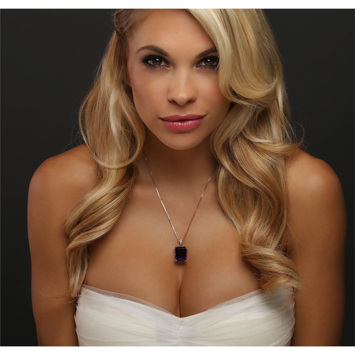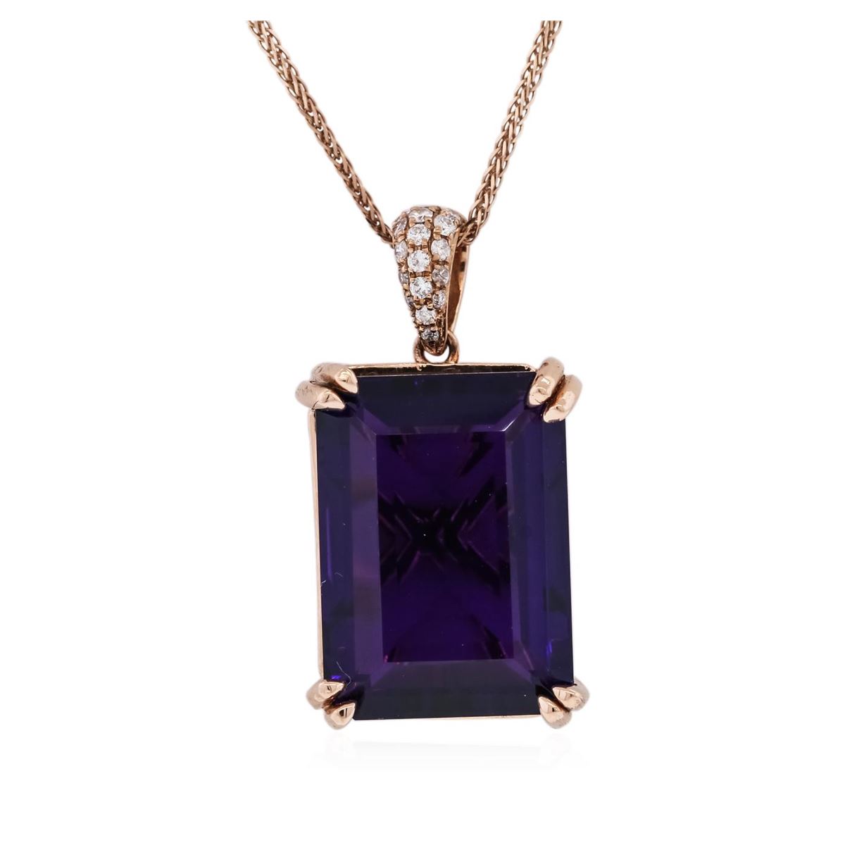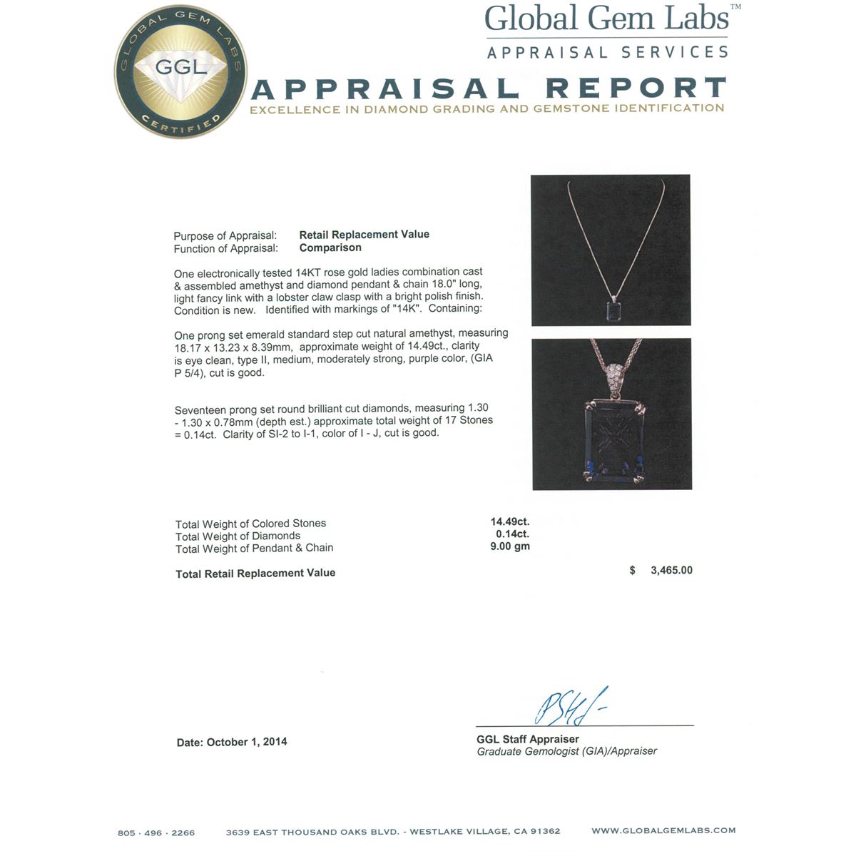 One electronically tested 14KT rose gold ladies combination cast & assembled amethyst and diamond pendant & chain 18.0" long, light fancy link with a lobster claw clasp with a bright polish finish. Identified with markings of "14K". Condition is new. Containing: One prong set emerald standard step cut natural amethyst, measuring 18.17 x 13.23 x 8.39mm, approximate weight of 14.49ct., clarity is eye clean, type II, medium, moderately strong, purple color, (GIA P 5/4), cut is good. Seventeen prong set round brilliant cut diamonds, measuring 1.30 - 1.30 x 0.78mm (depth est.) approximate total weight of 17 Stones = 0.14ct. Clarity: SI-2 to I-1. Color: I - J, Cut is Good. Total Weight of Colored Stones 14.49ct. Total Weight of Diamonds 0.14ct. Total Weight of Pendant & Chain 9.00. grams. GGL Appraised at $3,465.00.