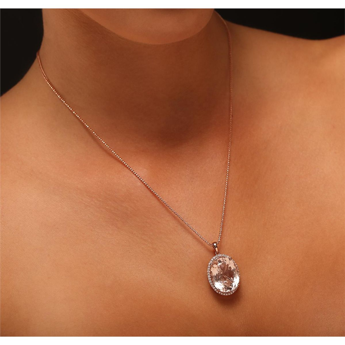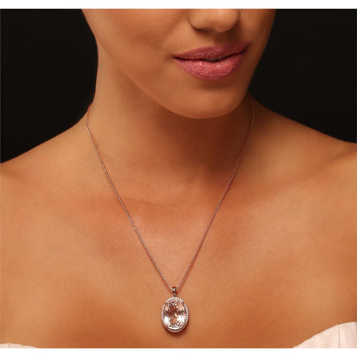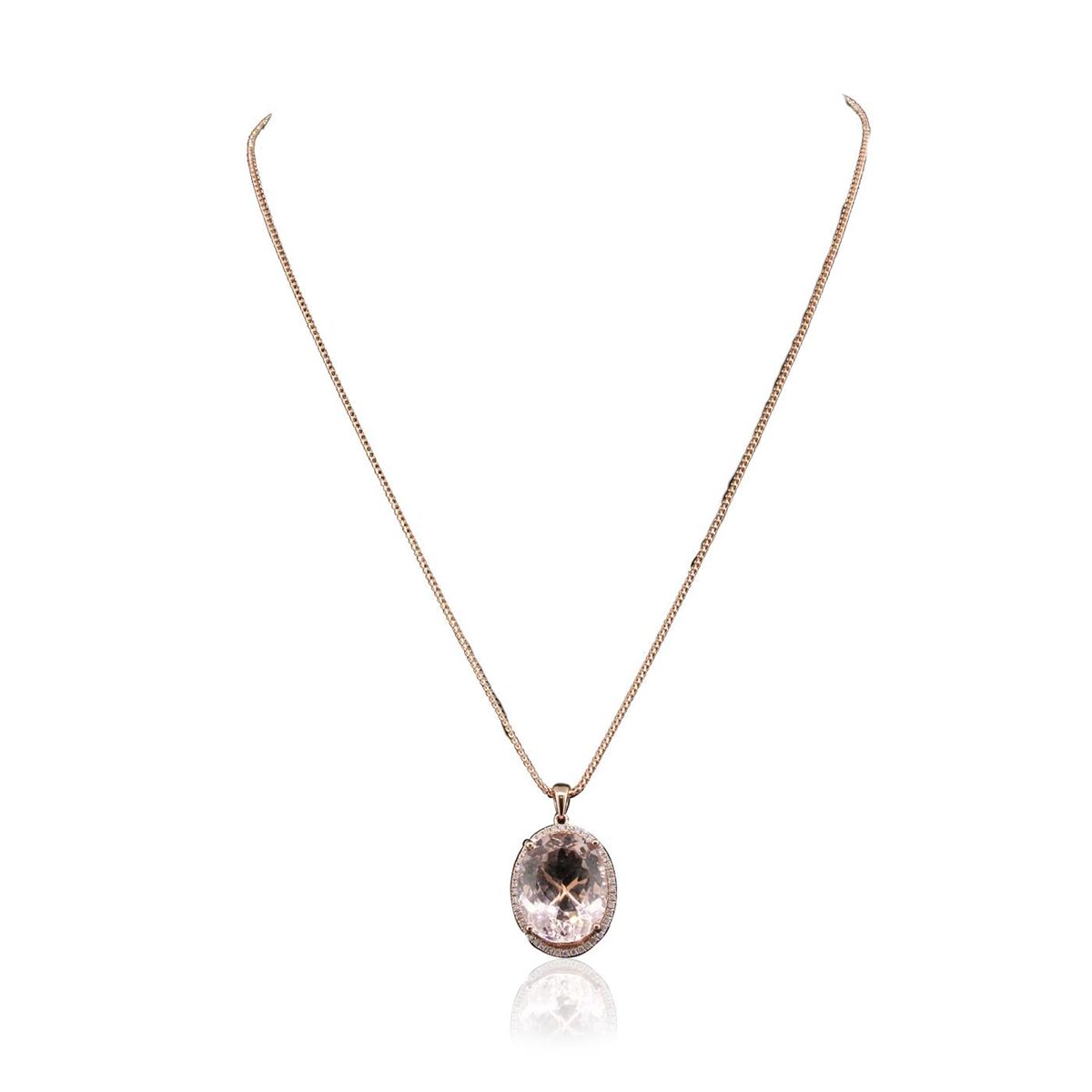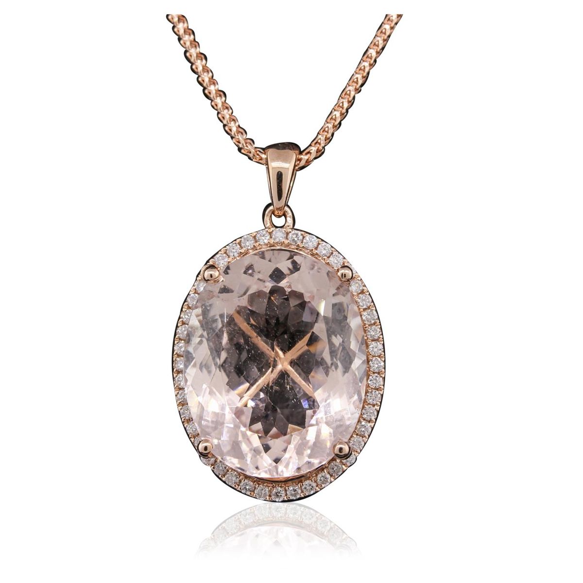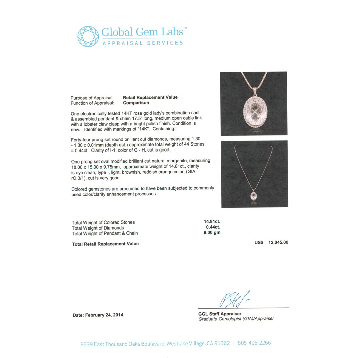 One electronically tested 14KT rose gold Ladies combination cast & assembled pendant & chain 17.5" long, medium open cable link with a lobster claw clasp with a bright polish finish. Condition is new. Identified with markings of "14K". Containing: Forty-Four prong set round brilliant cut diamonds, measuring 1.30 - 1.30 x 0.01mm (depth est.) approximate. Total Weight of 44 Stones = 0.44ct. Clarity: I-1. Color: G - H, Cut is Good. One prong set oval modified brilliant cut natural morganite, measuring 18.00 x 15.00 x 9.75mm, approximate weight of 14.81ct., clarity is eye clean, type I, light, brownish, reddish orange color, (GIA rO 3/1), cut is very good. Colored gemstones are presumed to have been subjected to commonly used color/clarity enhancement processes. Total Weight of Colored Stones 14.81ct. Total Weight of Diamonds 0.44ct. Total Weight of Pendant & Chain 9.00 grams. GGL Appraised at $12,045.00.