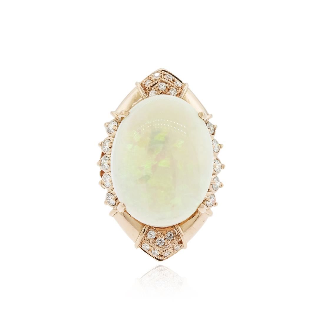 One electronically tested 14KT rose gold ladies cast opal and diamond ring with a bright polish finish. Identified with markings of "14K". Condition is new. Containing: One white opal that is cut in a oval shaped cabochon and is prong set, measuring 21.80 mm long x 16.77 mm wide, and 6.50 mm thick and the approximate weight is 14.82 carats. The opal has a somewhat bright, green only play of color (fire) in a flashfire pattern; a dome; a good cut; no inclusions; consistent in its brightness and pattern; and is somewhat directional. Twenty-Eight prong set round brilliant cut diamonds, measuring 2.10 - 1.30 x 1.02mm (depth est.) approximate total weight of 28 Stones = 0.50ct.. Clarity: SI-2 to I-1. Color: H - I, Cut is Good. Colored gemstones are presumed to have been subjected to commonly used enhancement processes. All diamonds and colored gemstones are graded in the mounting, unless otherwise stated.. Total Weight of Diamonds 0.50ct.. Total Weight of Opals 14.82ct.. Total Weight of Ring 12.70 grams. GGL Appraised at $5,225.00.