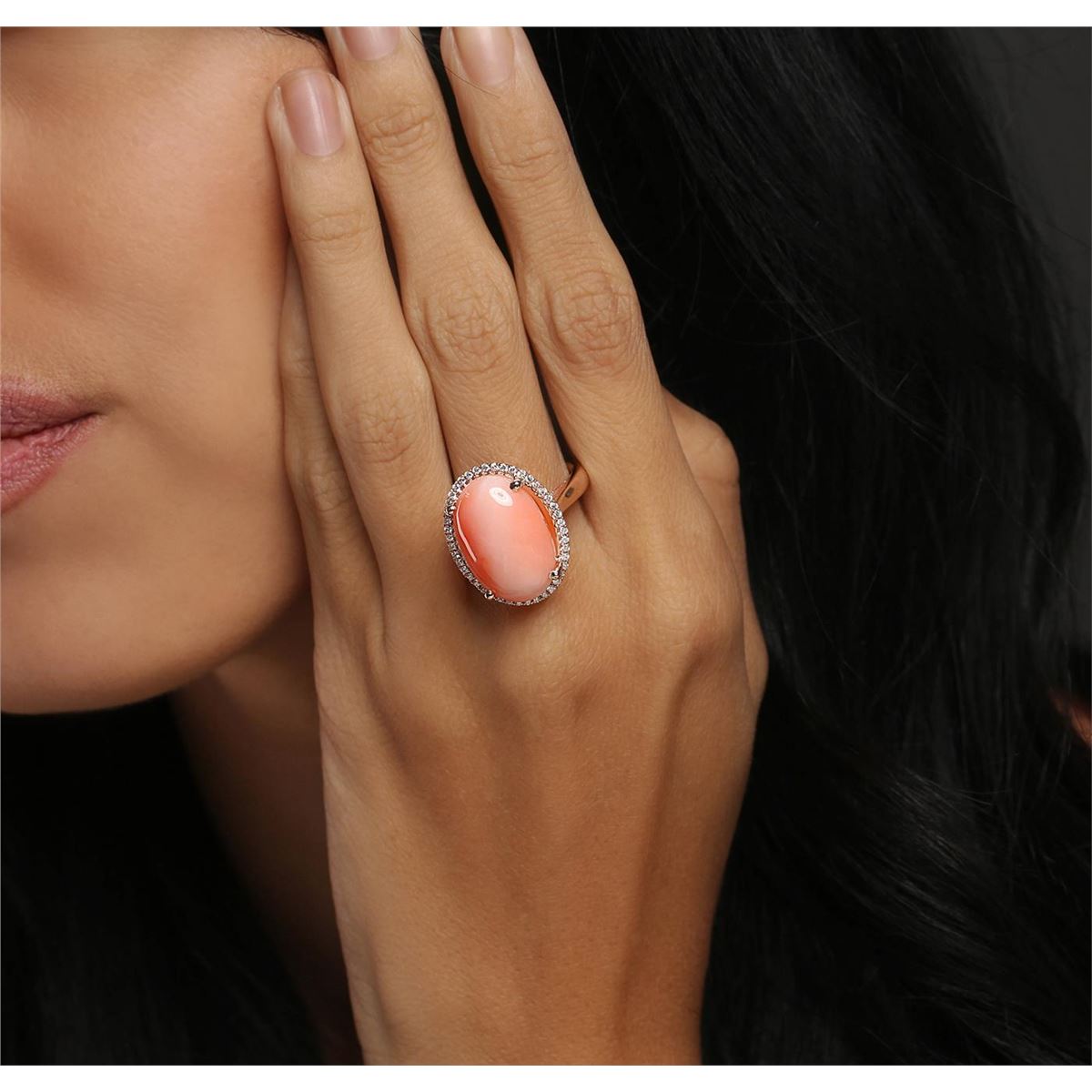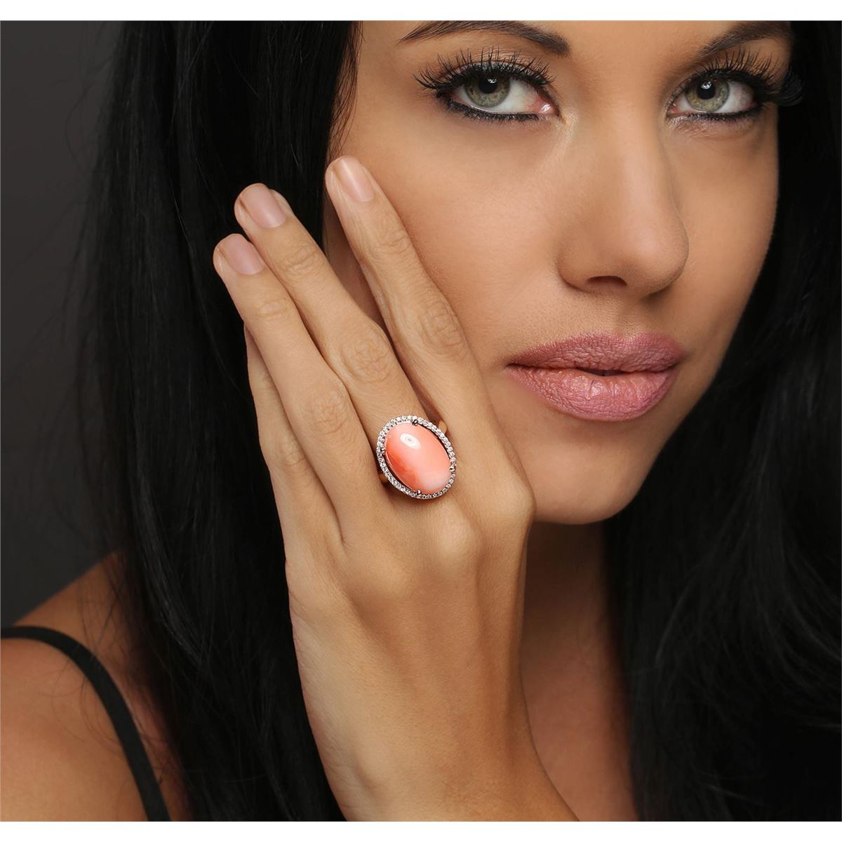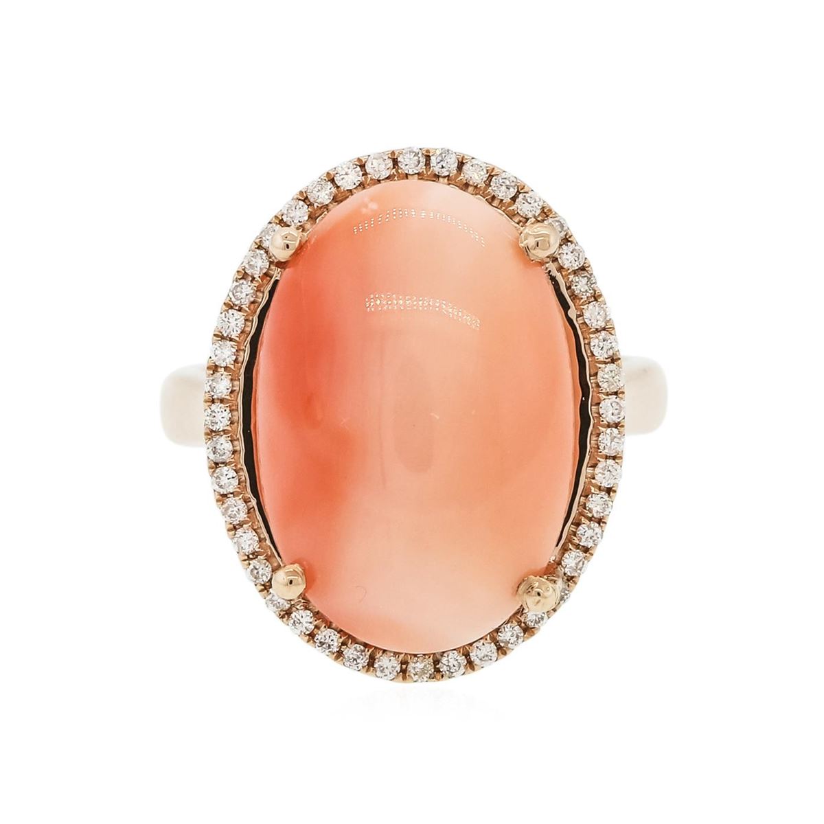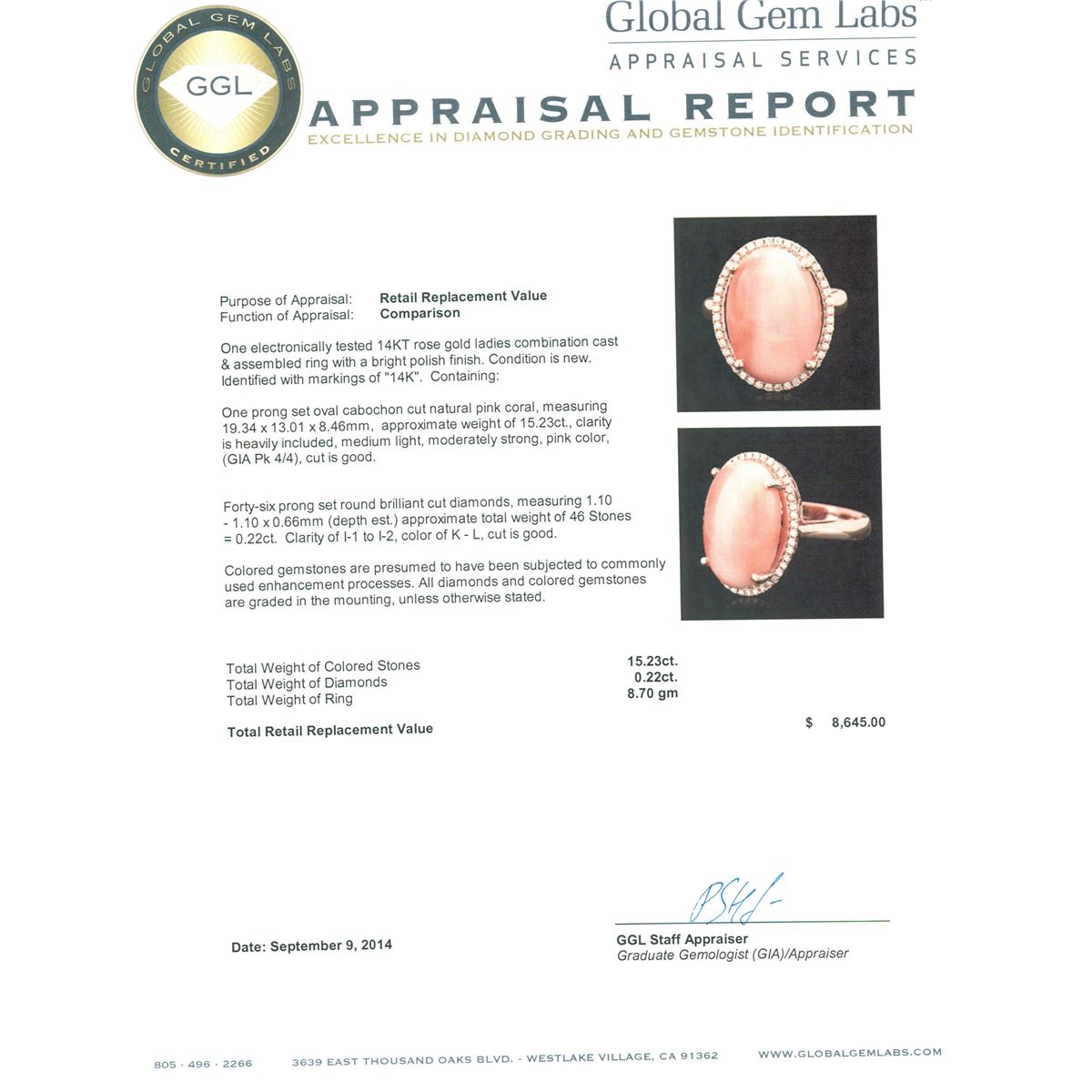 One electronically tested 14KT rose gold ladies combination cast & assembled ring with a bright polish finish. Identified with markings of "14K". Condition is new. Containing: One prong set oval cabochon cut natural pink coral, measuring 19.34 x 13.01 x 8.46mm, approximate weight of 15.23ct., clarity is heavily included, medium light, moderately strong, pink color, (GIA Pk 4/4), cut is good. Forty-Six prong set round brilliant cut diamonds, measuring 1.10 - 1.10 x 0.66mm (depth est.) approximate total weight of 46 Stones = 0.22ct. Clarity: I-1 to I-2. Color: K - L, Cut is Good. Colored gemstones are presumed to have been subjected to commonly used enhancement processes. All diamonds and colored gemstones are graded in the mounting, unless otherwise stated. Total Weight of Colored Stones 15.23ct. Total Weight of Diamonds 0.22ct. Total Weight of Ring 8.70 grams. GGL Appraised at $8,645.00.