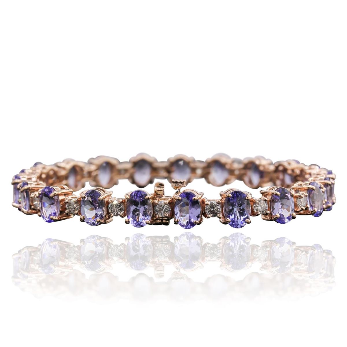 One electronically tested 14KT rose gold Ladies combination cast & assembled bracelet with a hidden box clasp with a bright polish finish. Condition is new. Measurements: 7" in length. Identified with markings of "14K". Containing: Twenty-one prong set oval modified brilliant cut natural tanzanites, measuring 6.86 x 5.25 x 2.89mm, approximate. Total Weight of 15.24ct., clarity is eye clean, type I, medium light, very slightly grayish, violet color, (GIA V 4/3), cut is very good. Colored gemstones are presumed to have been subjected to commonly used color/clarity enhancement processes. Twenty-One prong set round brilliant cut diamonds, measuring 3.00 - 3.00 x 1.80mm (depth est.) approximate. Total Weight of 21 Stones = 2.37ct. Clarity: I-2 to I-3. Color: H - I, Cut is Good. Total Weight of Colored Stones 15.24ct. Total Weight of Diamonds 2.37ct. Total Weight of Bracelet 18.90 grams. GGL Appraised at $24,735.00.