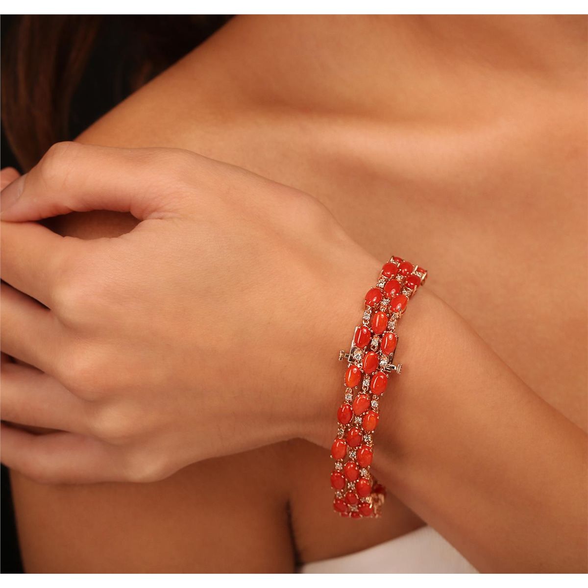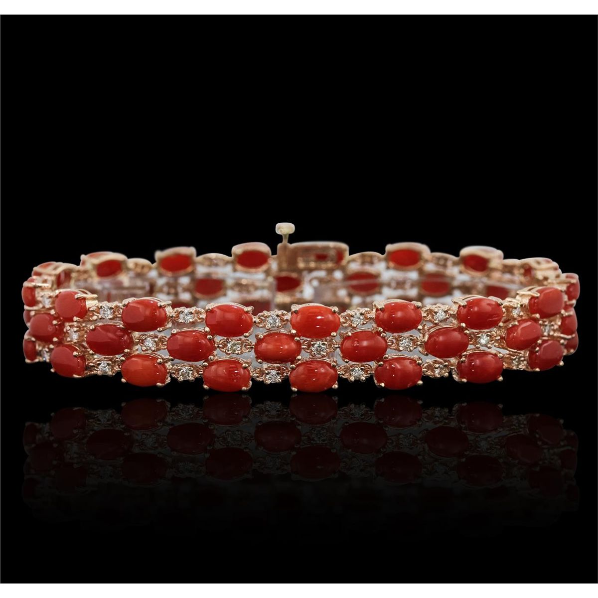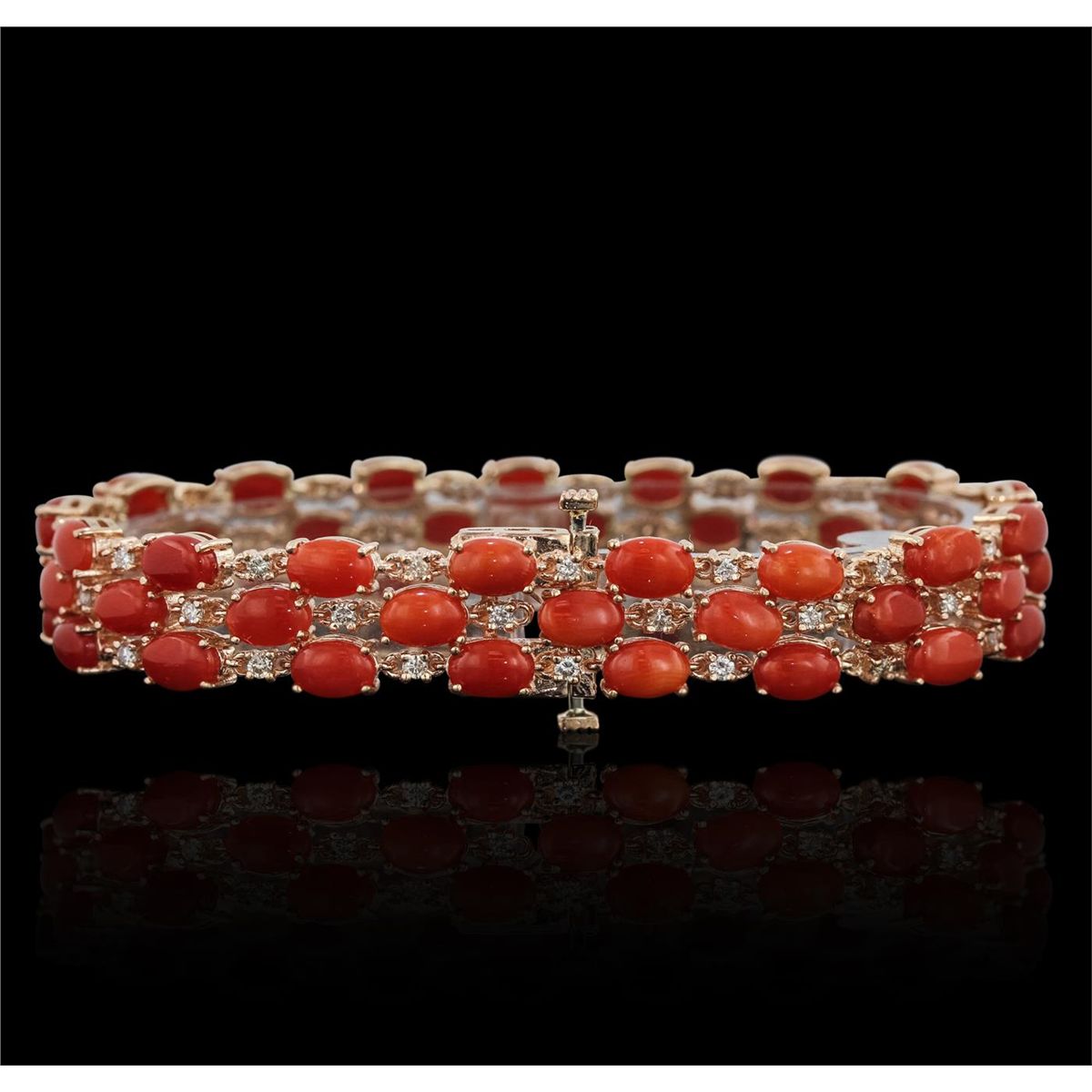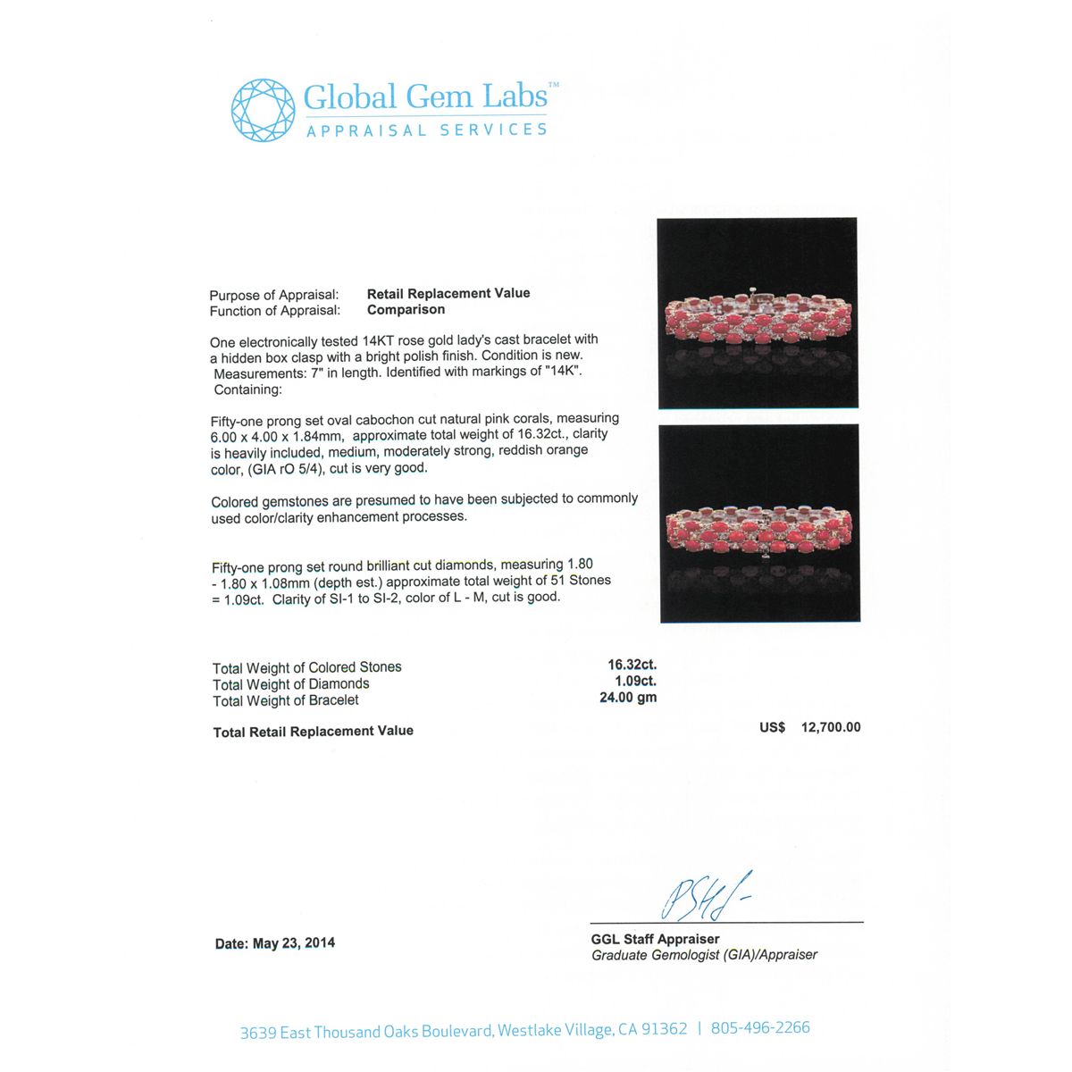 One electronically tested 14KT rose gold Ladies cast bracelet with a hidden box clasp with a bright polish finish. Condition is new. Measurements: 7" in length. Identified with markings of "14K". Containing: Fifty-one prong set oval cabochon cut natural pink corals, measuring 6.00 x 4.00 x 1.84mm, approximate. Total Weight of 16.32ct., clarity is heavily included, medium, moderately strong, reddish orange color, (GIA rO 5/4), cut is very good. Colored gemstones are presumed to have been subjected to commonly used color/clarity enhancement processes. Fifty-One prong set round brilliant cut diamonds, measuring 1.80 - 1.80 x 1.08mm (depth est.) approximate. Total Weight of 51 Stones = 1.09ct. Clarity: SI-1 to SI-2. Color: L - M, Cut is Good. Total Weight of Colored Stones 16.32ct. Total Weight of Diamonds 1.09ct. Total Weight of Bracelet 24.00 grams. GGL Appraised at $12,700.00.