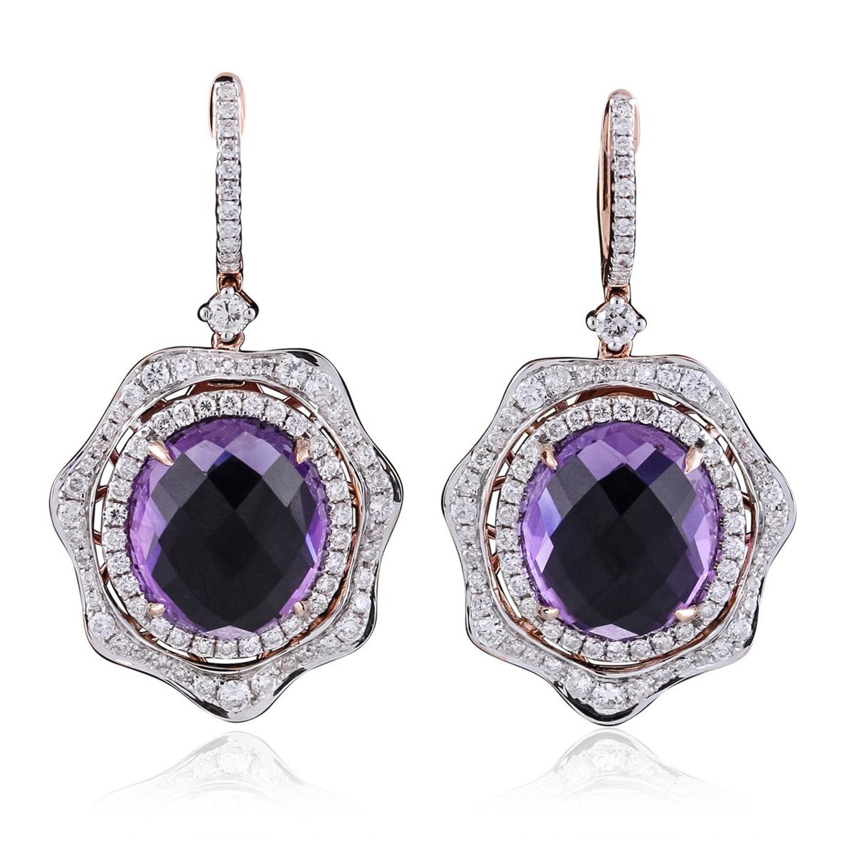 One pair of earrings featuring: 14KT rose gold with a total weight of 9.05 grams, (2) amethysts with a total weight of 16.33ctw, and (164) diamonds with a total weight of 1.88ctw.