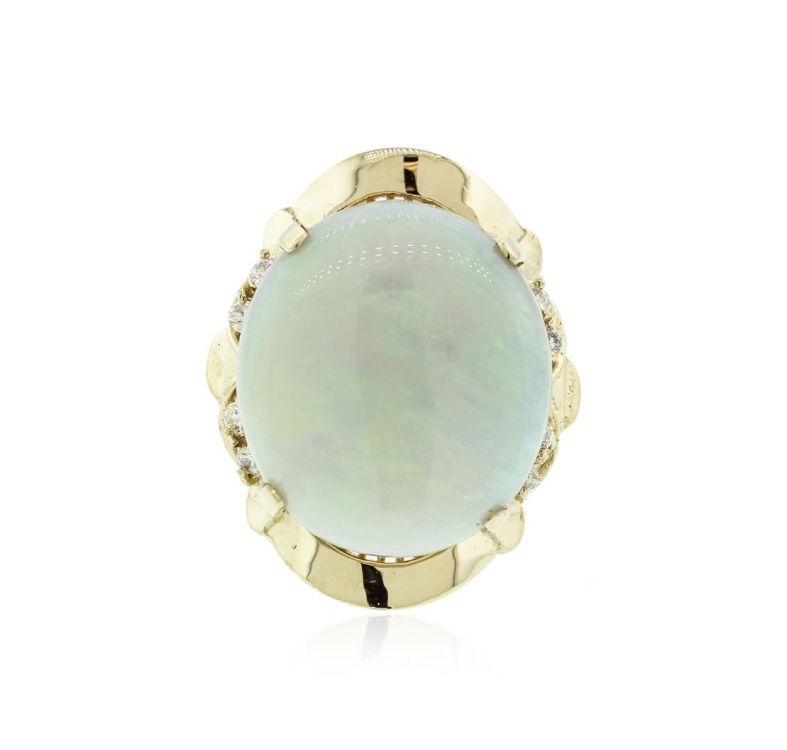 One electronically tested 14KT rose gold ladies cast opal and diamond ring with a bright polish finish. Identified with markings of "14K". Condition is new. Containing: Eight prong set round brilliant cut diamonds, measuring 2.00 - 2.00 x 1.20mm (depth est.) approximate total weight of 8 Stones = 0.23ct.. Clarity: SI-1 to SI-2. Color: I - J, Cut is Good. One white opal that is cut in a oval shaped cabochon and is prong set, measuring 21.52 mm long x 19.00 mm wide, and 6.50 mm thick and the approximate weight is 16.57 carats. The opal has a somewhat bright, green only play of color (fire) in a flashfire pattern; a dome; a good cut; no inclusions; consistent in its brightness and pattern; and is somewhat directional. Colored gemstones are presumed to have been subjected to commonly used enhancement processes. All diamonds and colored gemstones are graded in the mounting, unless otherwise stated.. Total Weight of Diamonds 0.23ct.. Total Weight of Opals 16.57ct.. Total Weight of Ring 13.00 grams. GGL Appraised at $4,855.00.