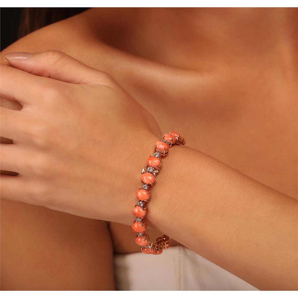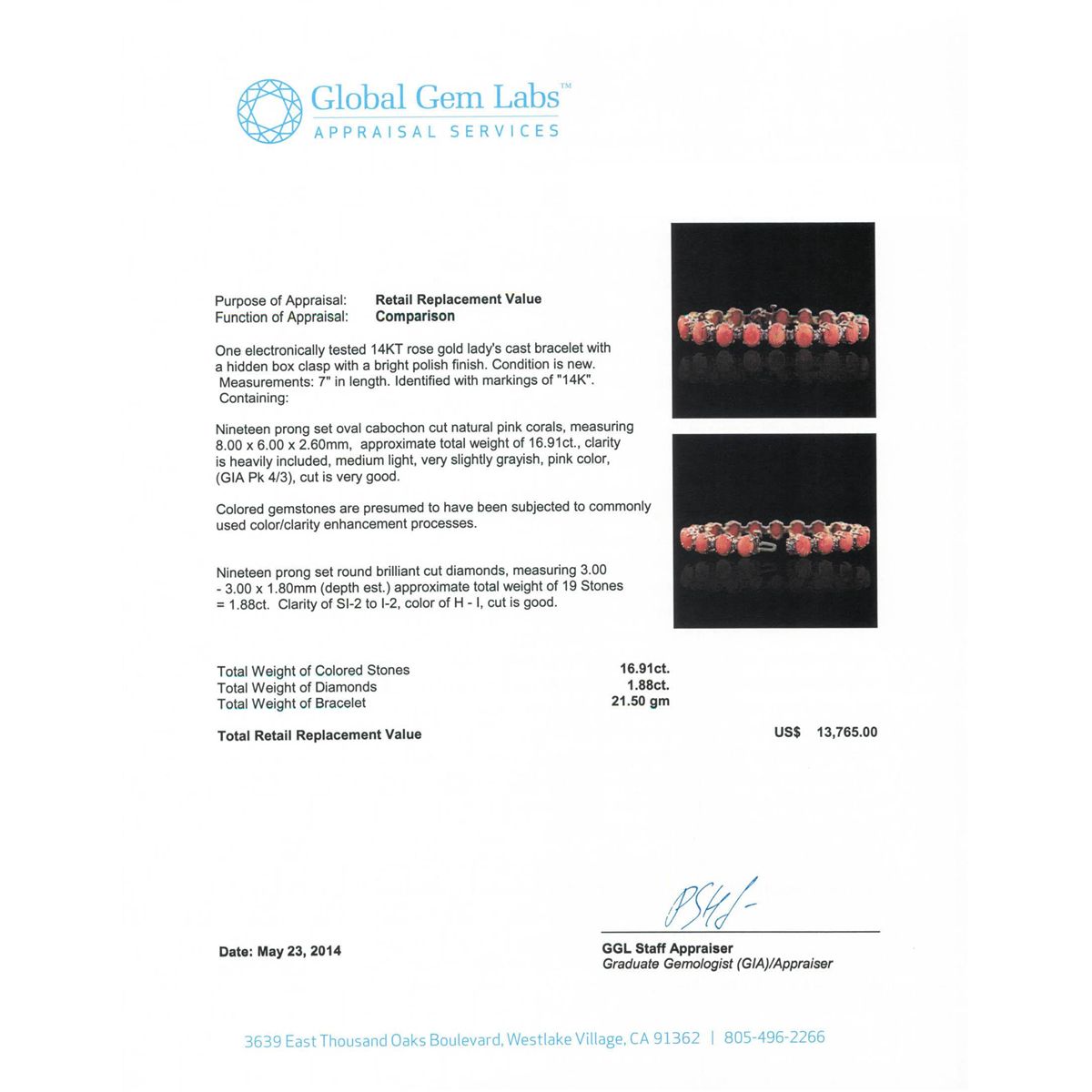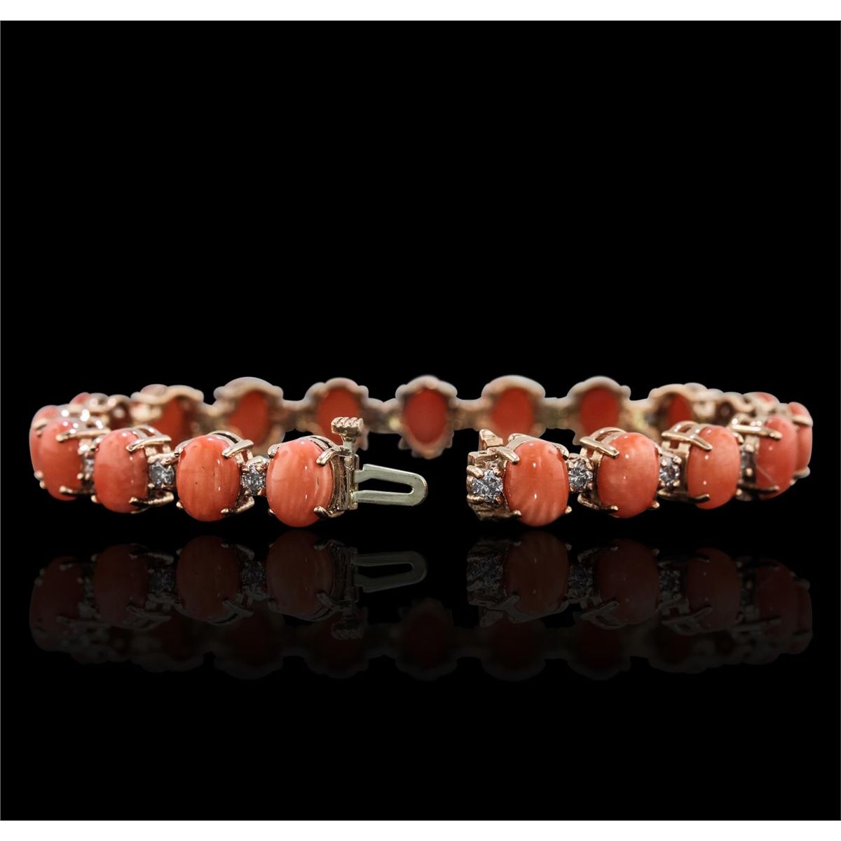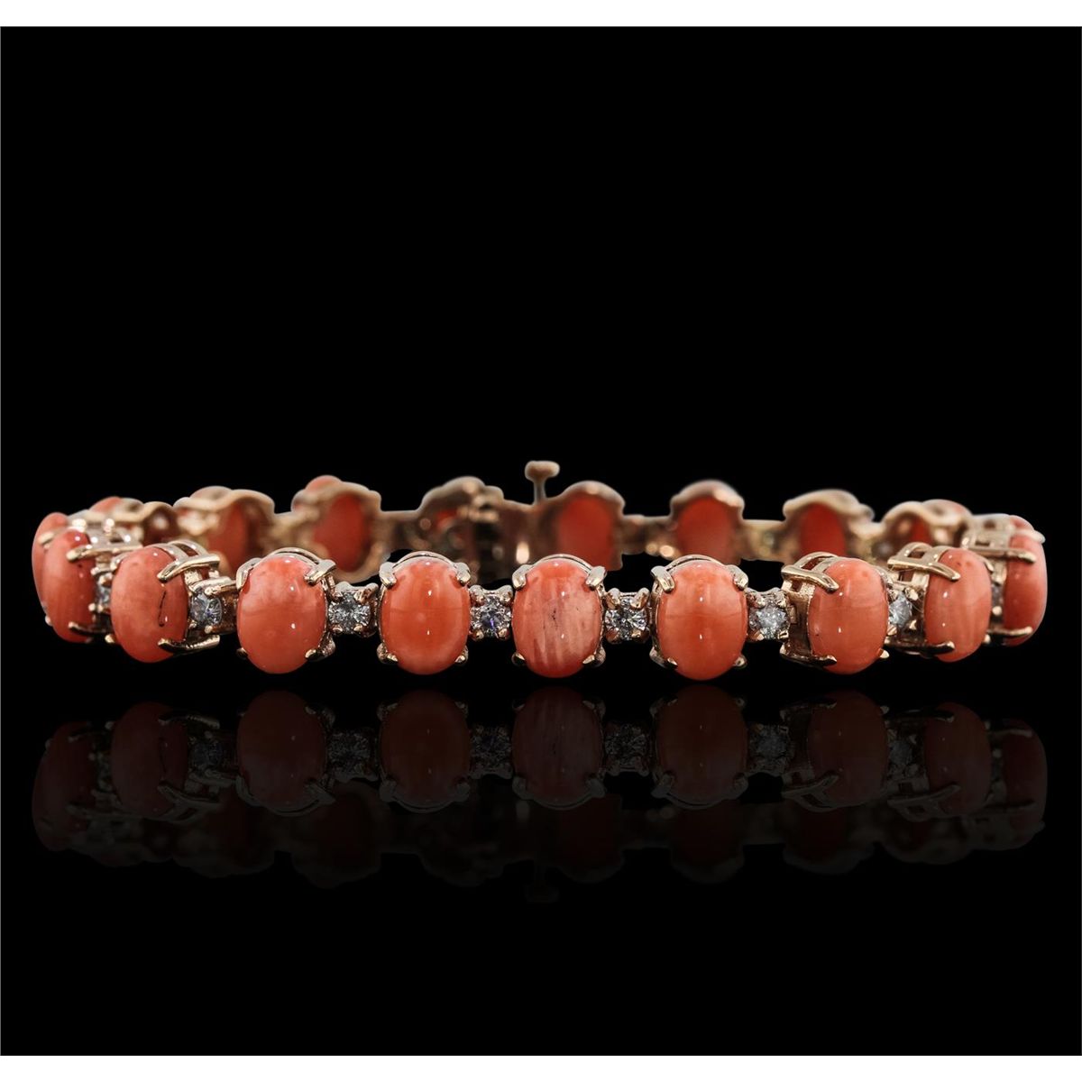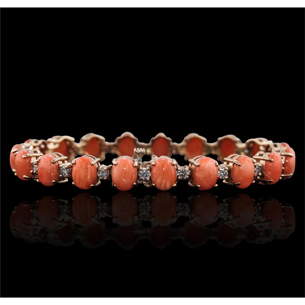 One electronically tested 14KT rose gold Ladies cast bracelet with a hidden box clasp with a bright polish finish. Condition is new. Measurements: 7" in length. Identified with markings of "14K". Containing: Nineteen prong set oval cabochon cut natural pink corals, measuring 8.00 x 6.00 x 2.60mm, approximate. Total Weight of 16.91ct., clarity is heavily included, medium light, very slightly grayish, pink color, (GIA Pk 4/3), cut is very good. Colored gemstones are presumed to have been subjected to commonly used color/clarity enhancement processes. Nineteen prong set round brilliant cut diamonds, measuring 3.00 - 3.00 x 1.80mm (depth est.) approximate. Total Weight of 19 Stones = 1.88ct. Clarity: SI-2 to I-2. Color: H - I, Cut is Good. Total Weight of Colored Stones 16.91ct. Total Weight of Diamonds 1.88ct. Total Weight of Bracelet 21.50 grams. GGL Appraised at $13,765.00.