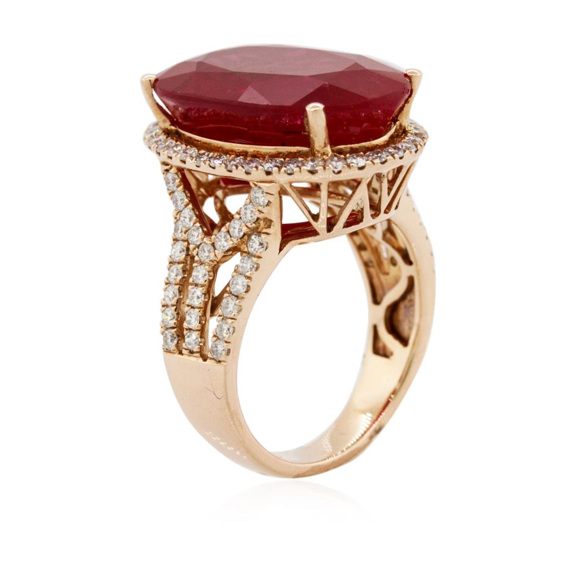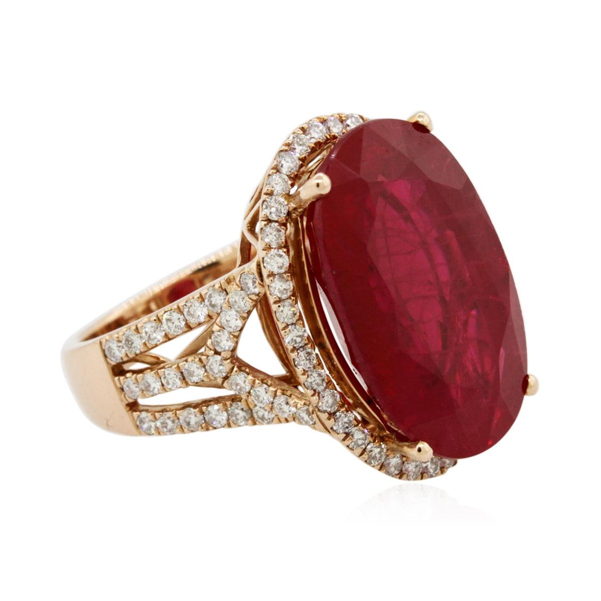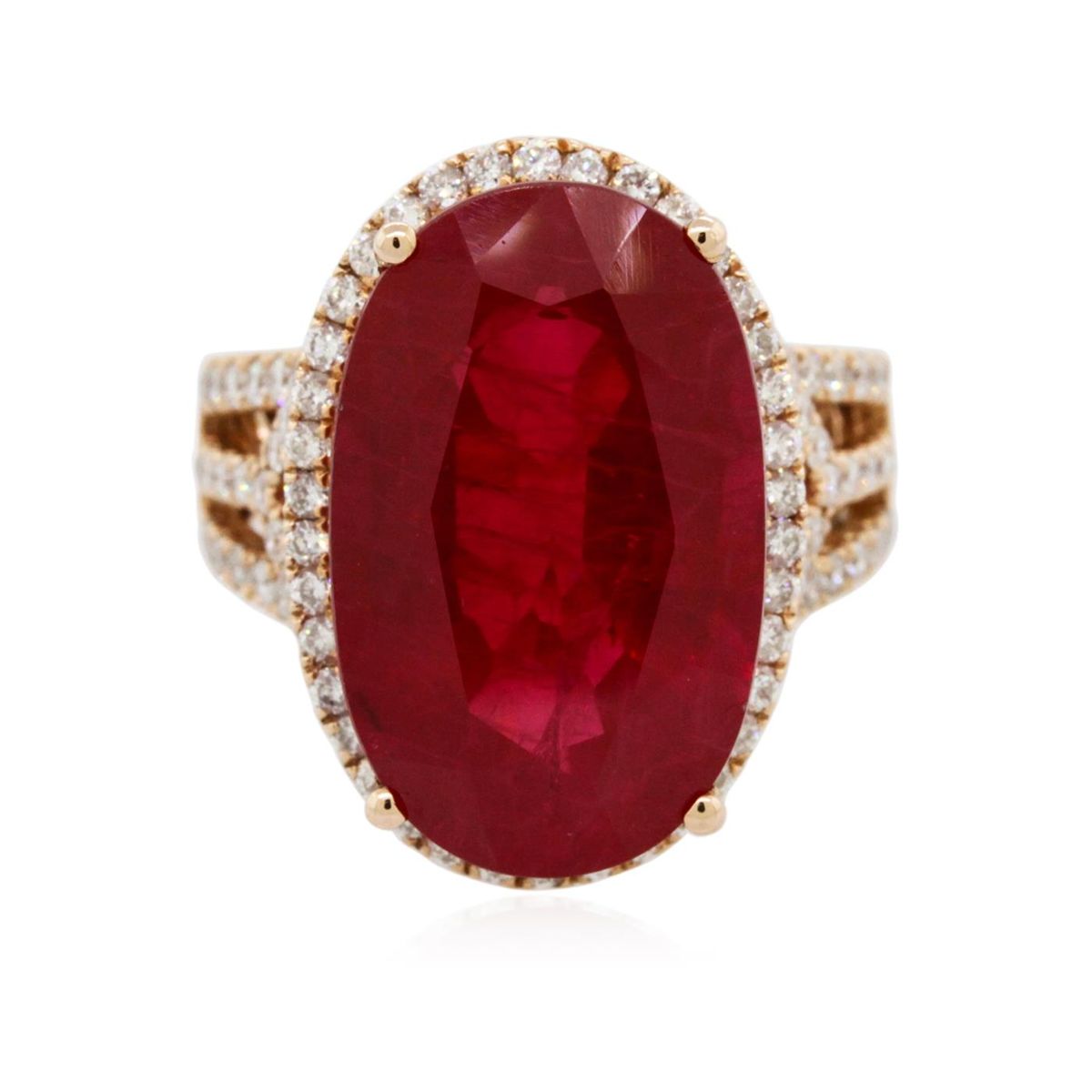 One electronically tested 14KT rose gold Ladies combination cast & assembled ring with a bright polish finish. Condition is new. Identified with markings of "14K". Containing: One prong set oval modified brilliant cut natural ruby, measuring 20.00 x 12.40 x 8.07mm, approximate weight of 16.94ct., clarity is heavily included, type II, medium, moderately strong, slightly purplish red color, (GIA slpR 5/4), cut is good. Colored gemstones are presumed to have been subjected to commonly used color/clarity enhancement processes. Eighty-Eight bead set round brilliant cut diamonds, measuring 1.30 - 1.30 x 0.78mm (depth est.) approximate. Total Weight of 88 Stones = 0.70ct. Clarity: I-1 to I-2. Color: I - J, Cut is Good. Total Weight of Colored Stones 16.94ct. Total Weight of Diamonds 0.70ct. Total Weight of Ring 10.50 grams. GGL Appraised at $10,360.00.