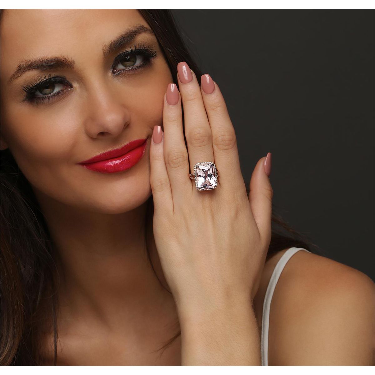One electronically tested 14KT rose gold ladies combination cast & assembled kunzite and diamond ring with a split shank with a bright polish finish. Identified with markings of "14K". Condition is new. Containing: One prong set radiant modified brilliant cut natural kunzite, measuring 17.83 x 13.19 x 9.52mm, approximate weight of 17.12ct., clarity is eye clean, type I, very light, slightly grayish, purple color, (GIA P 2/2), cut is very good. Seventy-Six prong set round brilliant cut diamonds, measuring 1.00 - 1.00 x 0.60mm (depth est.) approximate total weight of 76 Stones = 0.27ct. Clarity: I-1 to I-2. Color: I - J, Cut is Good. Colored gemstones are presumed to have been subjected to commonly used enhancement processes. All diamonds and colored gemstones are graded in the mounting, unless otherwise stated. Total Weight of Colored Stones 17.12ct. Total Weight of Diamonds 0.27ct. Total Weight of Ring 11.00 grams. GGL Appraised at $7,085.00.