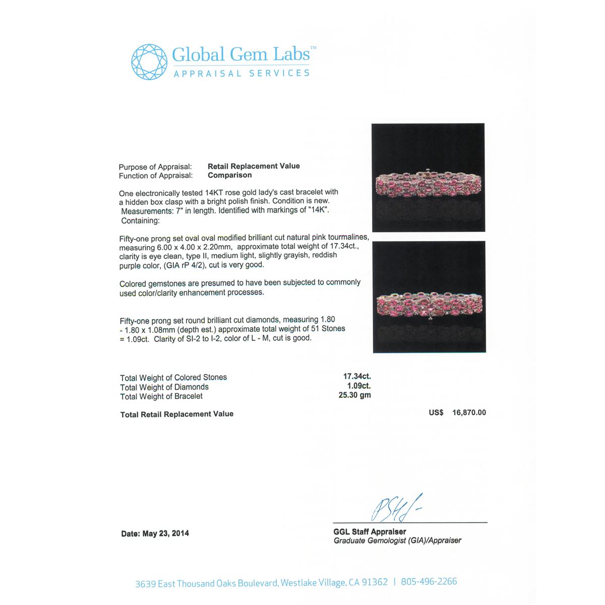 One electronically tested 14KT rose gold Ladies cast bracelet with a hidden box clasp with a bright polish finish. Condition is new. Measurements: 7" in length. Identified with markings of "14K". Containing: Fifty-one prong set oval modified brilliant cut natural pink tourmalines, measuring 6.00 x 4.00 x 2.20mm, approximate. Total Weight of 17.34ct., clarity is eye clean, type II, medium light, slightly grayish, reddish purple color, (GIA rP 4/2), cut is very good. Colored gemstones are presumed to have been subjected to commonly used color/clarity enhancement processes. Fifty-One prong set round brilliant cut diamonds, measuring 1.80 - 1.80 x 1.08mm (depth est.) approximate. Total Weight of 51 Stones = 1.09ct. Clarity: SI-2 to I-2. Color: L - M, Cut is Good. Total Weight of Colored Stones 17.34ct. Total Weight of Diamonds 1.09ct. Total Weight of Bracelet 25.30 grams. GGL Appraised at $16,870.00.