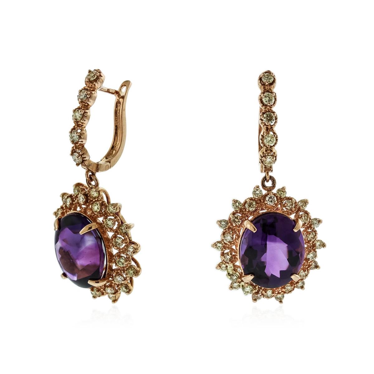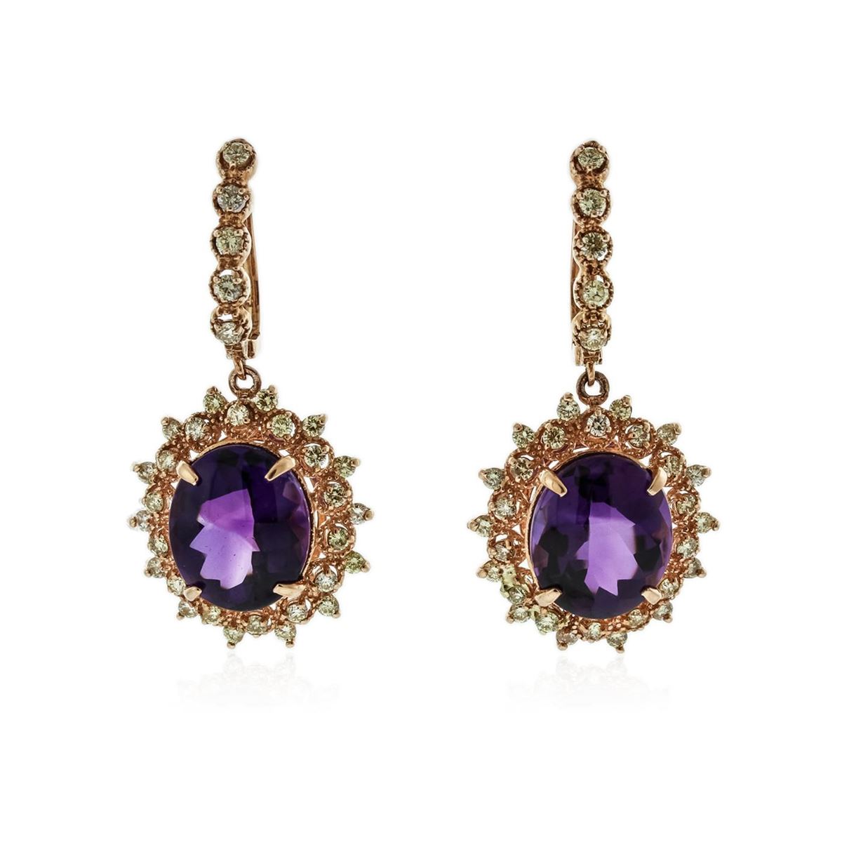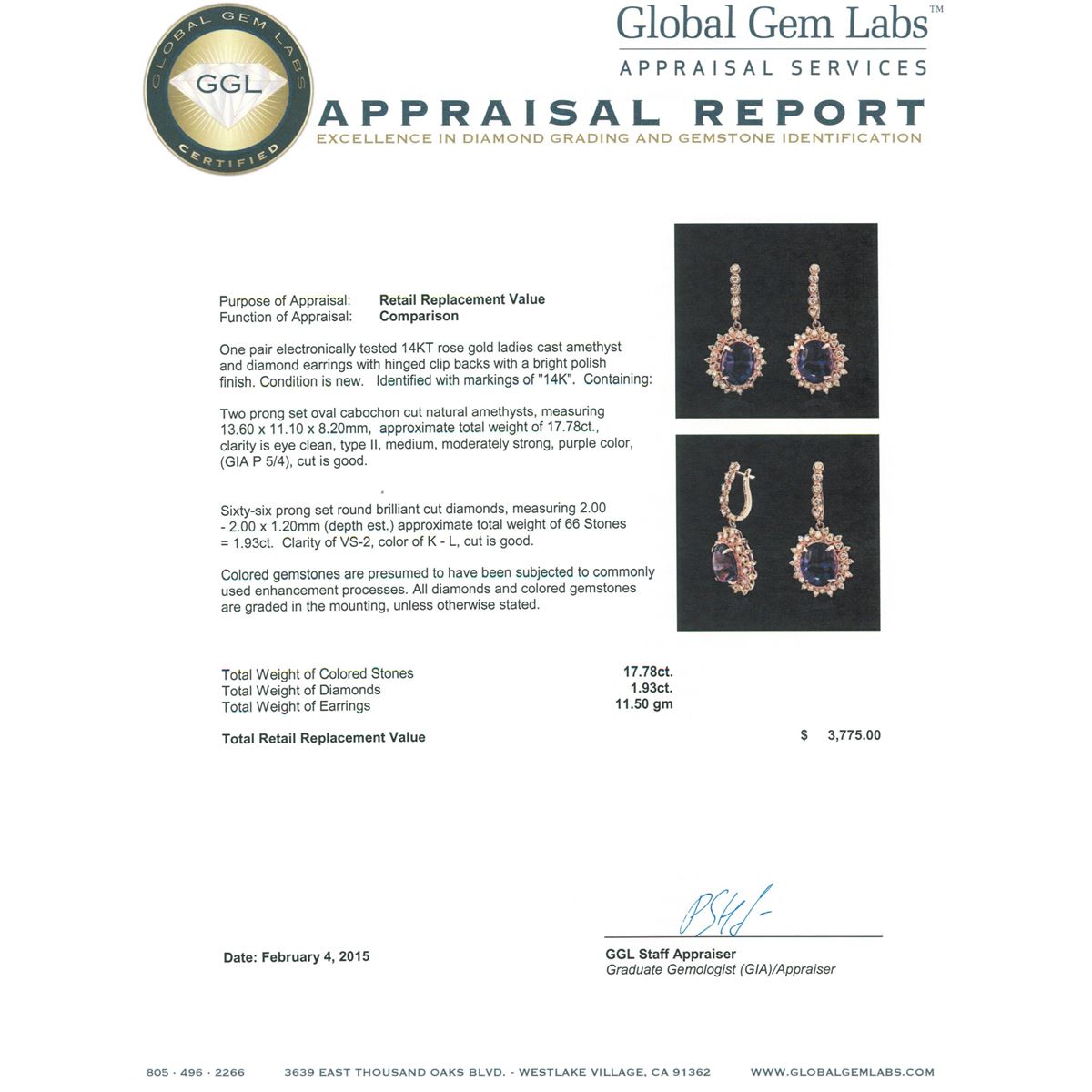 One pair electronically tested 14KT rose gold ladies cast amethyst and diamond earrings with hinged clip backs with a bright polish finish. Identified with markings of "14K". Condition is new. Containing: Two prong set oval cabochon cut natural amethysts, measuring 13.60 x 11.10 x 8.20mm, approximate total weight of 17.78ct., clarity is eye clean, type II, medium, moderately strong, purple color, (GIA P 5/4), cut is good. Sixty-Six prong set round brilliant cut diamonds, measuring 2.00. - 2.00. x 1.20mm (depth est.) approximate total weight of 66 Stones = 1.93ct. Clarity: VS-2. Color: K - L, Cut is Good. Colored gemstones are presumed to have been subjected to commonly used enhancement processes. All diamonds and colored gemstones are graded in the mounting, unless otherwise stated. Total Weight of Colored Stones 17.78ct. Total Weight of Diamonds 1.93ct. Total Weight of Earrings 11.50 grams. GGL Appraised at $3,775.00.