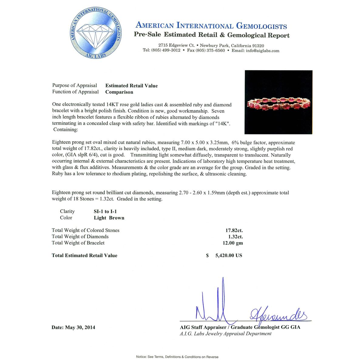 One electronically tested 14KT rose gold ladies cast & assembled ruby and diamond bracelet with a bright polish finish. Condition is new, good workmanship. Seven inch length bracelet features a flexible ribbon of rubies alternated by diamonds terminating in a concealed clasp with safety bar. Identified with markings of "14K". Containing: Eighteen prong set oval mixed cut natural rubies, measuring 7.00 x 5.00 x 3.25mm, 6%. bulge factor, approximate. Total Weight of 17.82ct., clarity is heavily included, type II, medium dark, moderately strong, slightly purplish red color, (GIA slpR 6/4), cut is good. Transmitting light somewhat diffusely, transparent to translucent. Naturally occurring internal & external characteristics are present. Indications of laboratory high temperature heat treatment, with glass & flux additives. Measurements & the color grade are an average for the group. Graded in the setting. Ruby has a low tolerance to rhodium plating, repolishing the surface, & ultrasonic cleaning. Eighteen prong set round brilliant cut diamonds, measuring 2.70 - 2.60 x 1.59mm (depth est.) approximate. Total Weight of 18 Stones = 1.32ct. Graded in the setting. Clarity: SI-1 to I-1. Total Weight of Colored Stones 17.82ct. Total Weight of Diamonds 1.32ct. Total Weight of Bracelet 12.00 grams. AIG Appraised at $5,420.00.